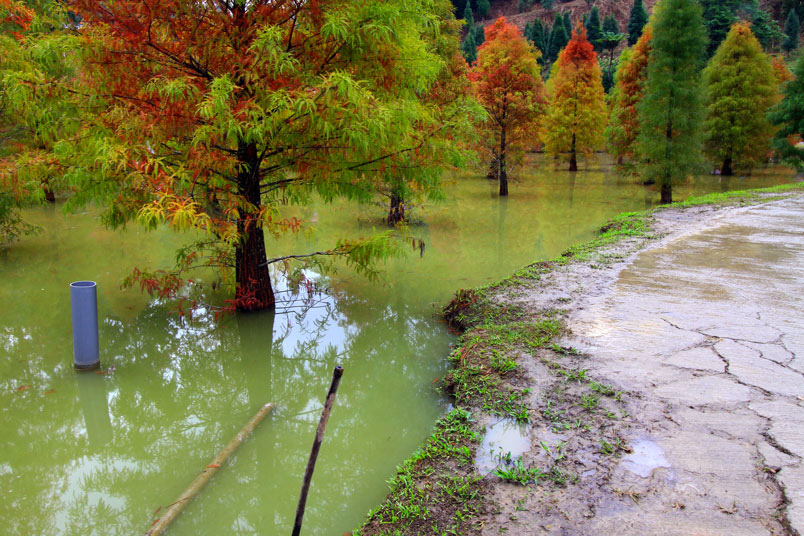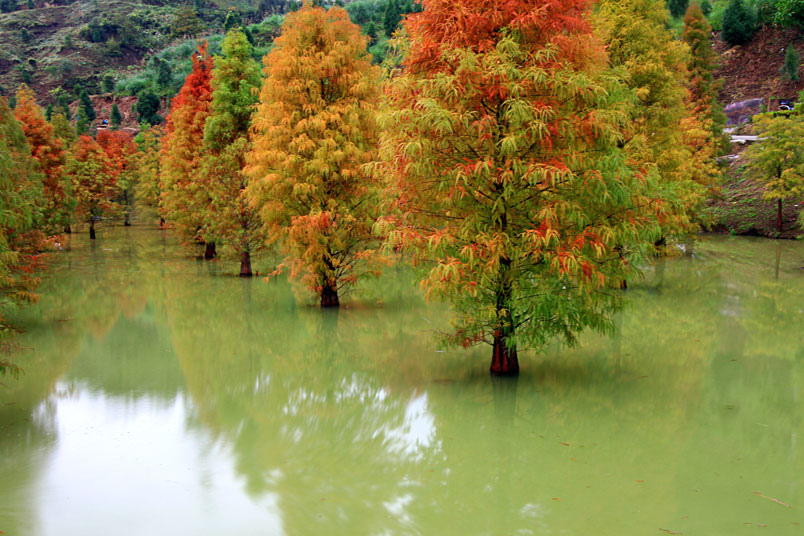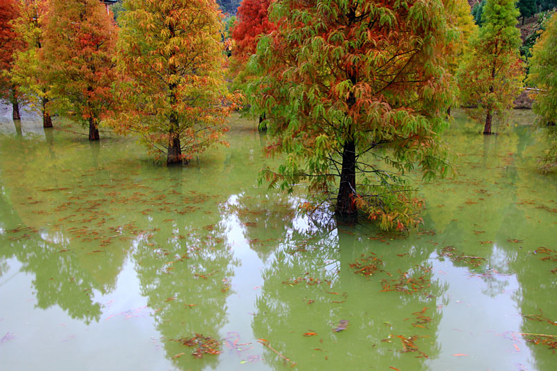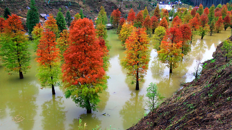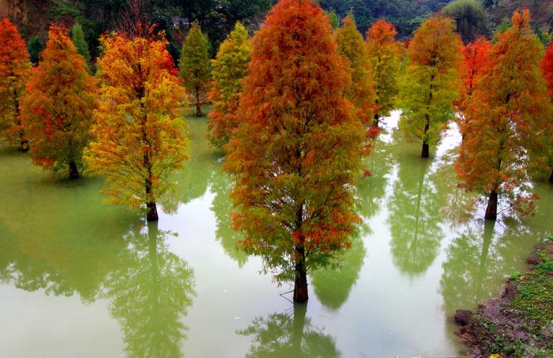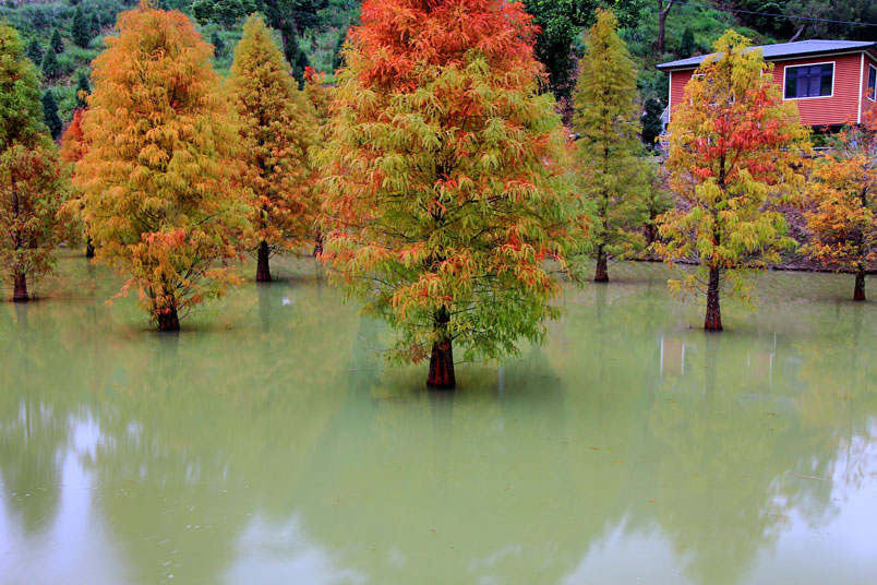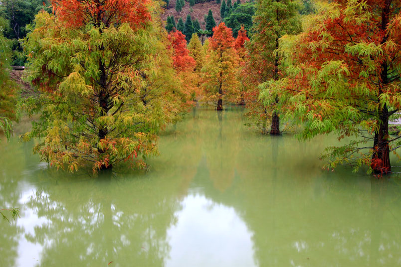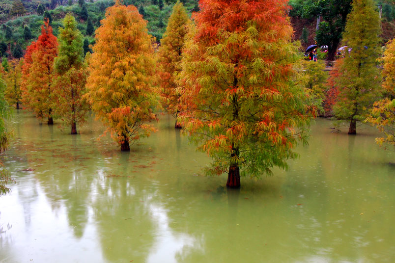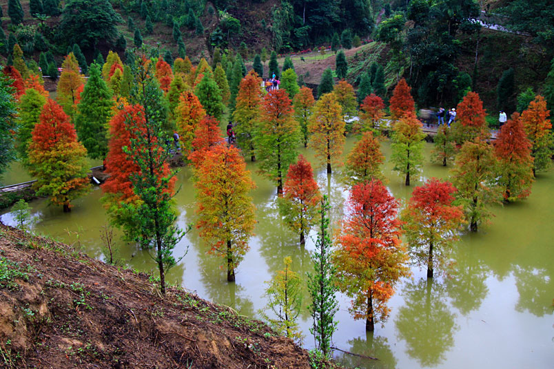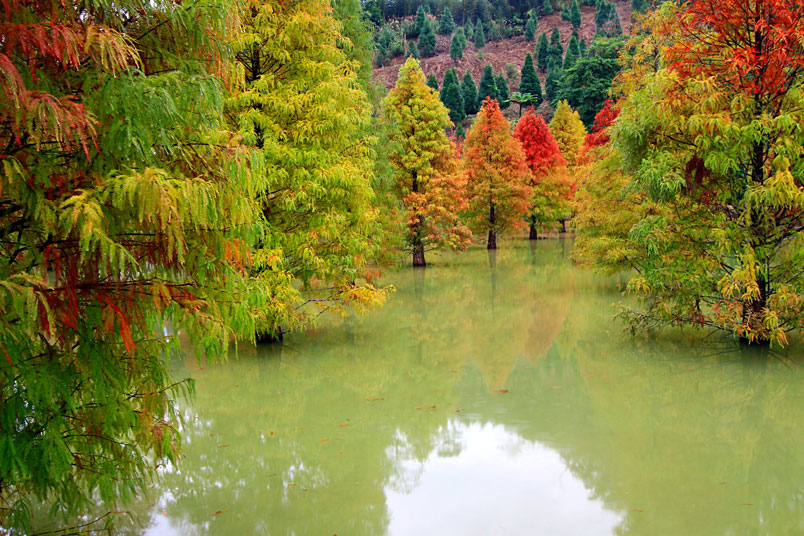 落羽松林紅、黃、綠色參雜,色彩繽紛,讓每位慕名而來的遊客