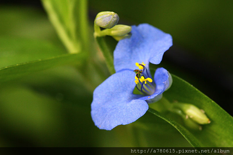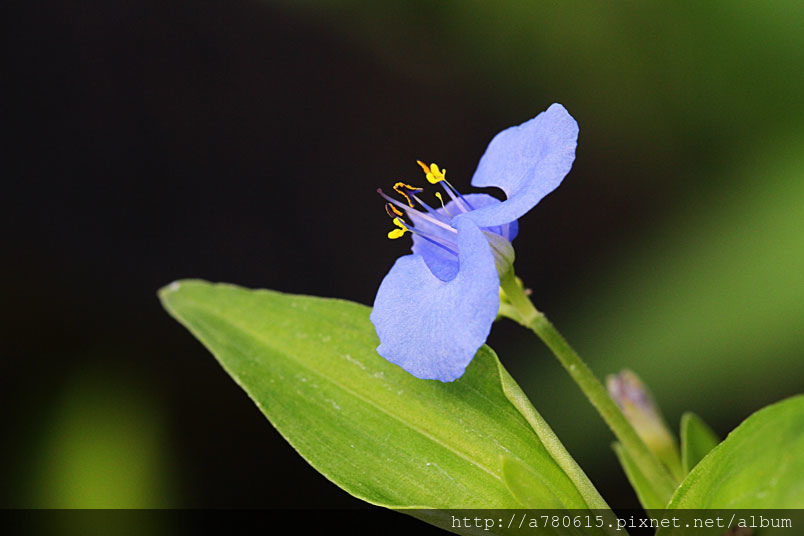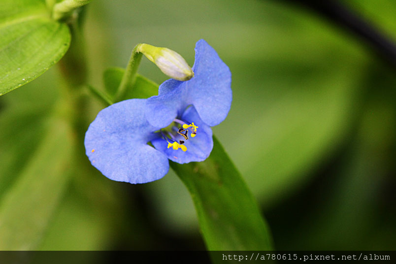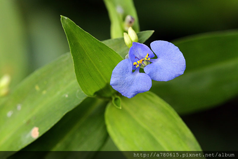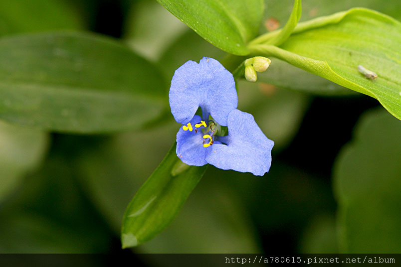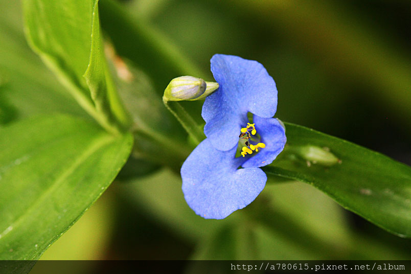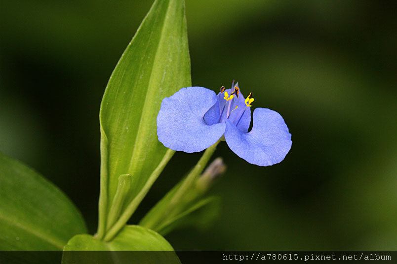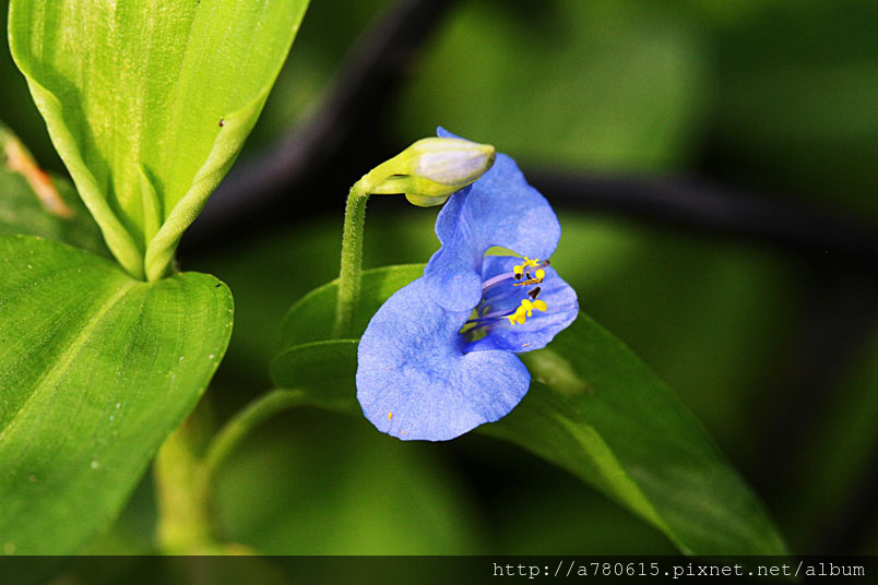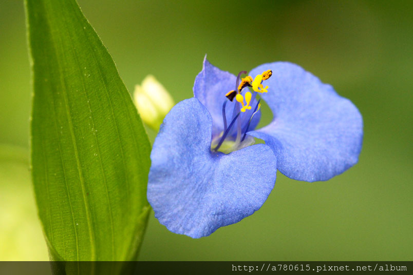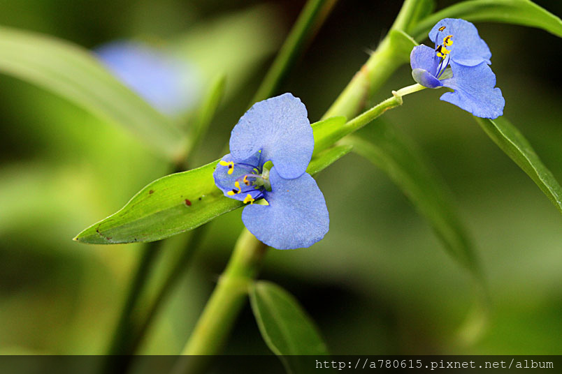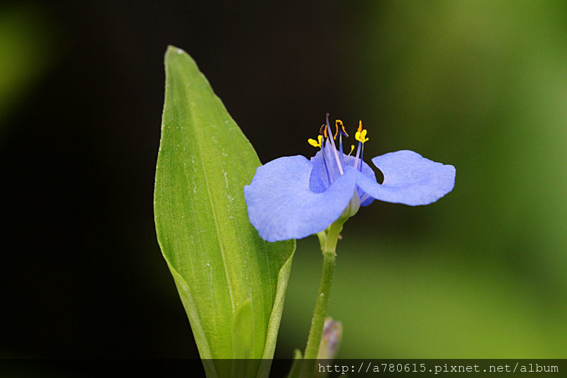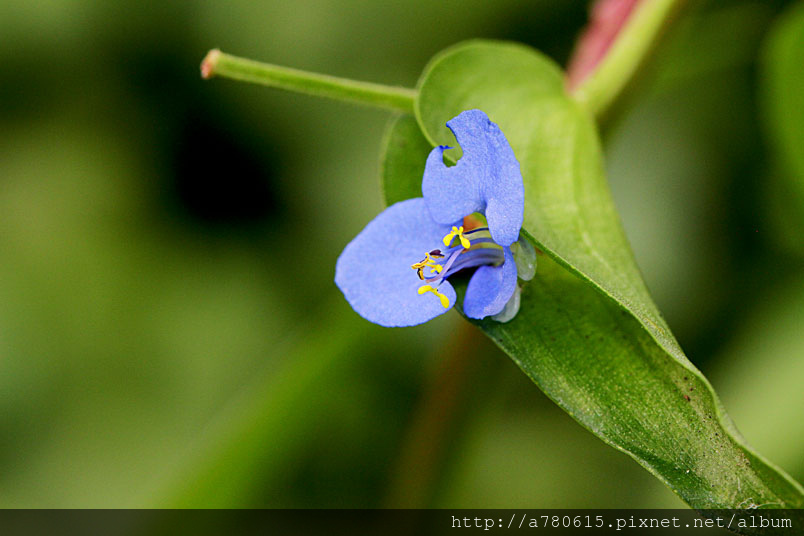 有2~5朵花,花萼3枚綠色,兩型,花瓣藍色,3片,有兩種形狀,位