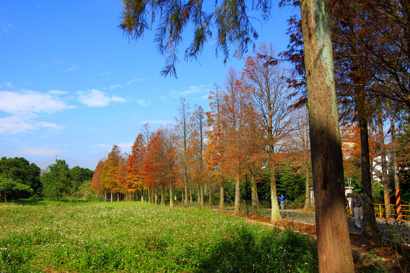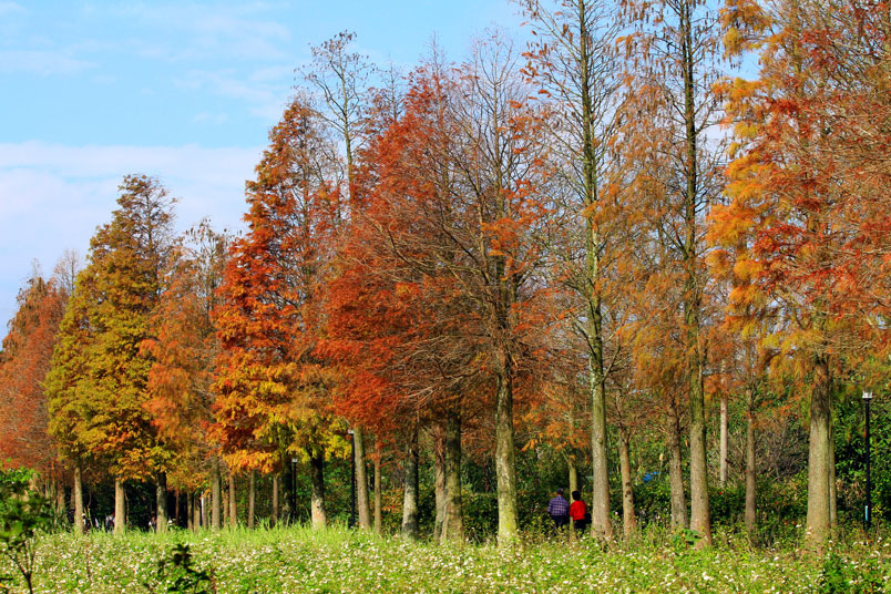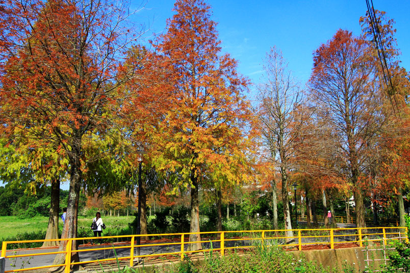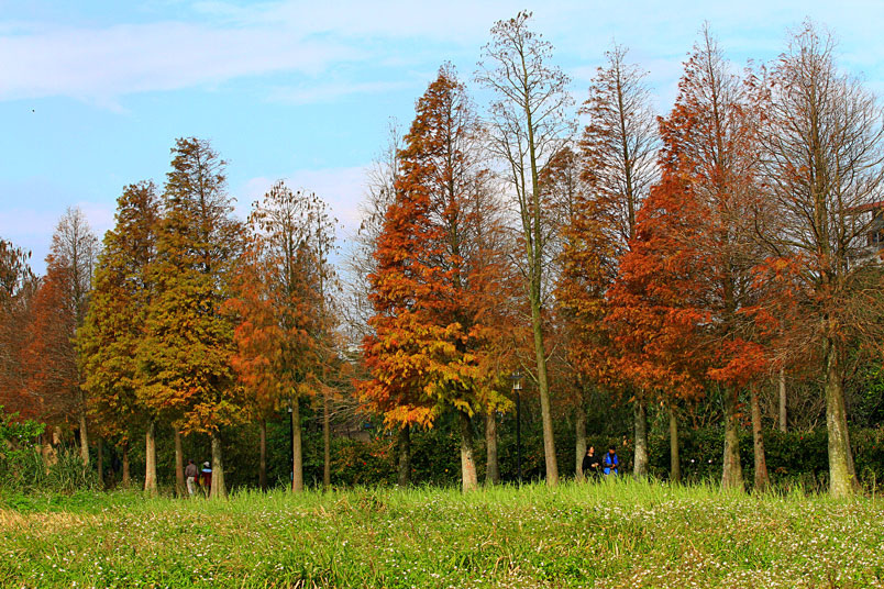 整齊的落羽松,橙黃、艷紅的漸層色彩,加上藍天白雲,有如印象