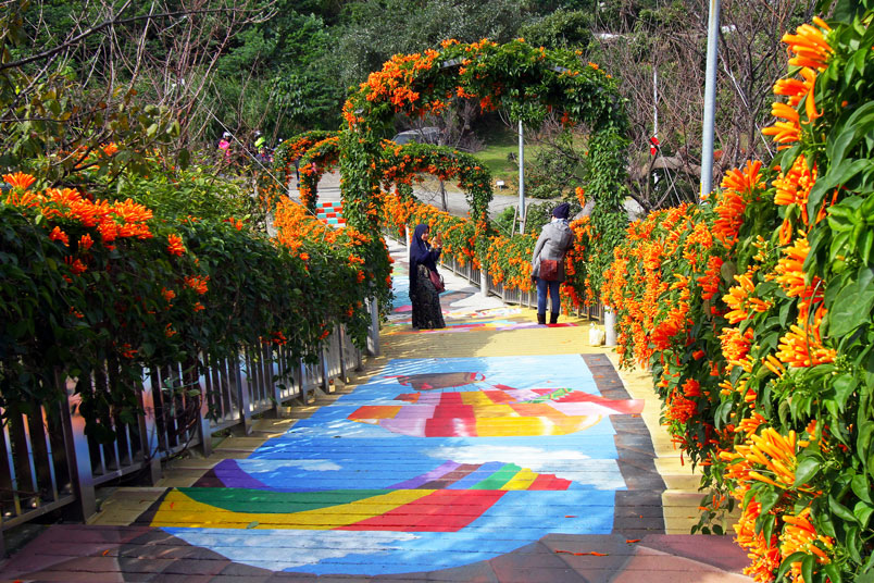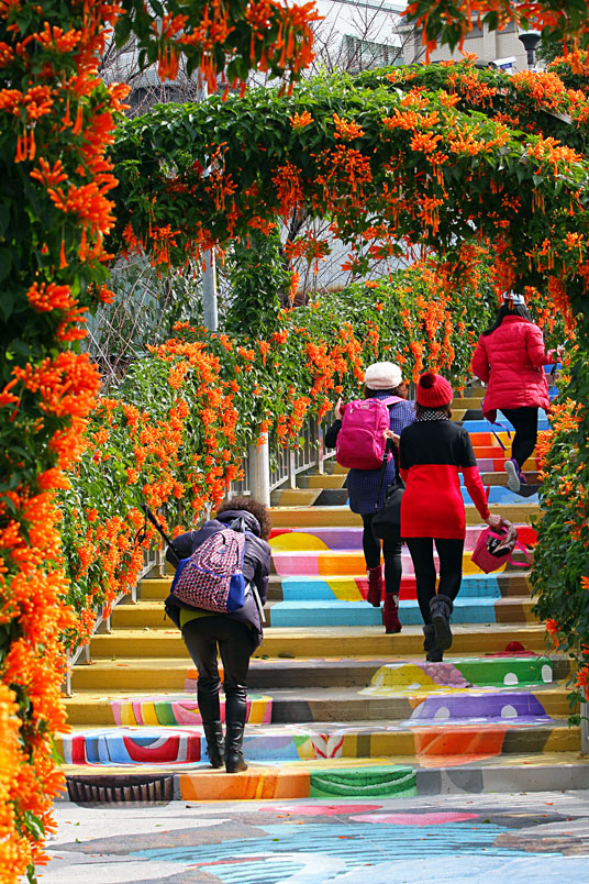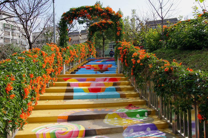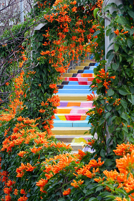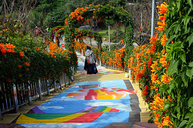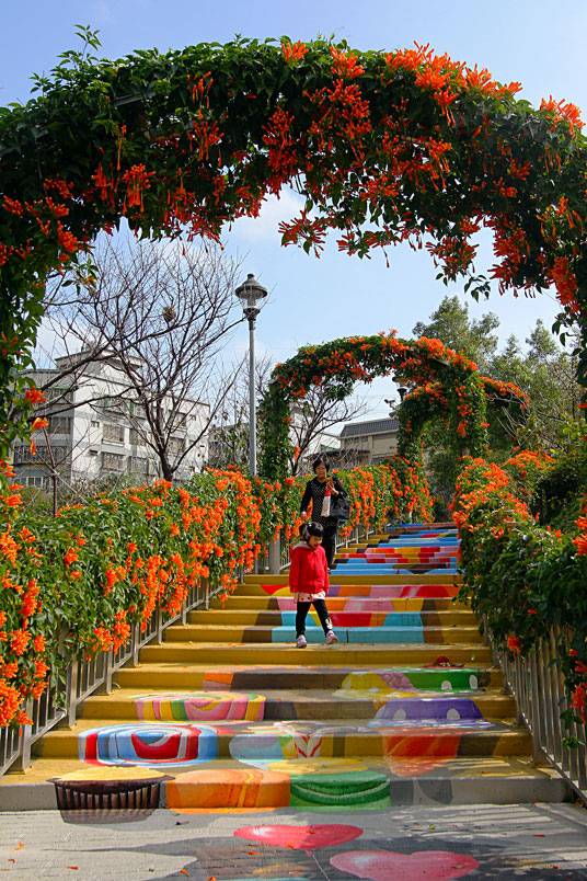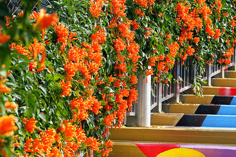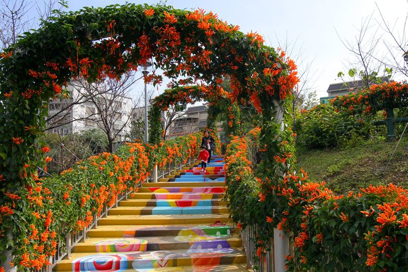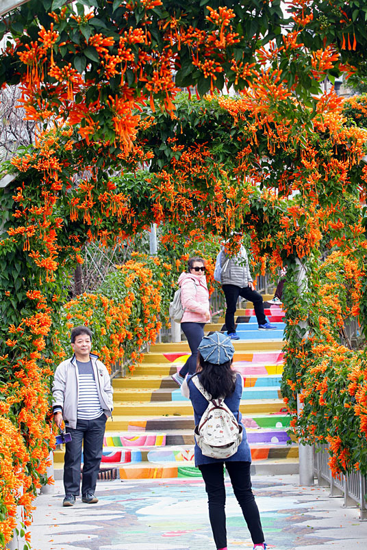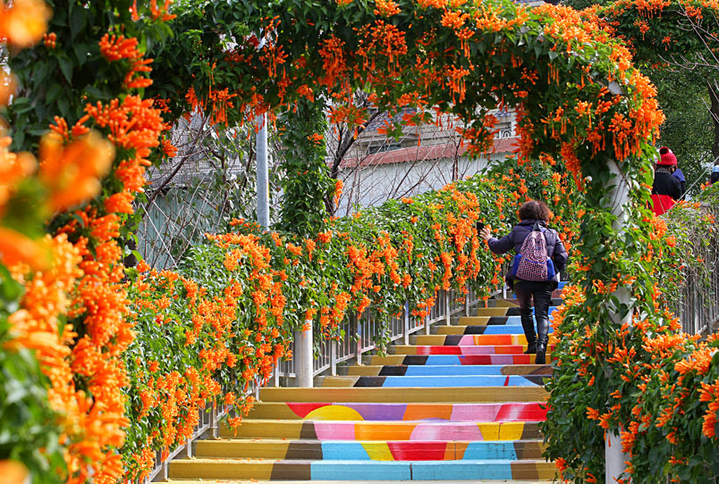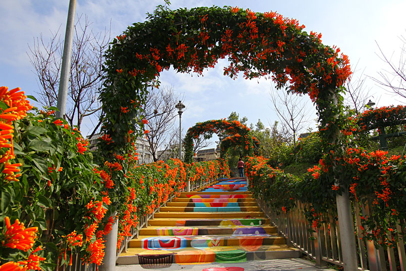 繪階梯,與盛開的炮仗花相映襯,當陽光輕輕灑落之際,炮仗花更