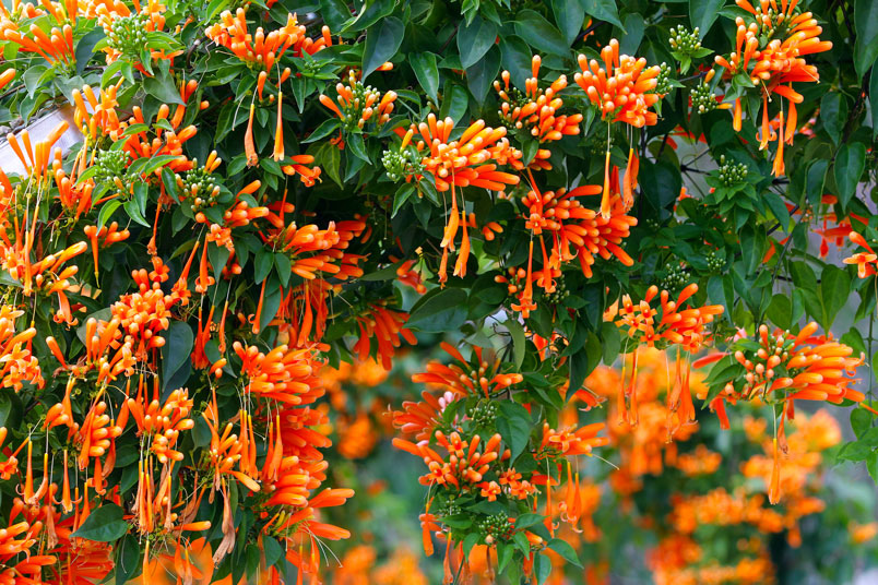 炮仗花別名黃鱔藤、黃金珊瑚、三爪花、炮仗紅,原產於巴西,屬