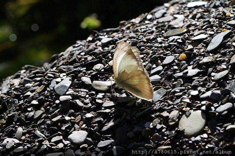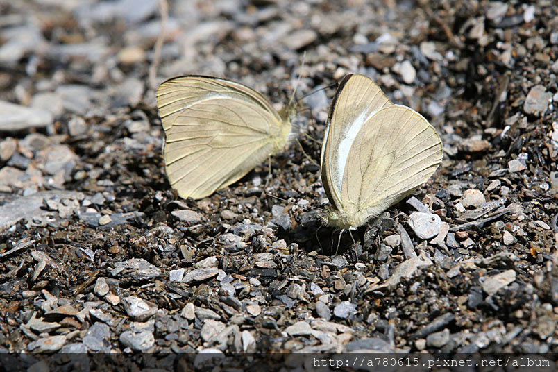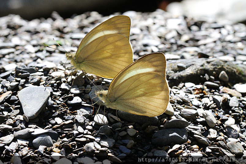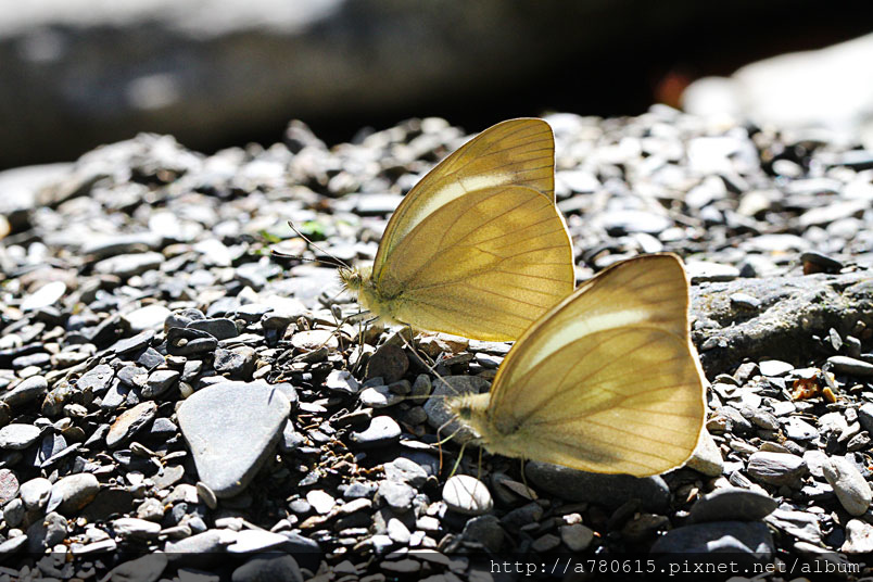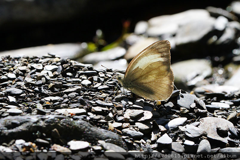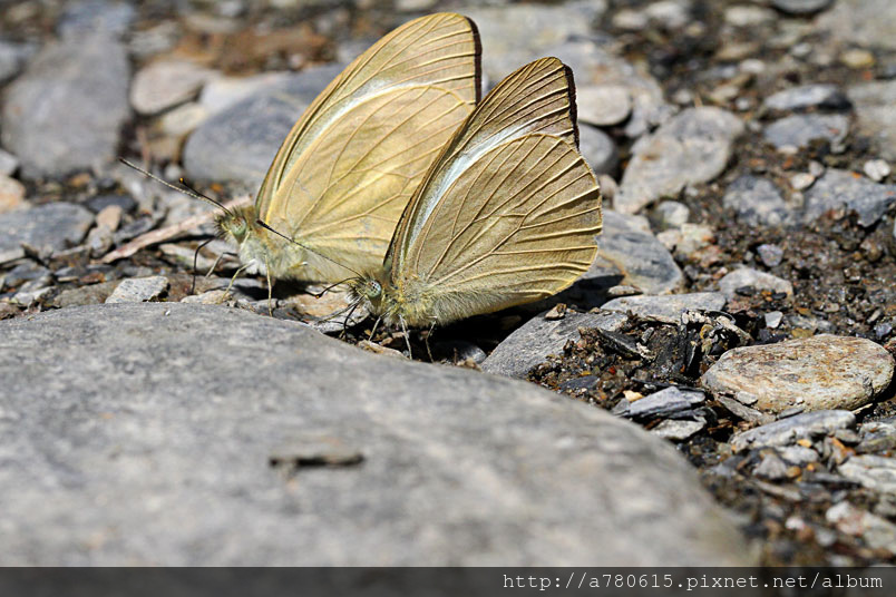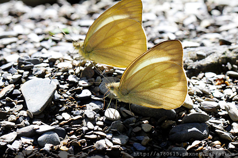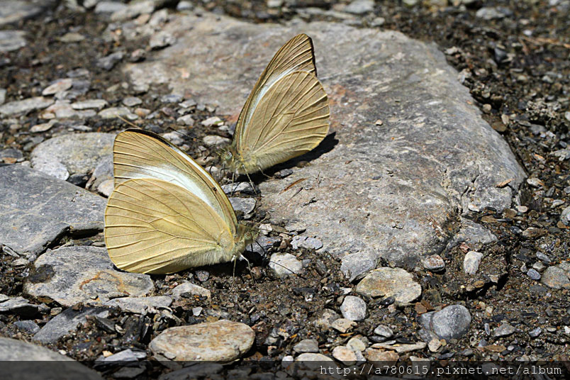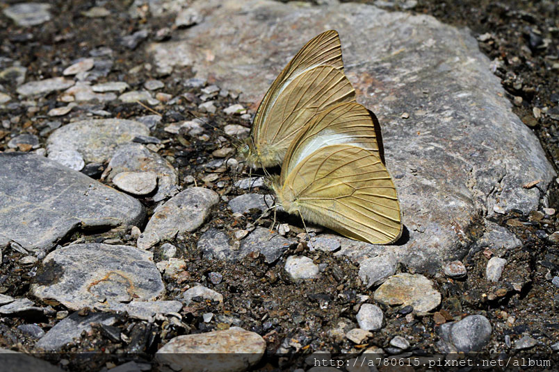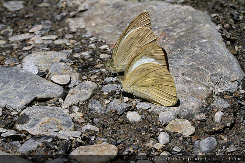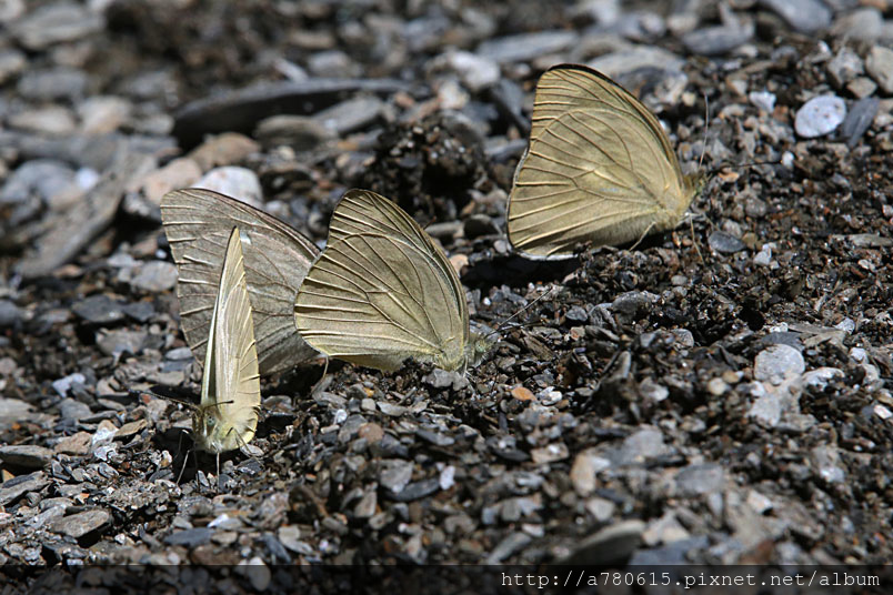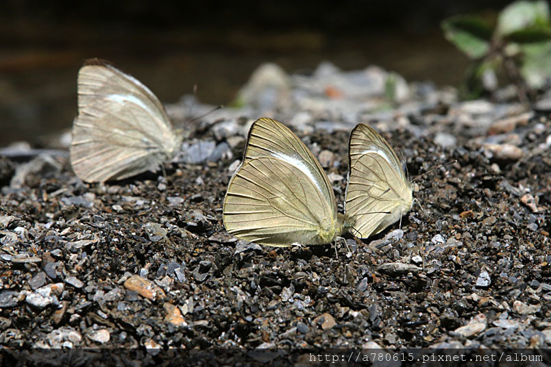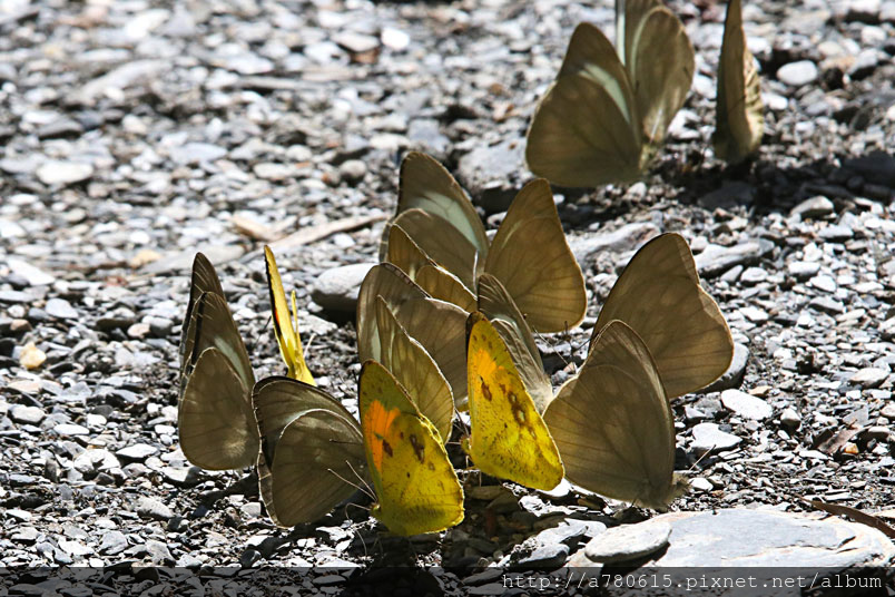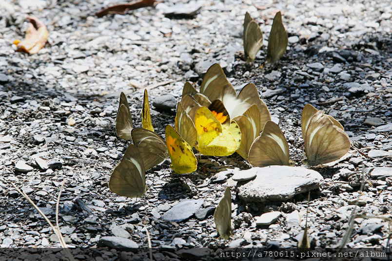 淡紫粉蝶與雌白黃蝶群聚在南山溪畔吸水。