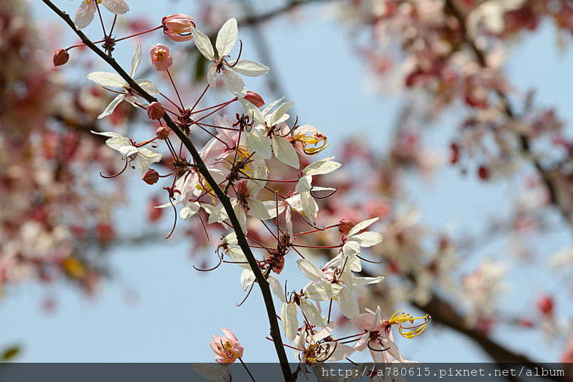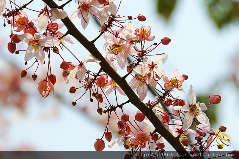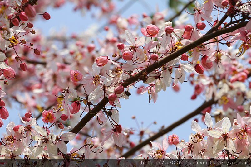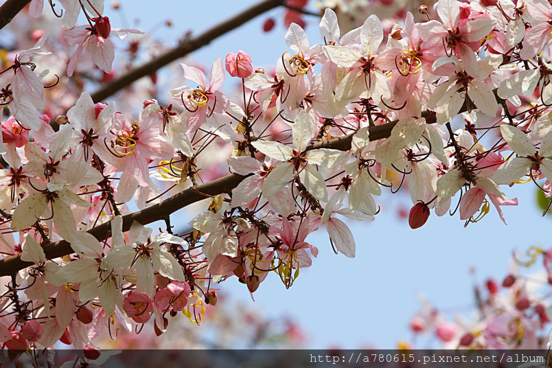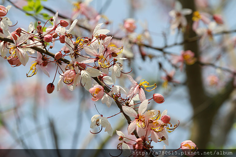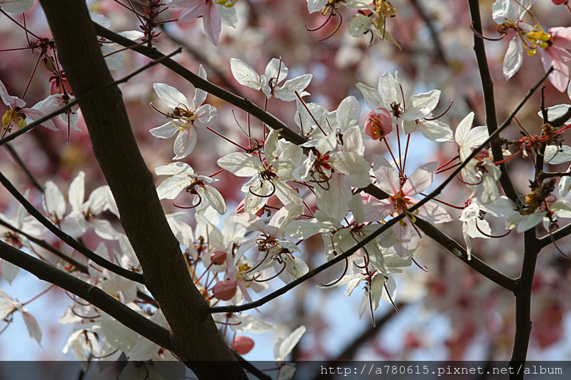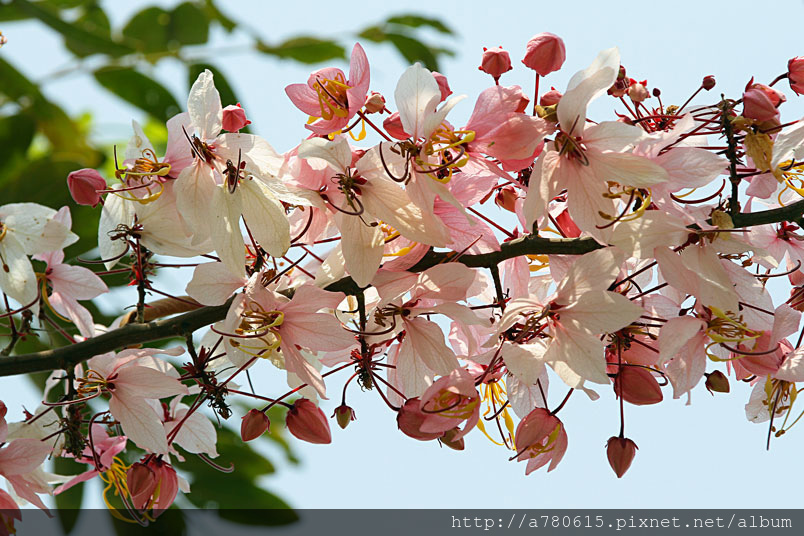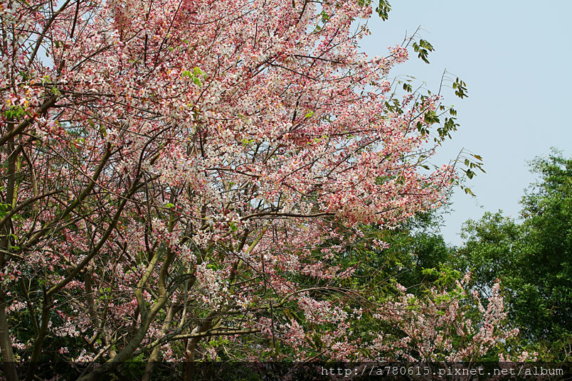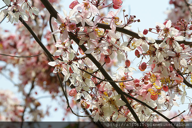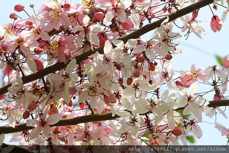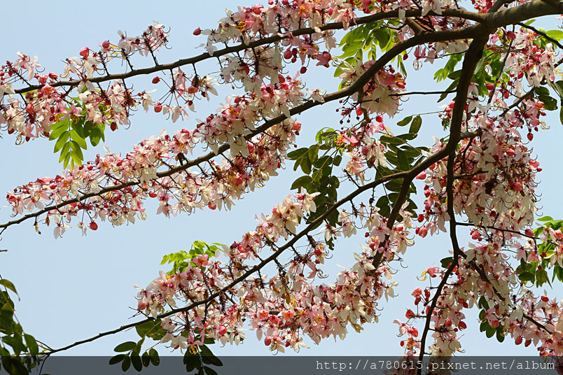 木及阿勃勒一樣,花形極為類似,但開花時,掛滿整樹粉紅的花朵
