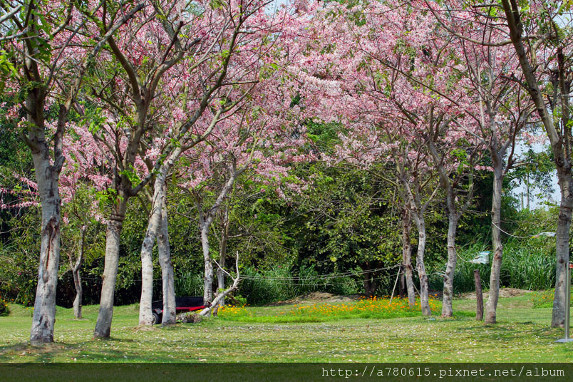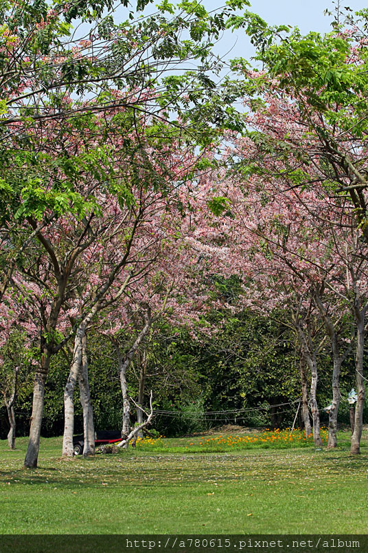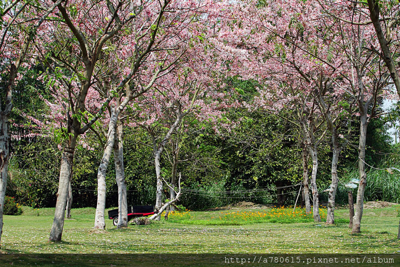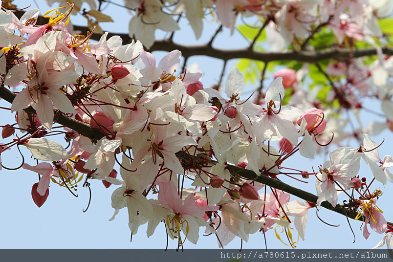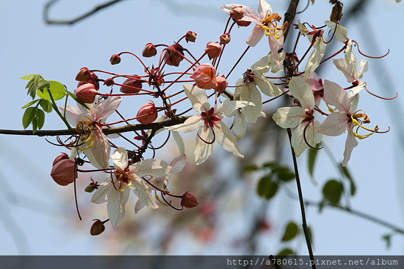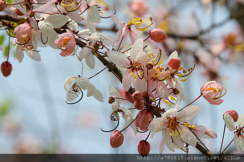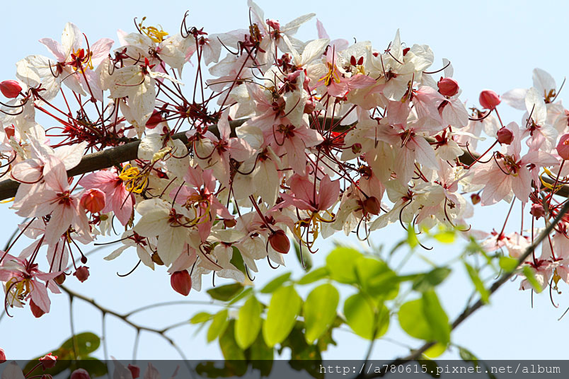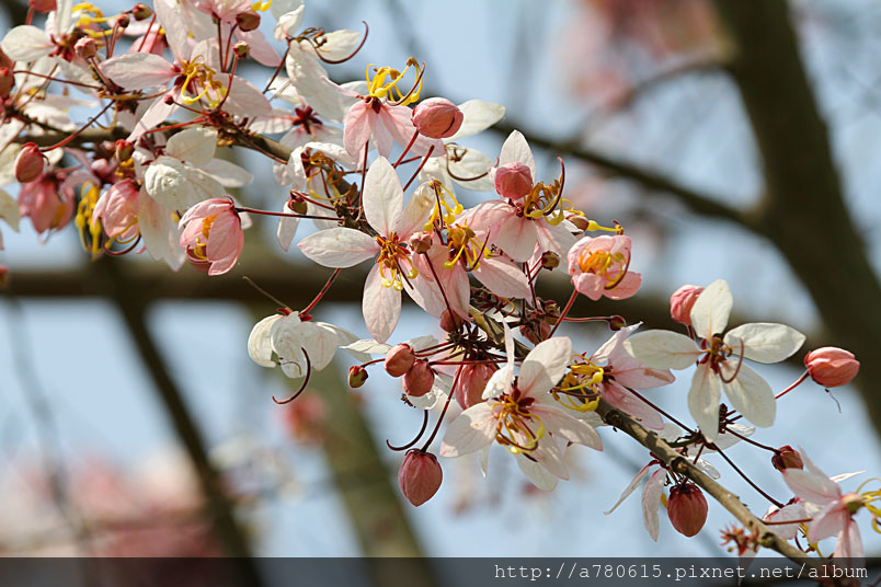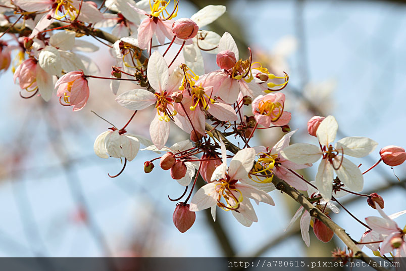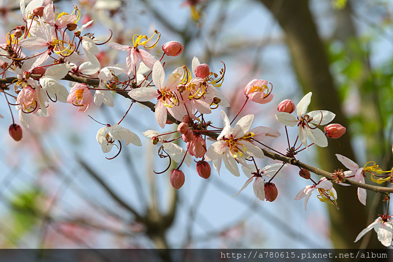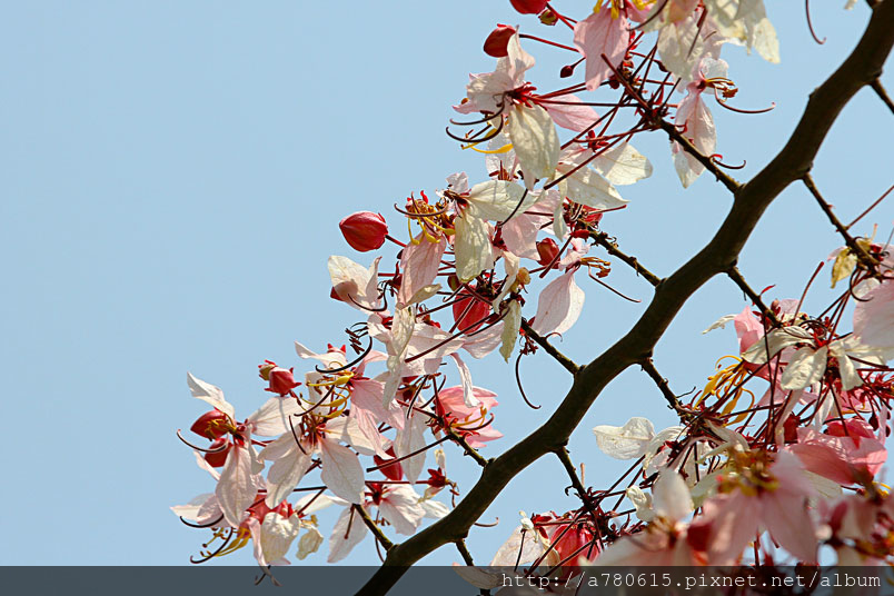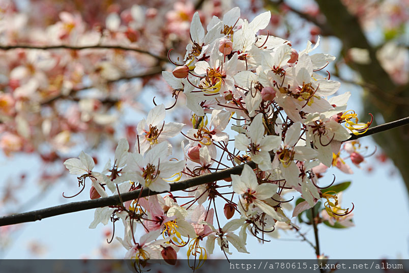 木及阿勃勒一樣,花形極為類似,但開花時,掛滿整樹粉紅的花朵