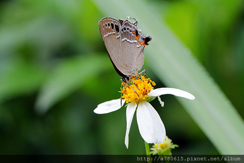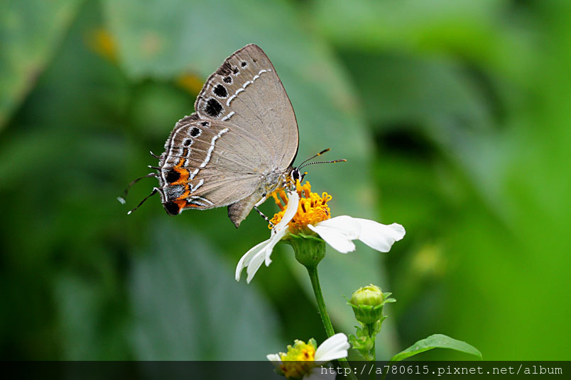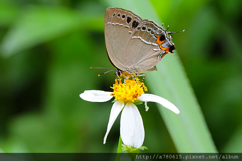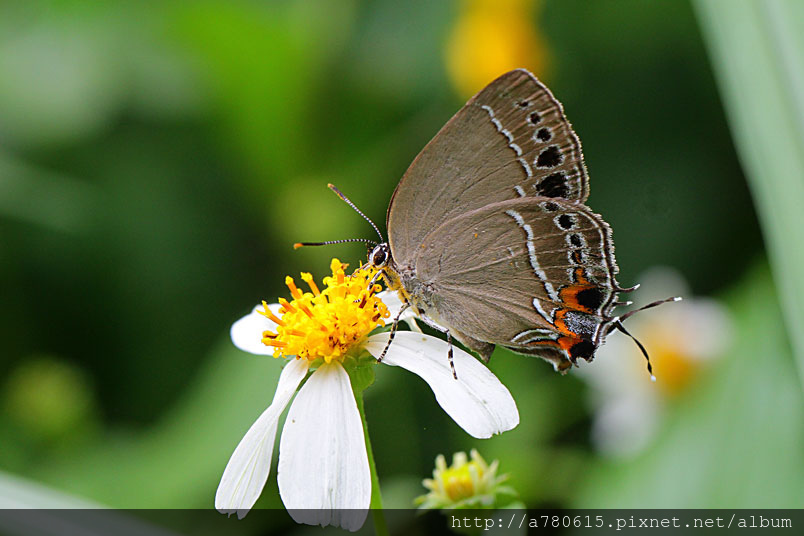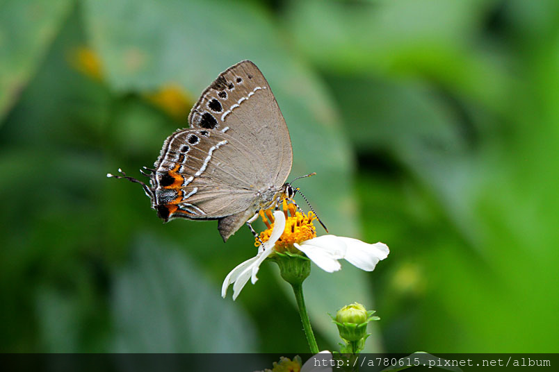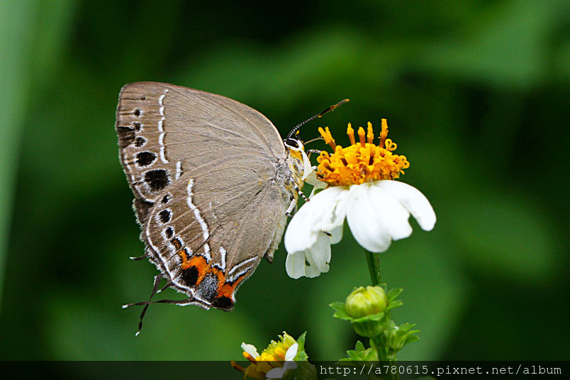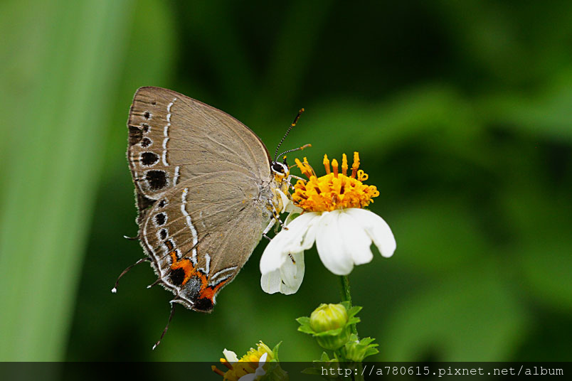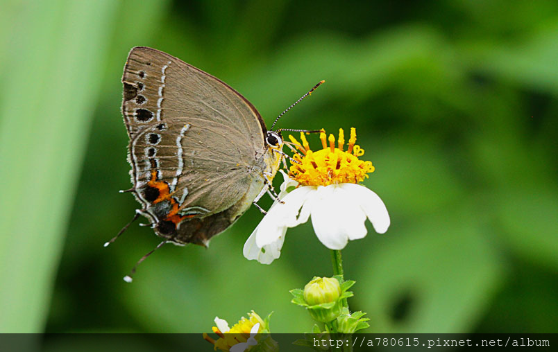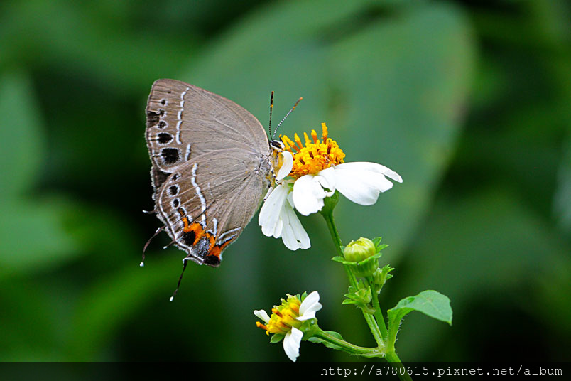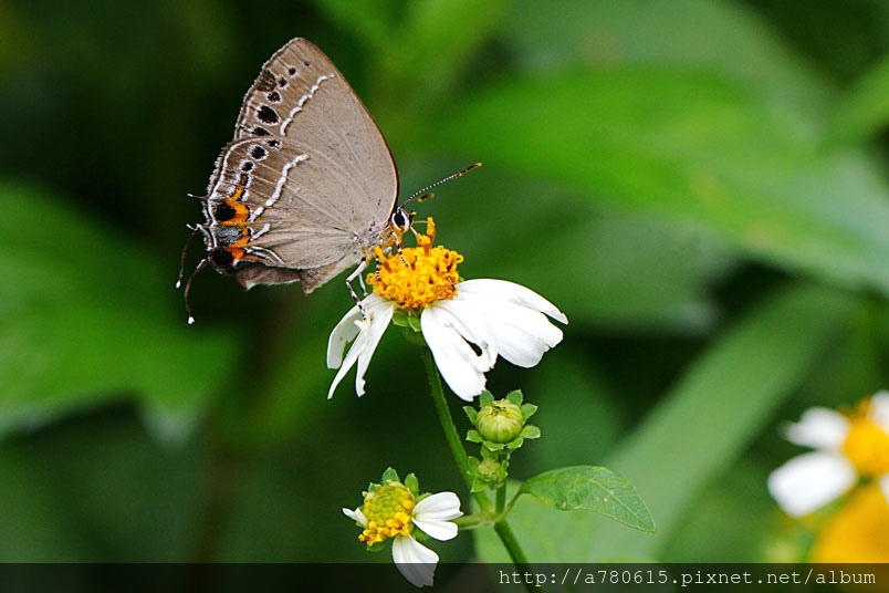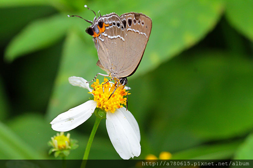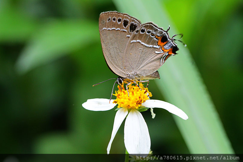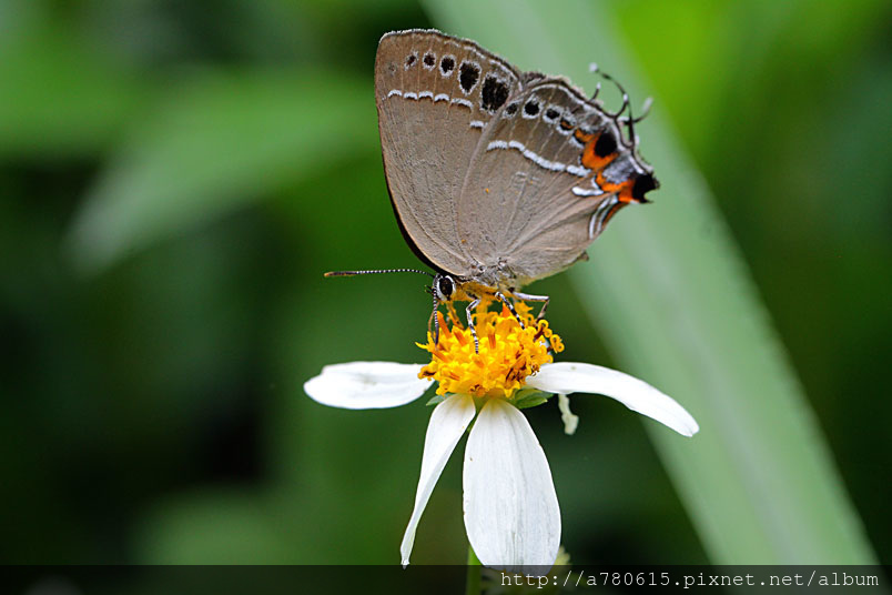 單邊鑲有黑色細紋,後翅靠近肛角有兩個小灰蝶常俱備的假眼紋。