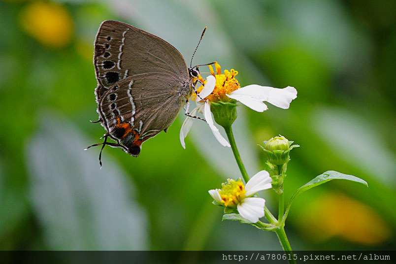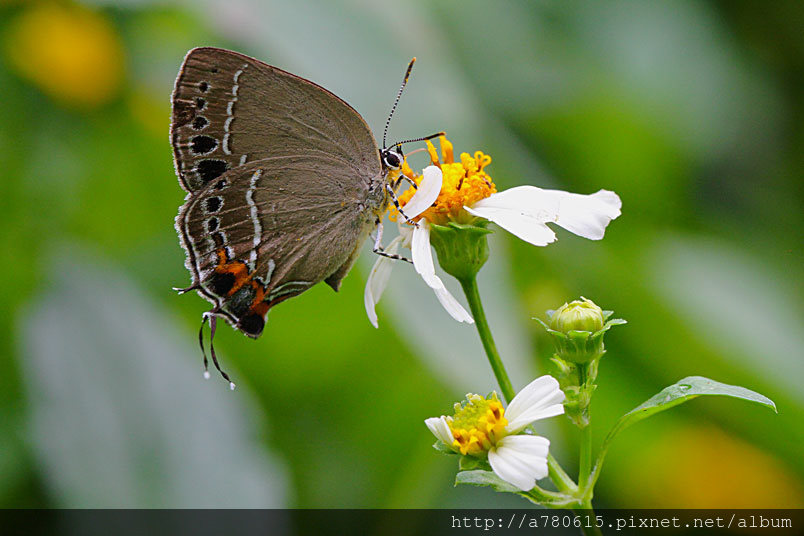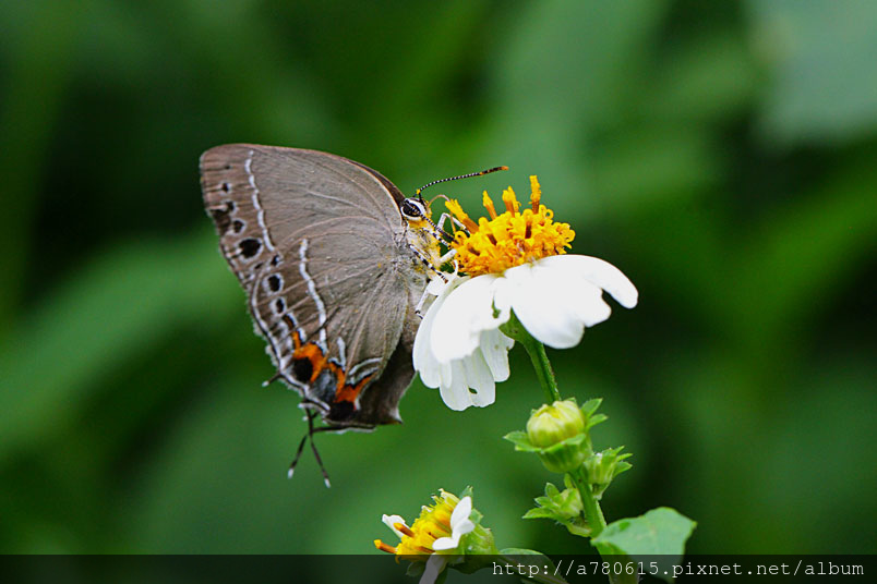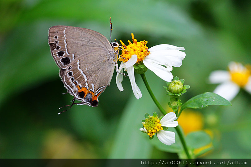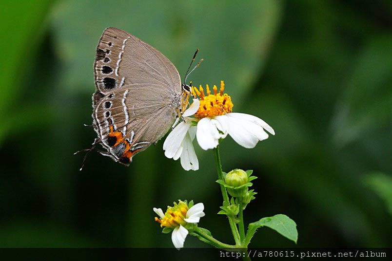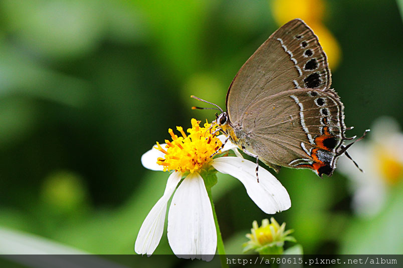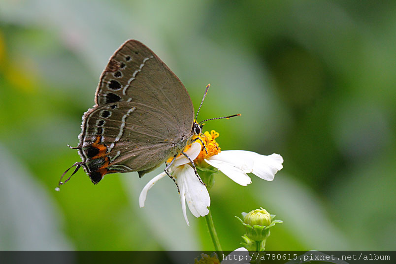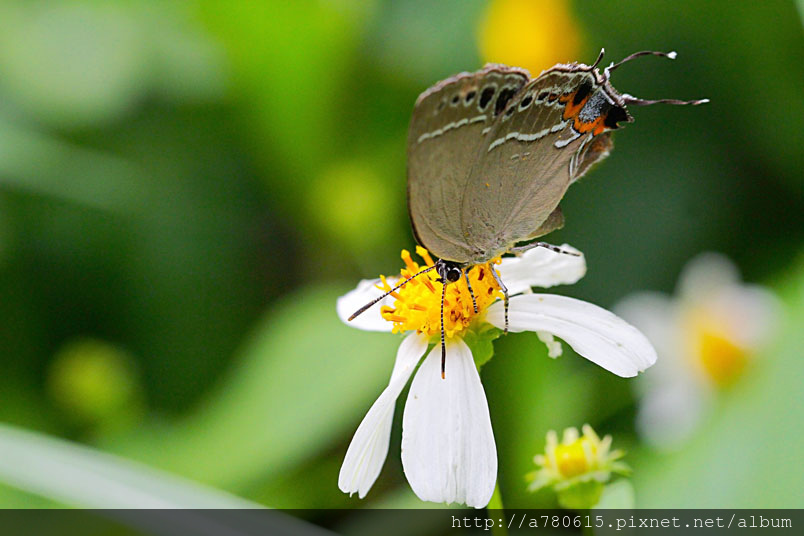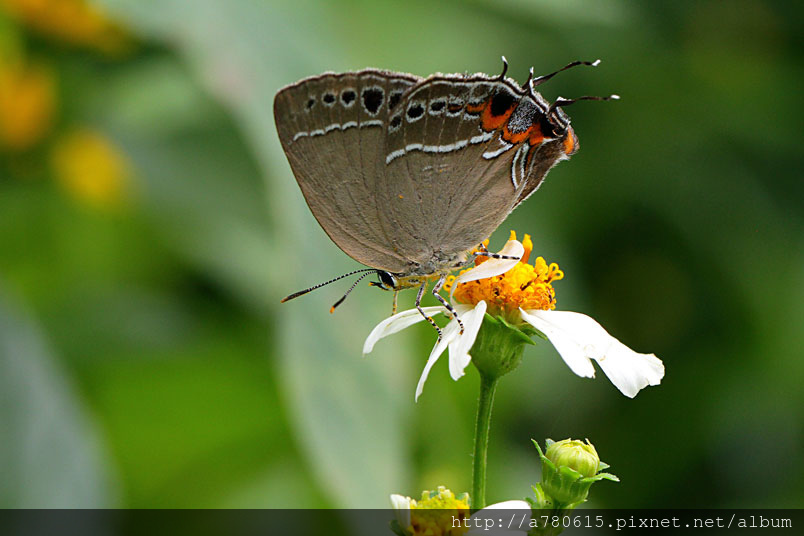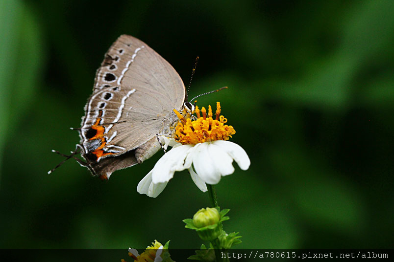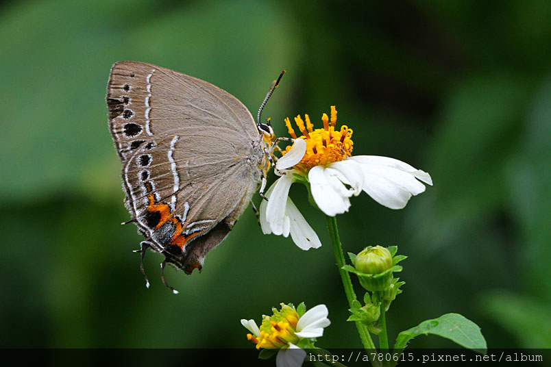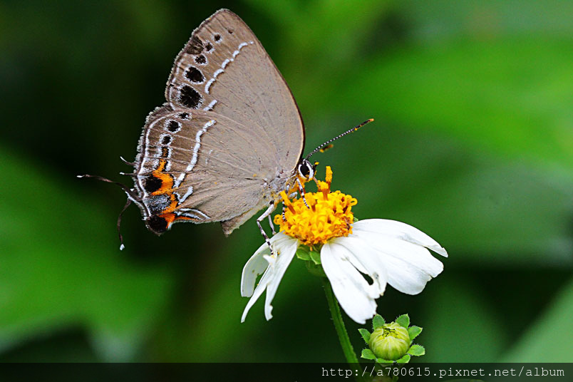 單邊鑲有黑色細紋,後翅靠近肛角有兩個小灰蝶常俱備的假眼紋。