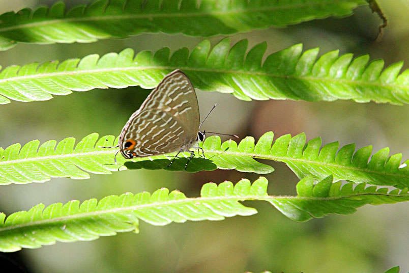斑紋有如燒焦的枯木,雌雄外觀近似但雌蟲翅面的藍紫色縱