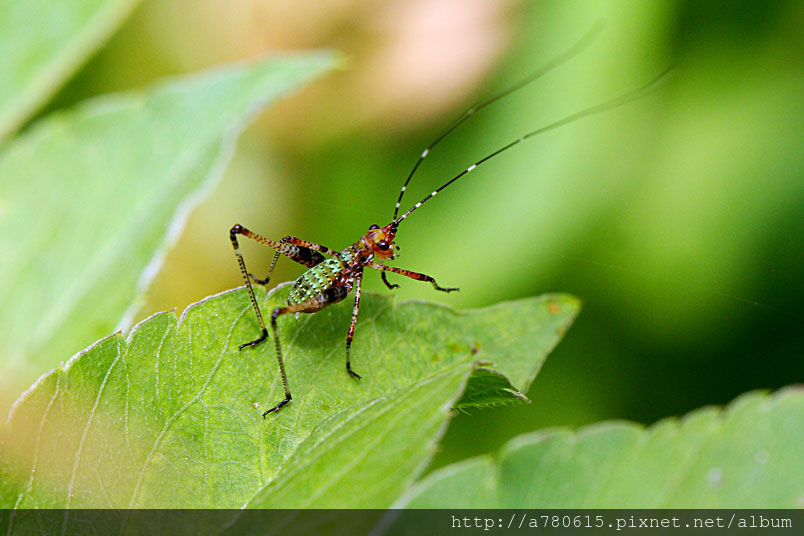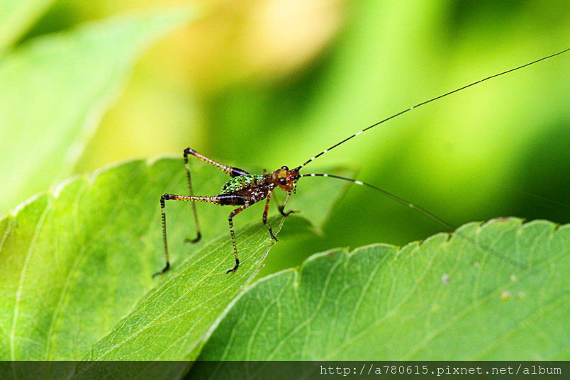 黑角露螽若蟲,體背鮮艷的綠色,密布細小斑點,觸角黑色具