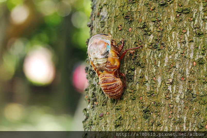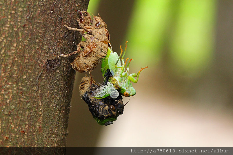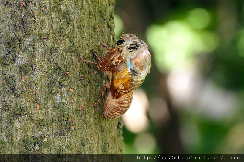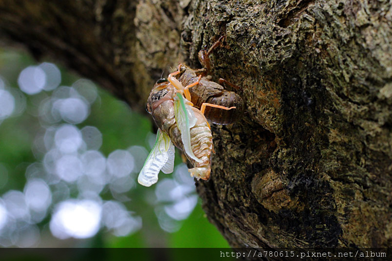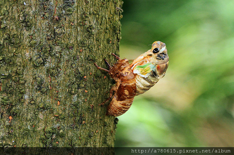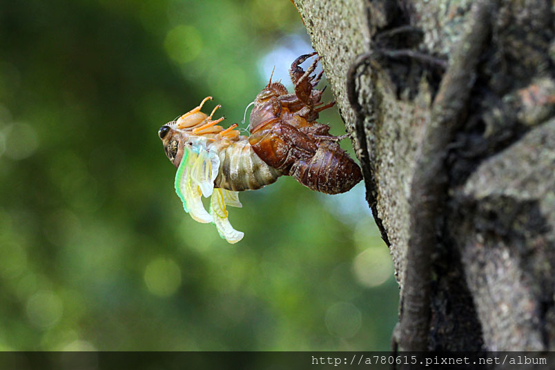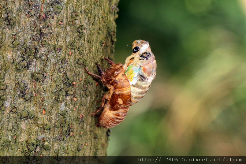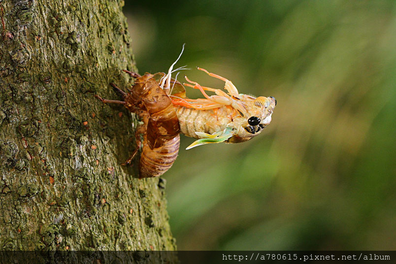 裂縫被撐開越來越大,成蟲從頭部先伸出,等到胸部也出來後