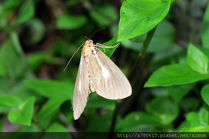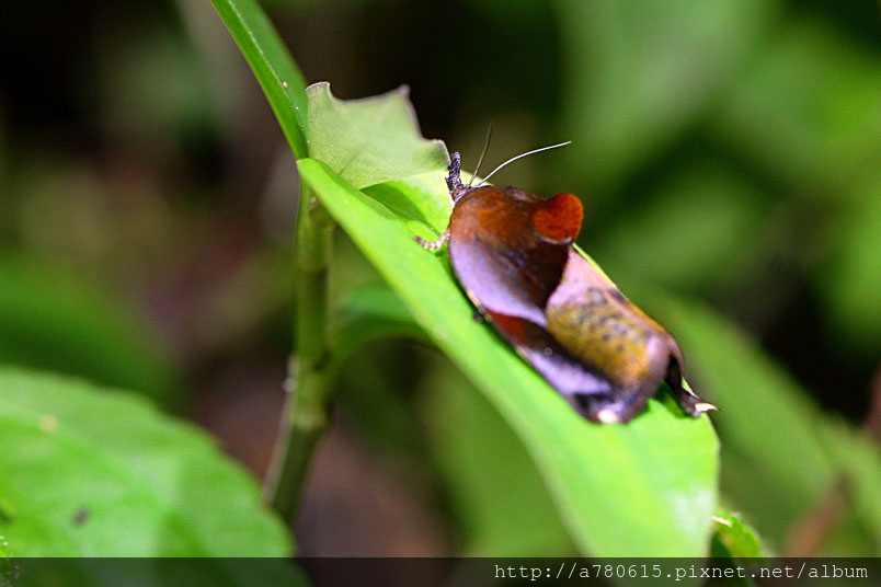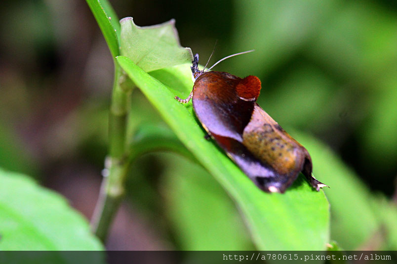 近後緣處褐色,後翅中央有兩枚白斑。翅腹面底色亦為黑褐色,