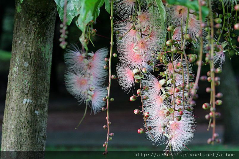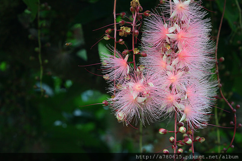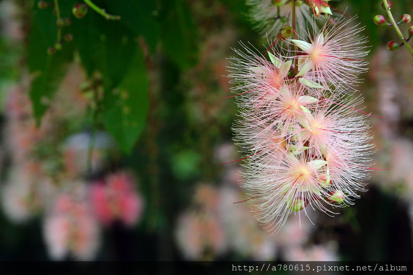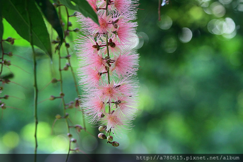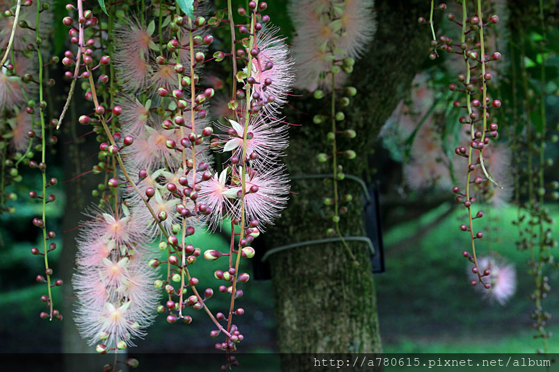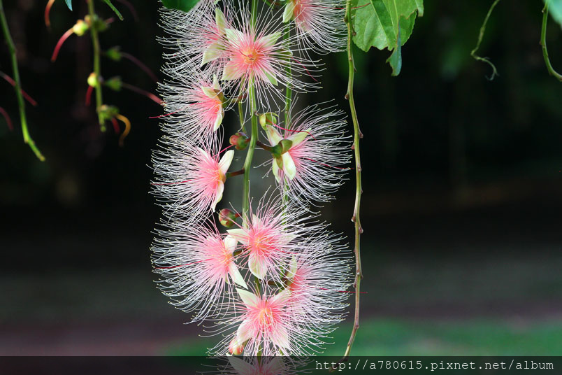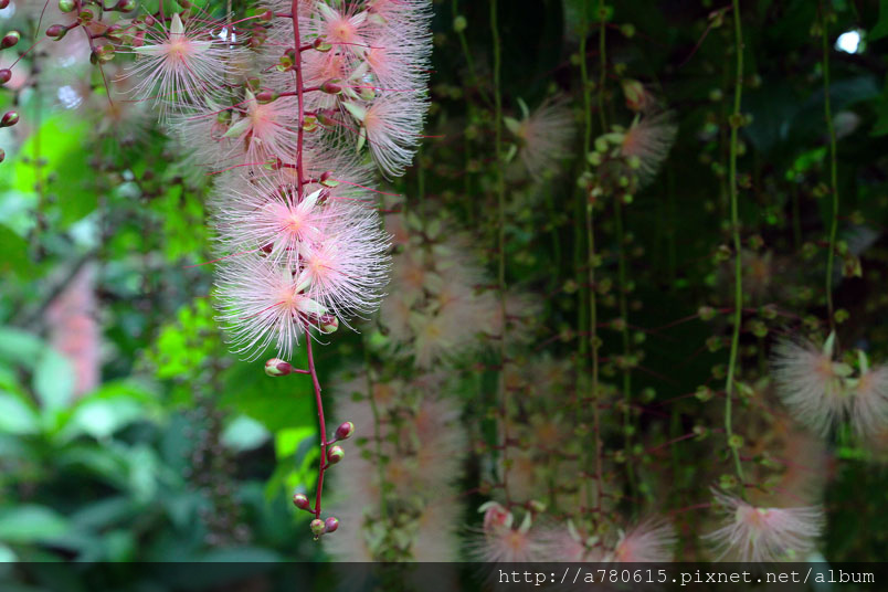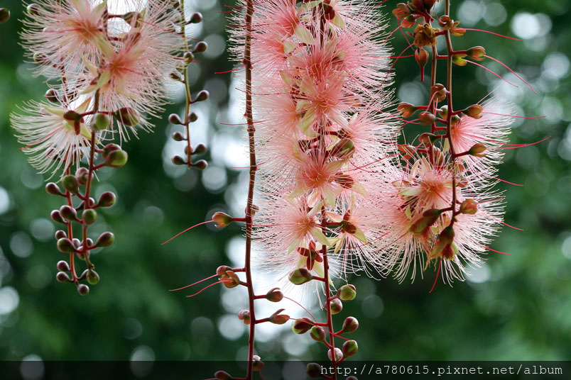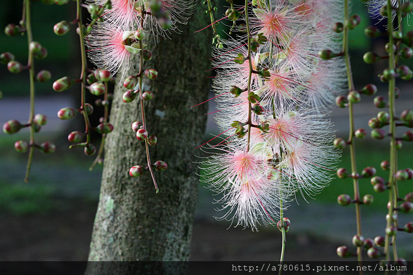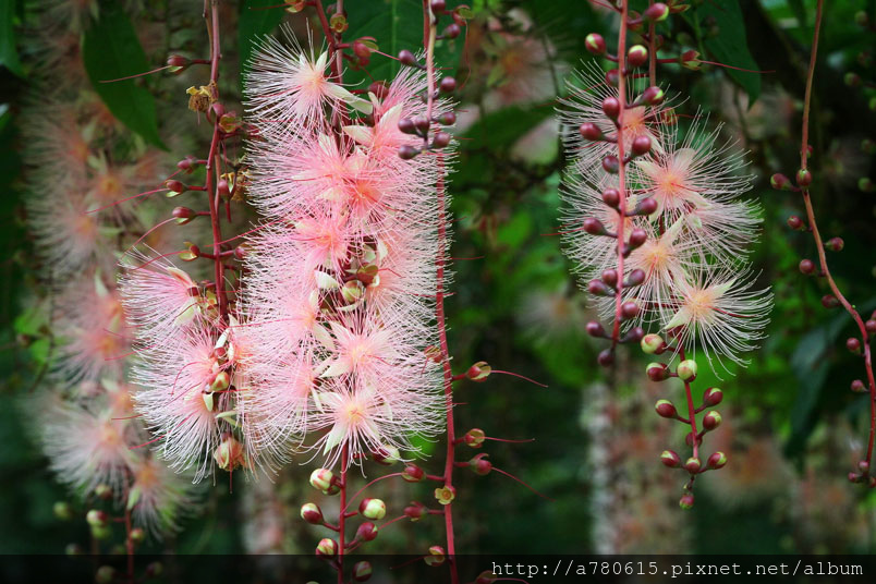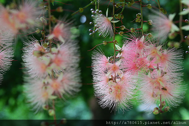 清晨凋謝,粉撲狀的花朵由上百枚的雄蕊構成。