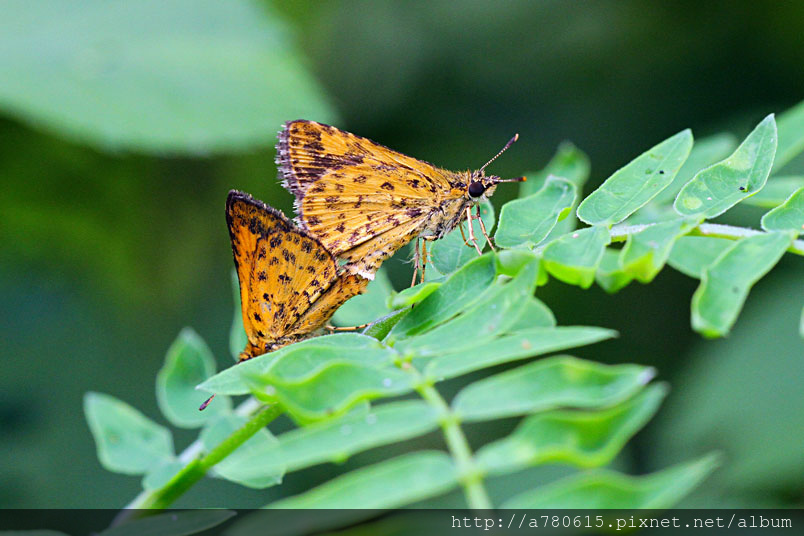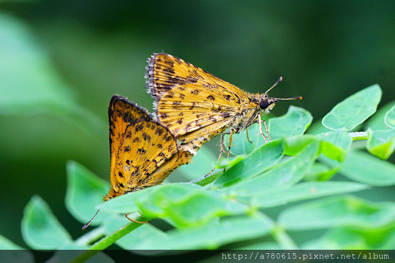 小黃斑弄蝶,弄蝶科,展翅20~23mm,上翅表面深褐色具4枚橙黃