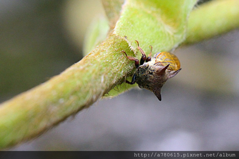 仔細看牠頭上有著三隻角,所以被稱為「三刺角蟬」。