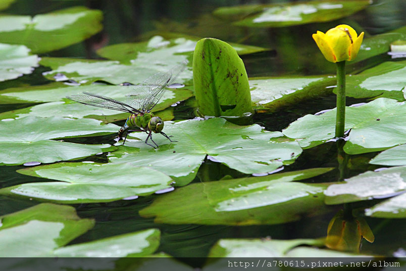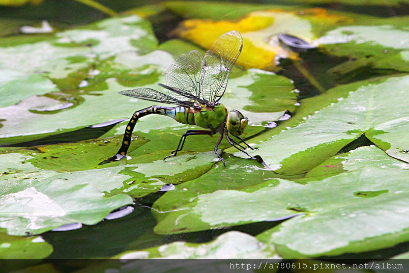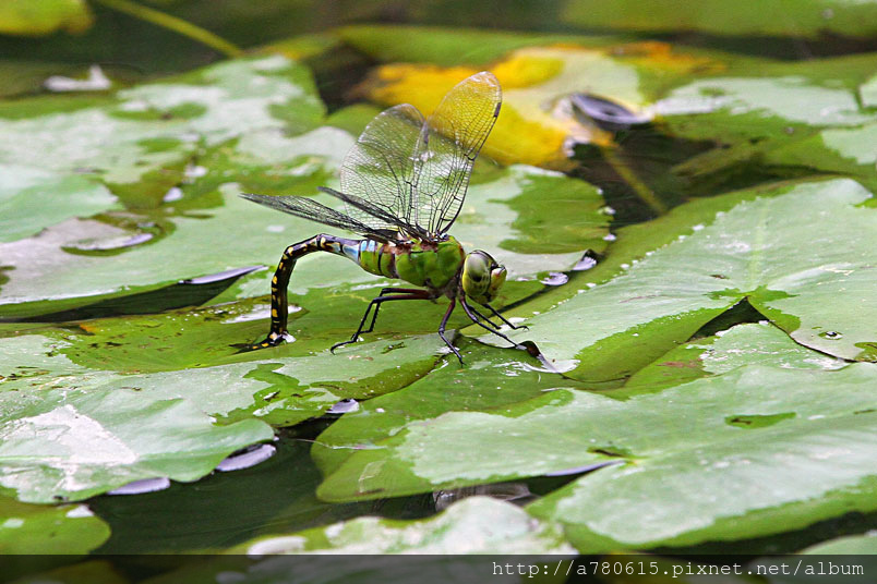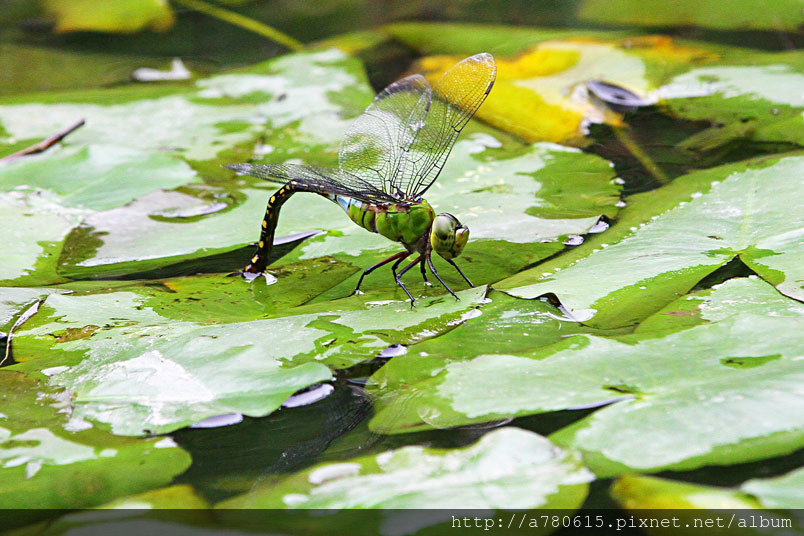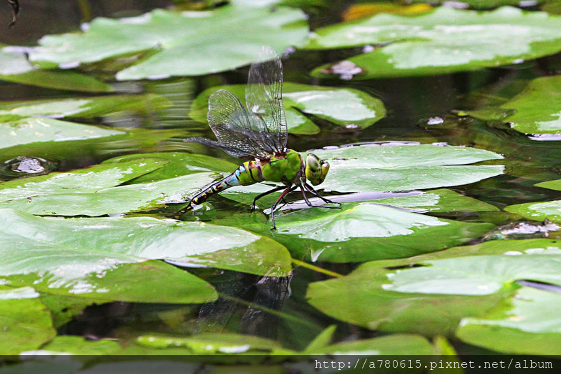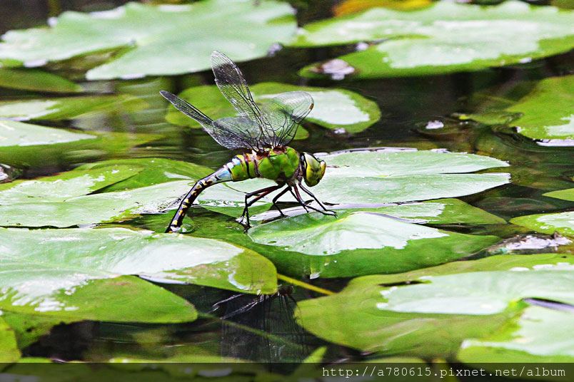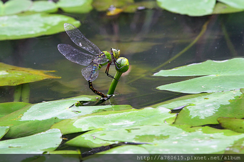麻斑晏蜓停在水草上,尾部伸入水中產卵。
