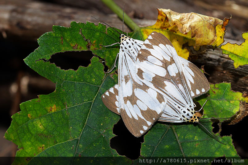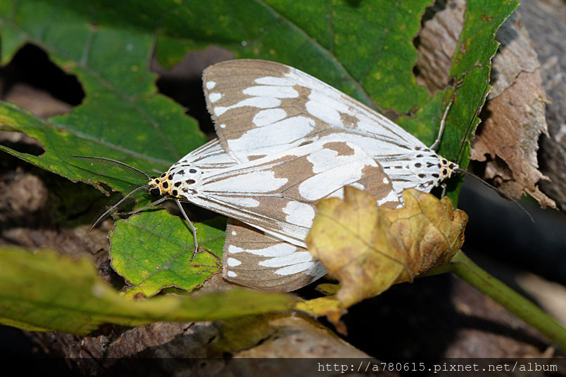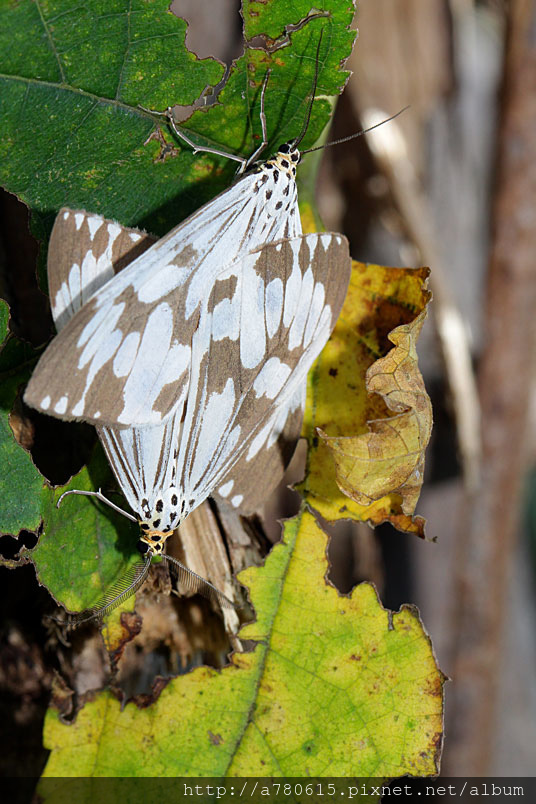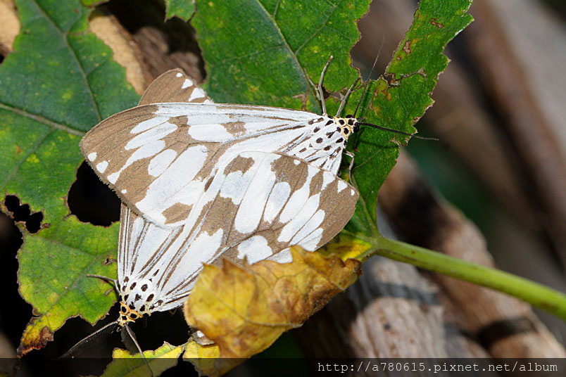 粉蝶燈蛾交尾,雌雄交疊呈幾何狀,頭尾反向十分可愛。