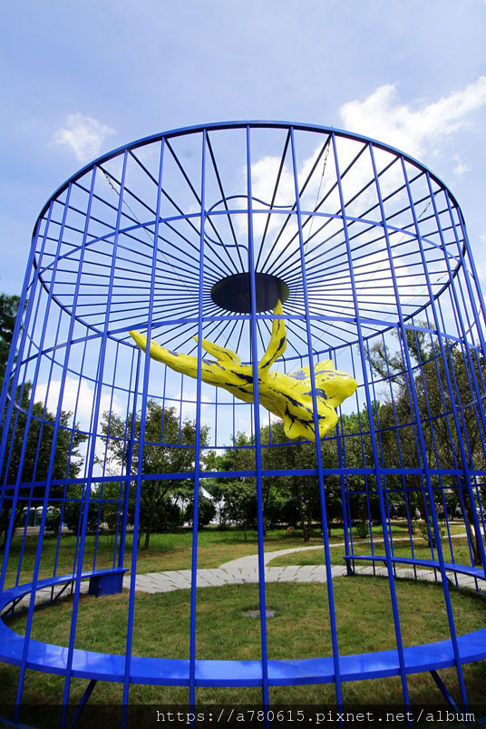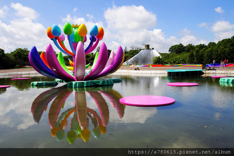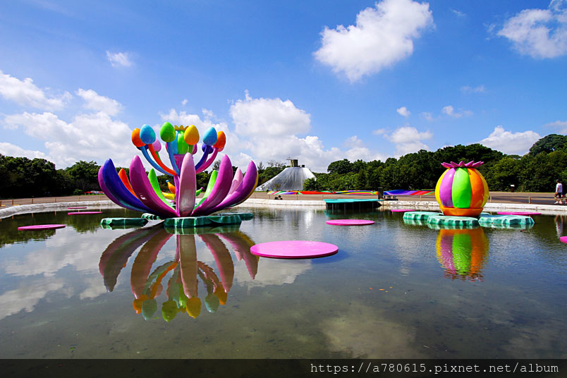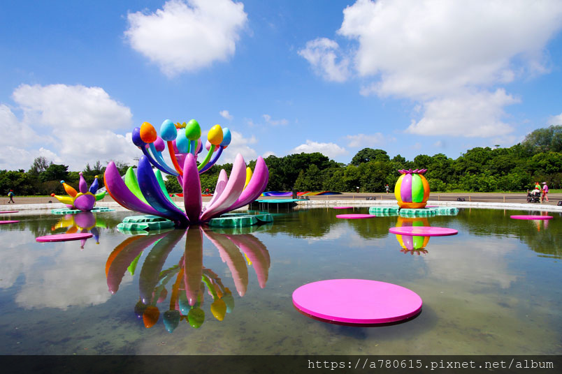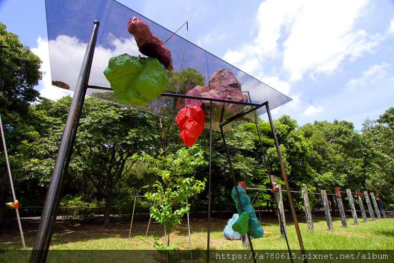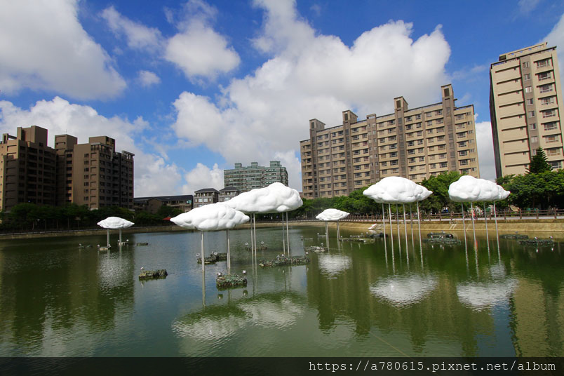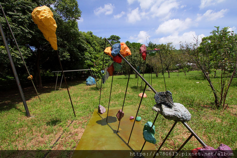 新加坡藝術家陳偉立作品《歡聲笑語》設置於西坡埤塘生態公園,他