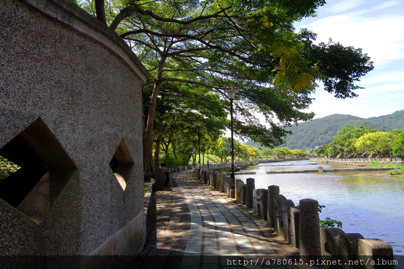 牛欄河親水公園位於新竹關西,河畔兩旁綠樹成蔭,一到秋日,