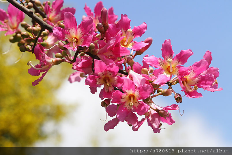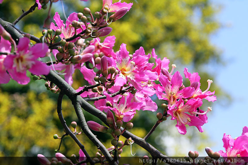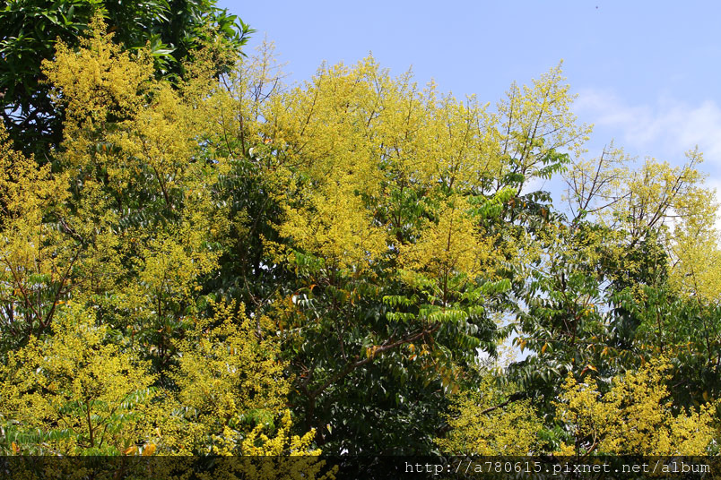 欒樹開花了,黃橙橙的小碎花掛滿枝頭。美人樹也不惶多讓,一