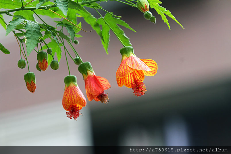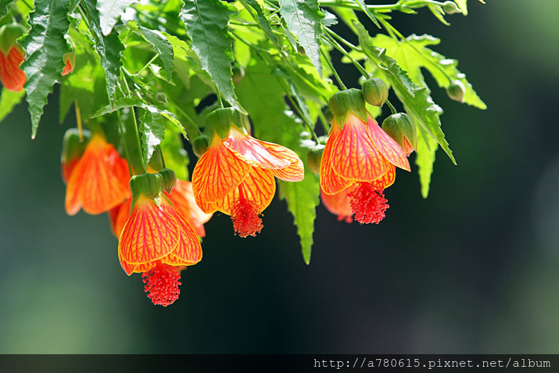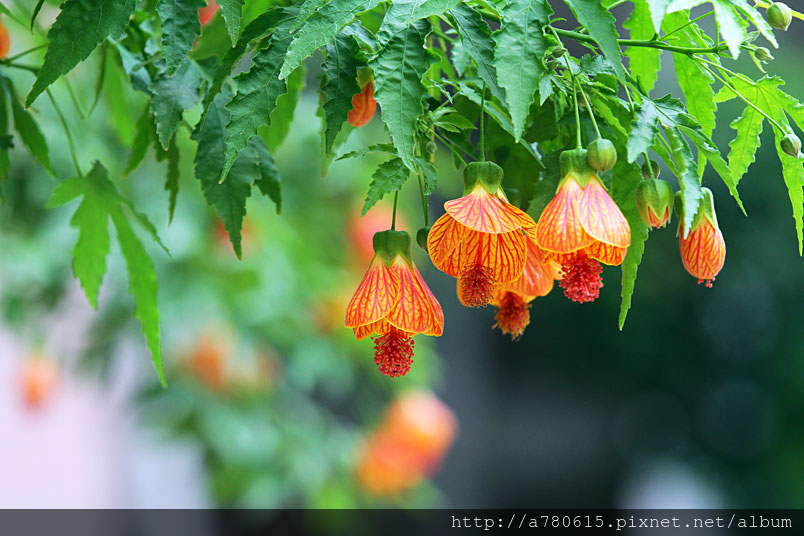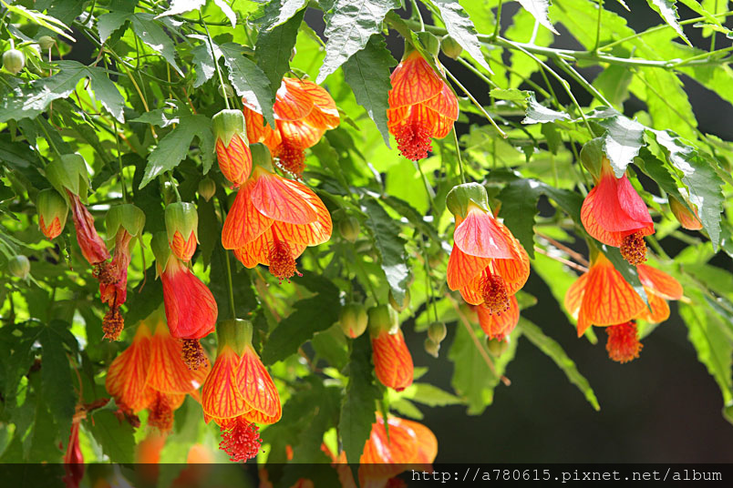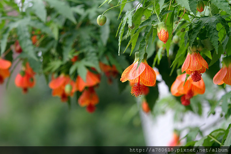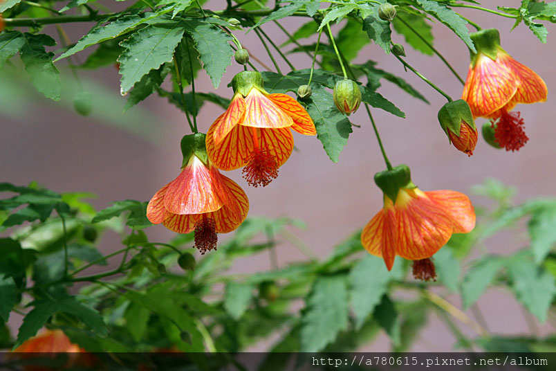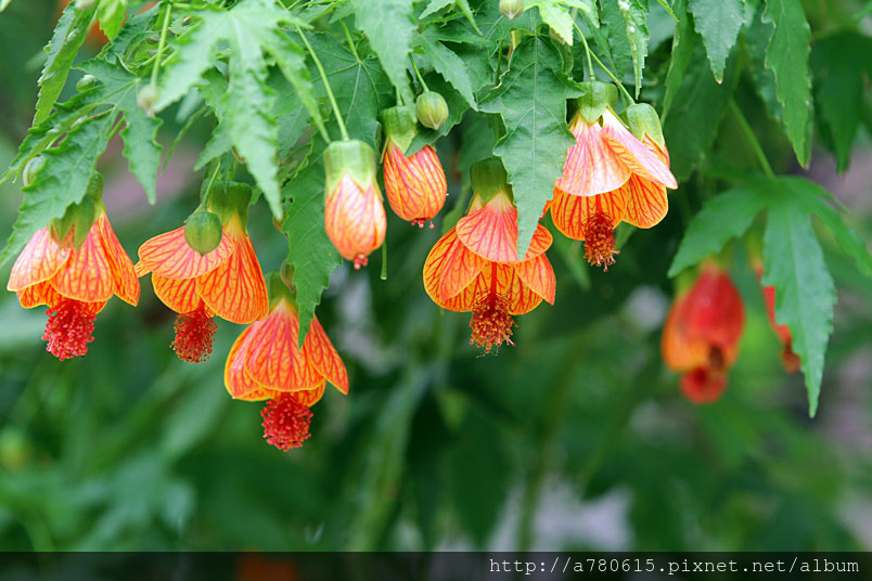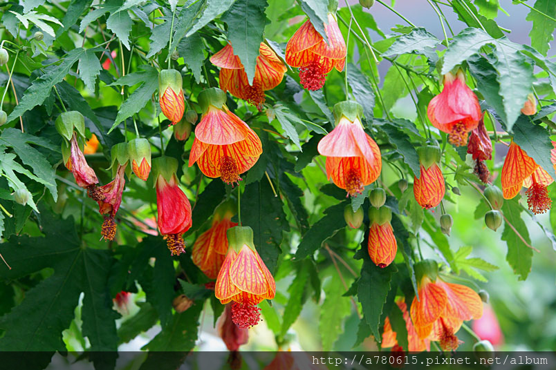 花奇特,橙紅色,有紅色脈紋,形似風鈴,美麗可愛,宜作花籬