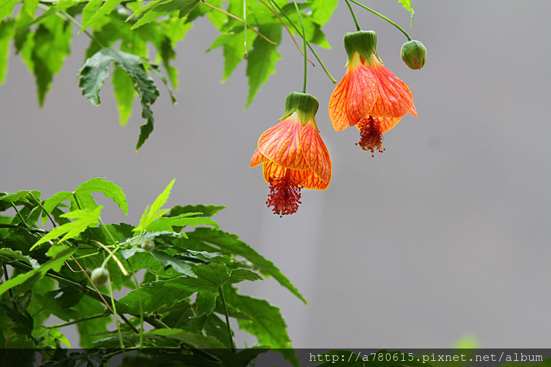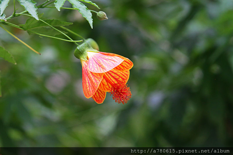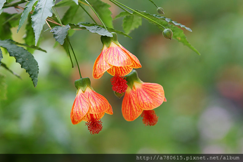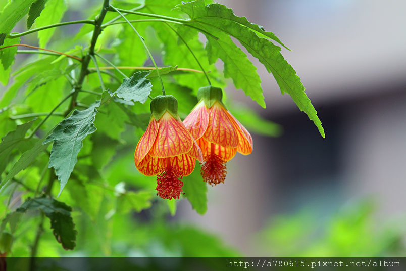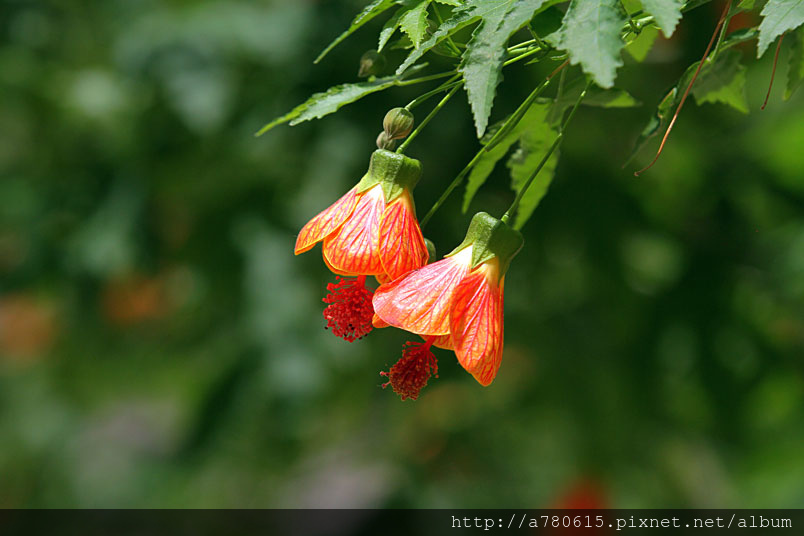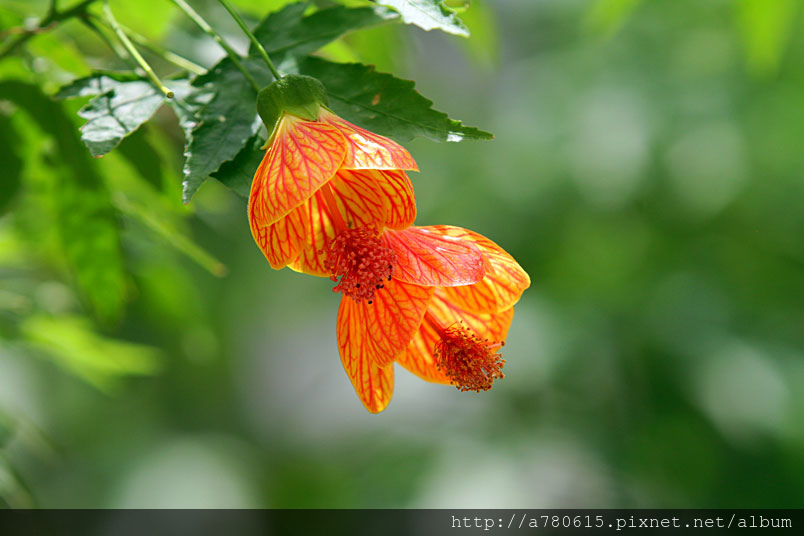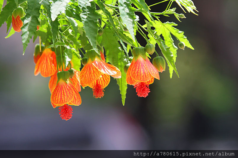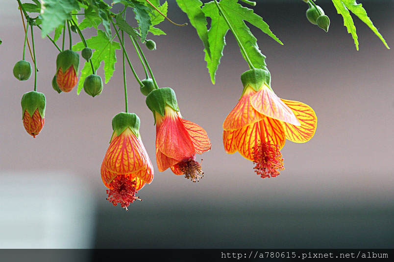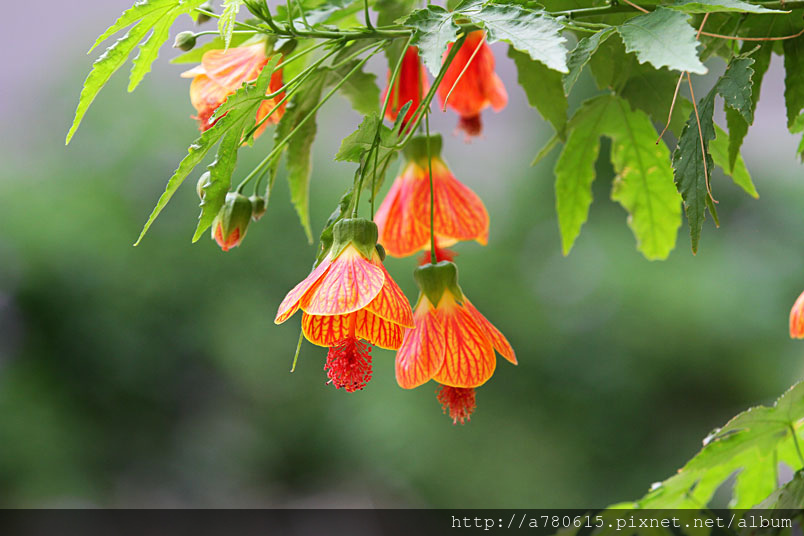 花奇特,橙紅色,有紅色脈紋,形似風鈴,美麗可愛,宜作花籬