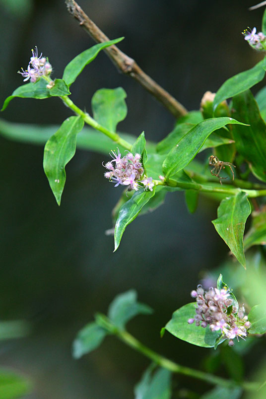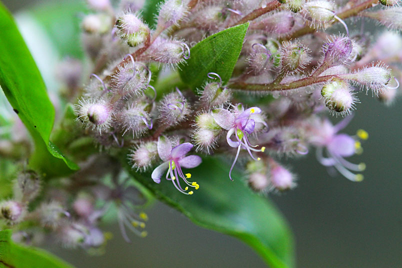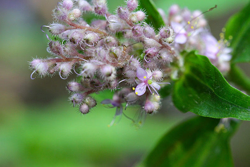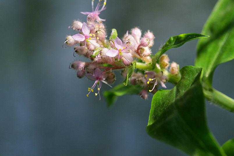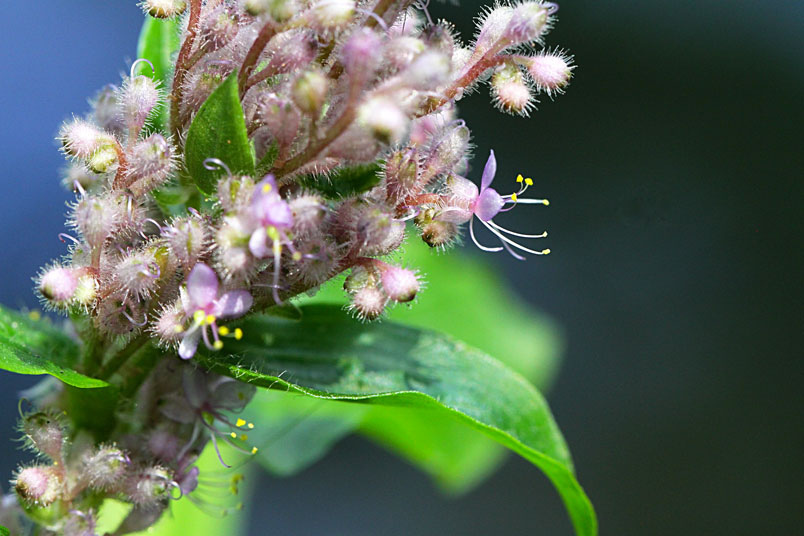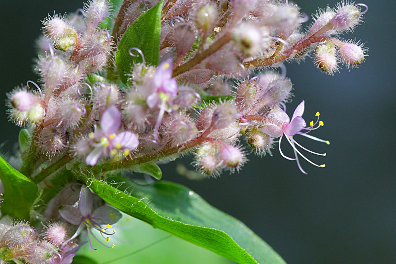 花朵成密集的花序生長於枝條頂端,淡而無華的粉色系花色,