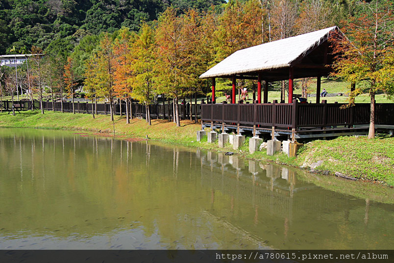 座忘憂湖,湖畔有整排的落羽松,水中倒映的景色非常浪漫美麗。