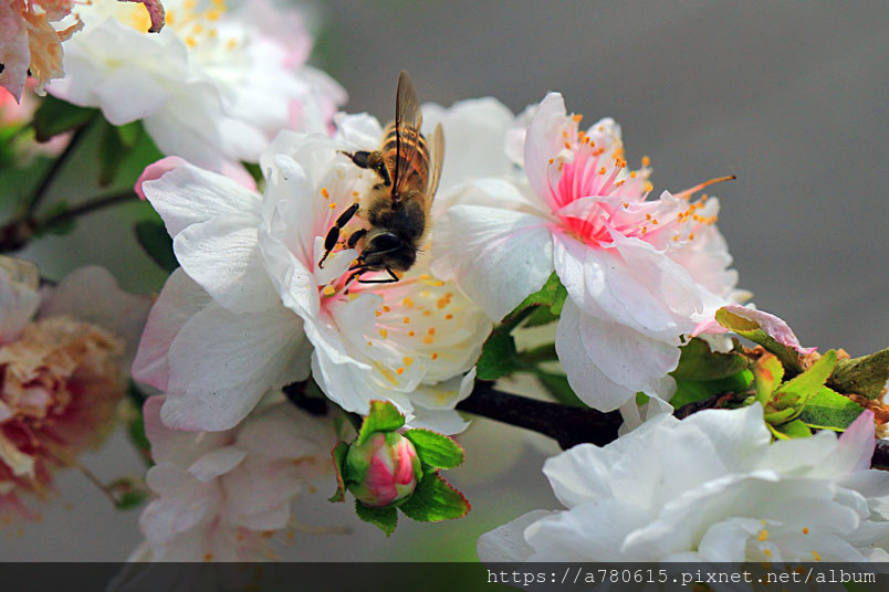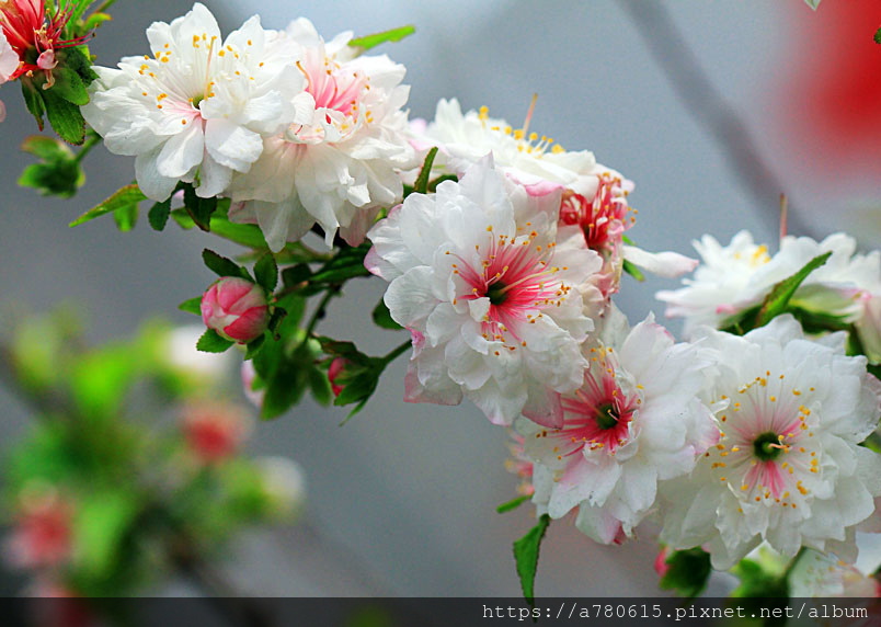花腋生,花色以白、粉紅為主色,素白中微透緋紅,簇生於枝條