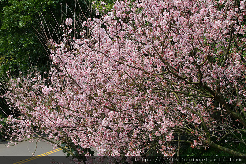 園龜山的東方球場路周圍種植好幾棵,目前正是盛花期,粉嫩嬌
