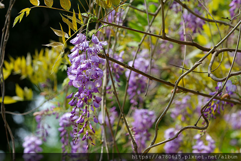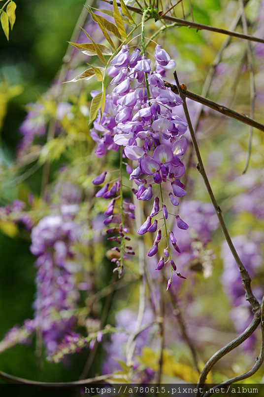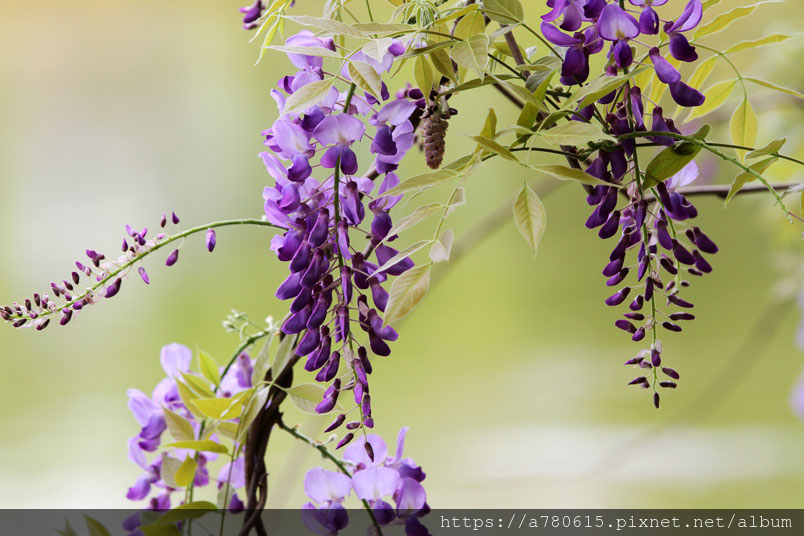 紫藤為著名的蔭棚花卉,生長迅速,枝葉繁茂,綠葉羽狀,紫花