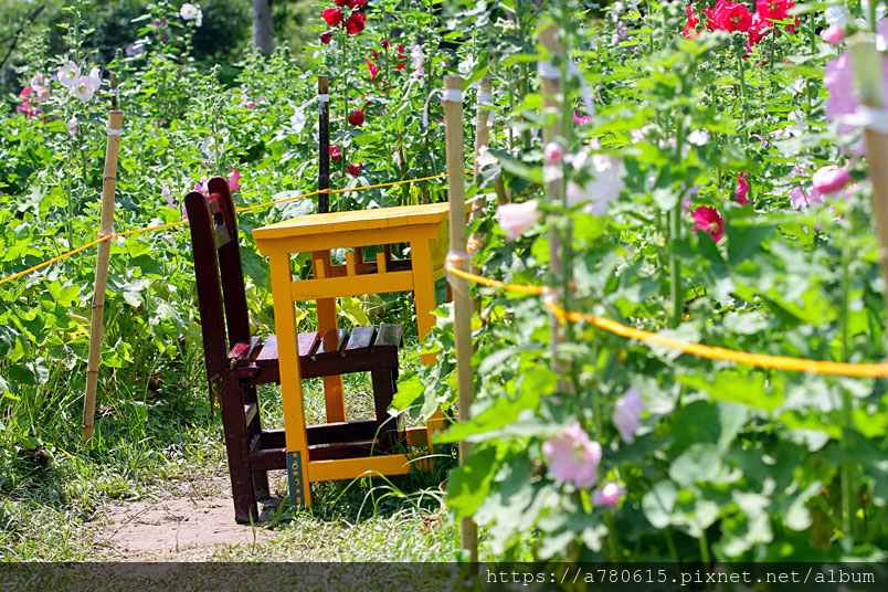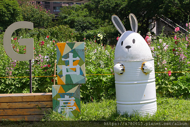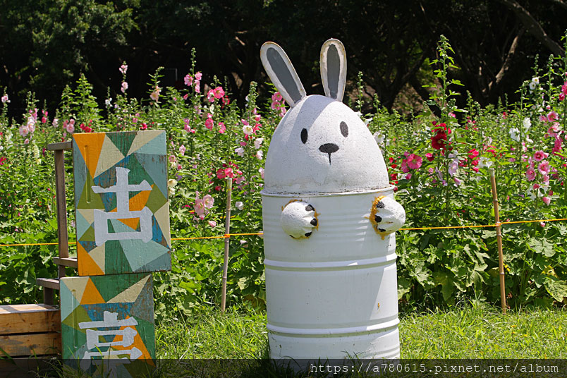兩百多株的蜀葵花海,現場還佈置了可愛的玉兔使者,美麗浪漫
