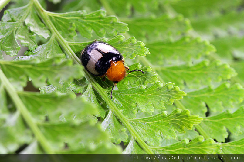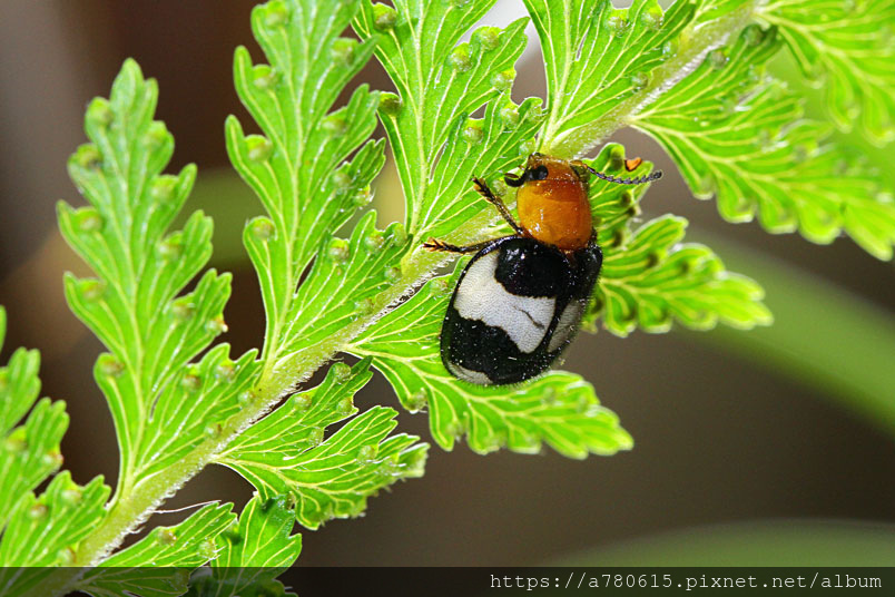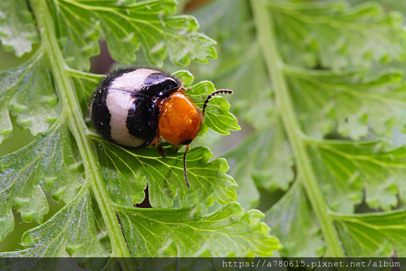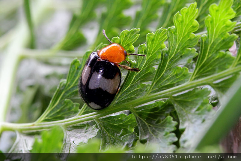 翅鞘黑色,中央及翅端各有一條白斑,合翅時相連。