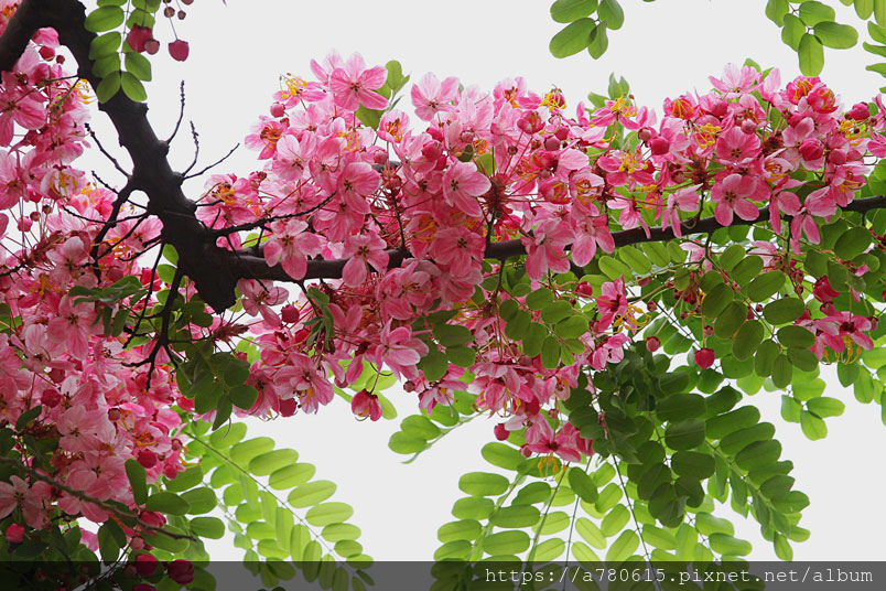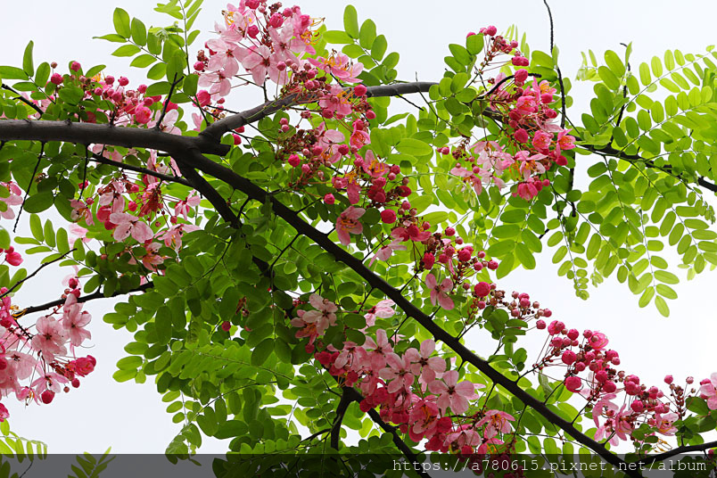 艷陽下,爪哇旃那舒展滿樹的紛紅,粉白的花瓣和纖細的枝條,