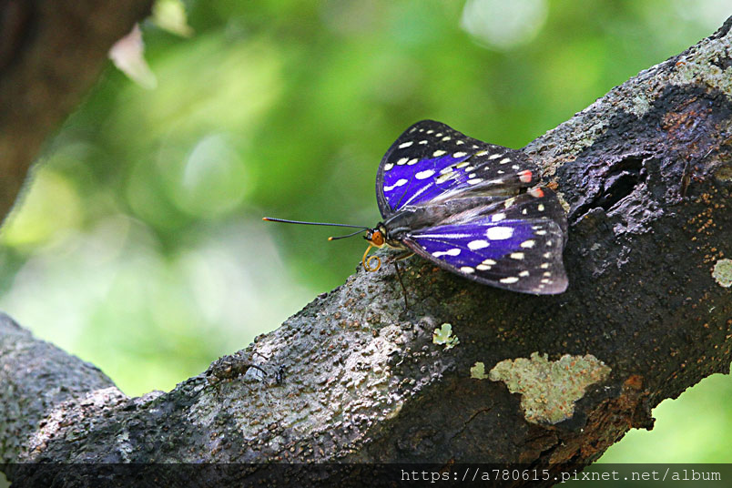 點,各翅中央有紫色金屬光澤,近翅緣密生白斑 ,肛角處有紅斑