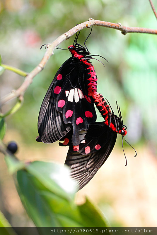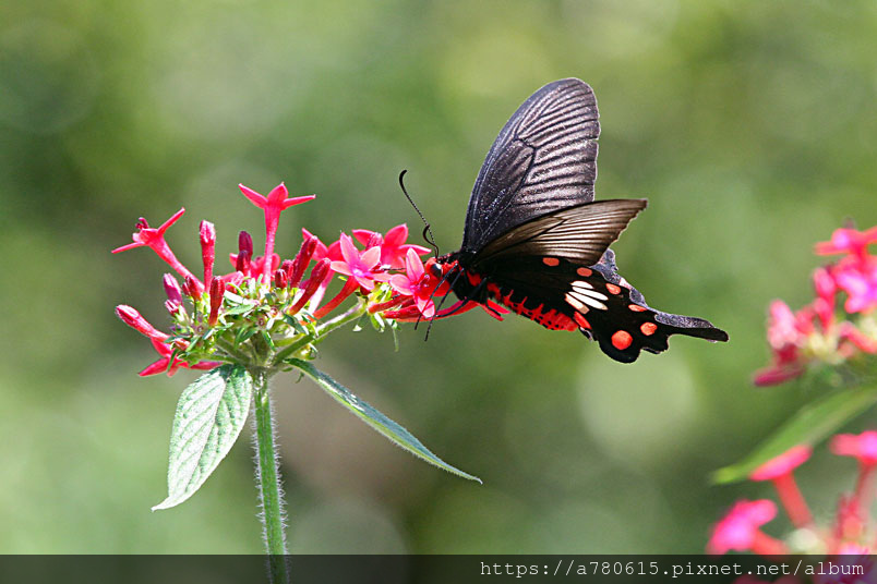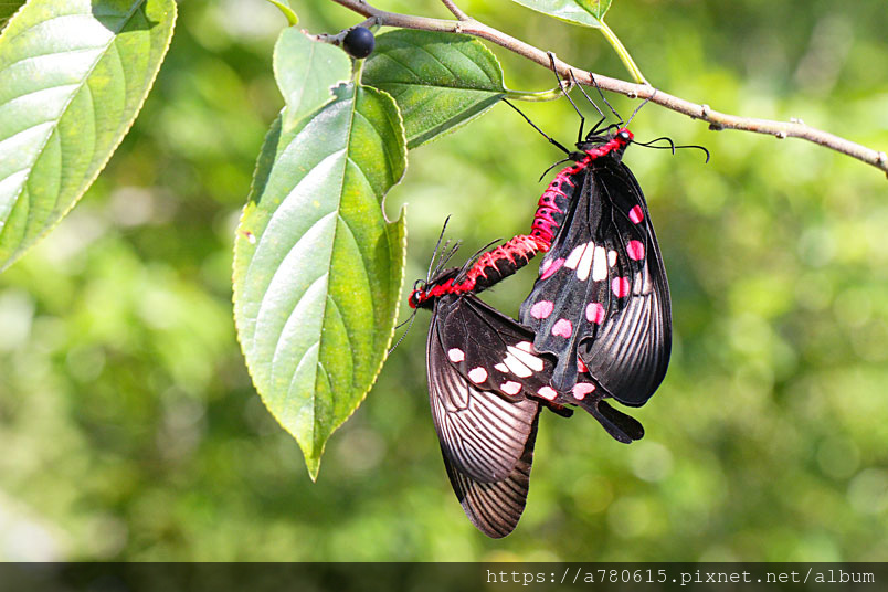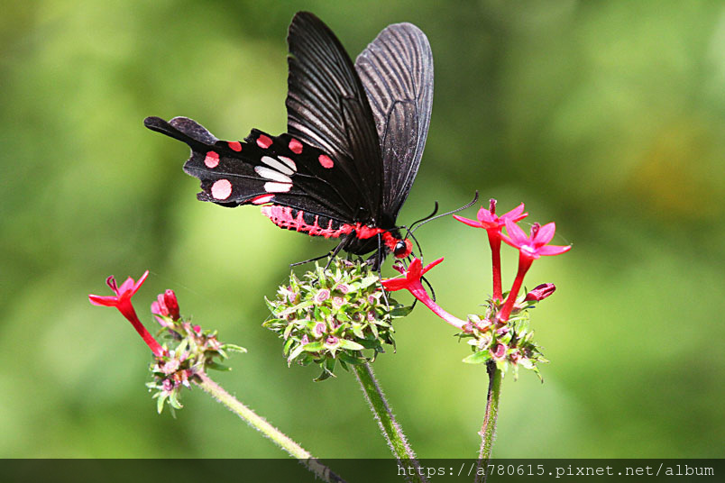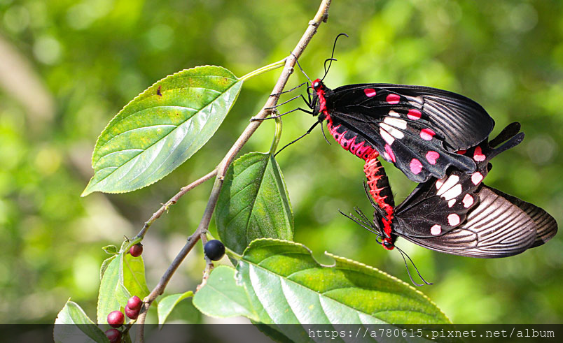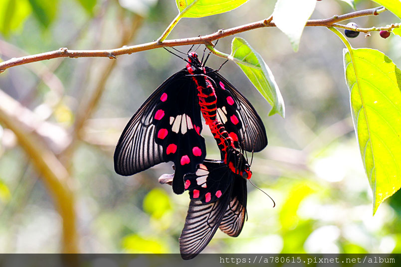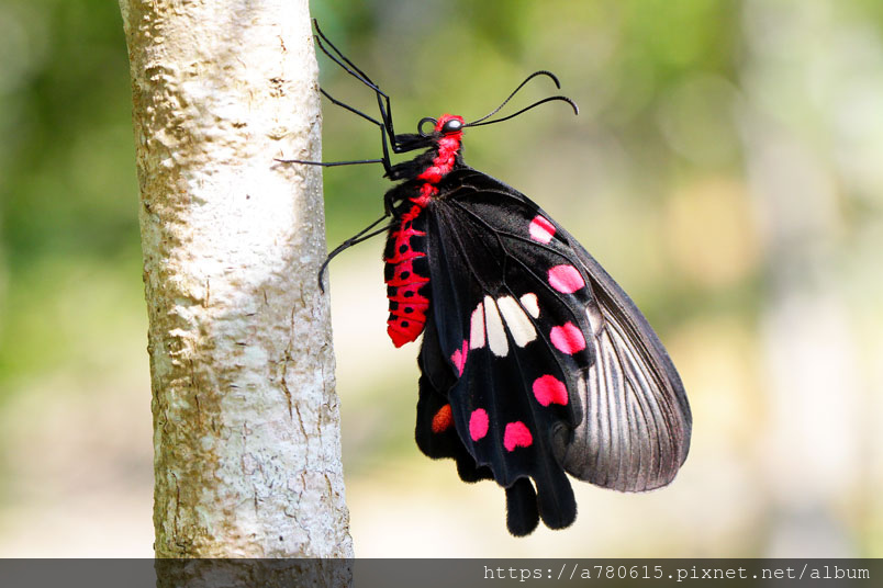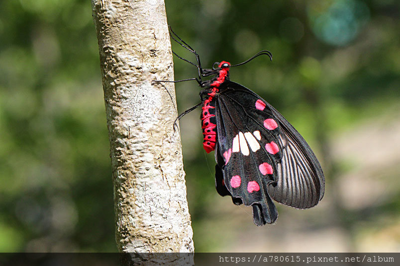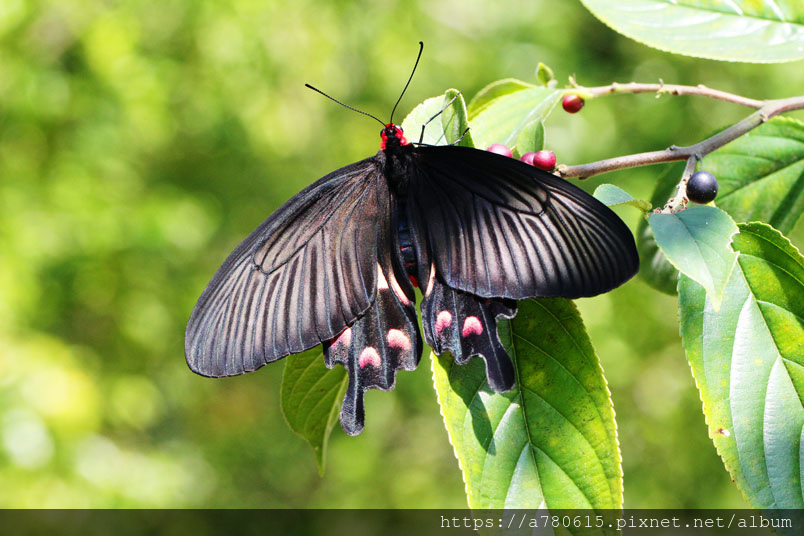 紅紋鳳蝶(鳳蝶科) 展翅70~90mm,翅膀表面黑色,後翅緣具桃紅色