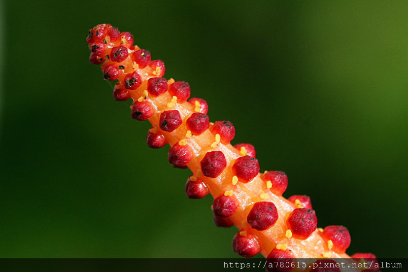 雄花開花時,紅色花瓣打開,可看到淡黃色的花粉,其排列像是