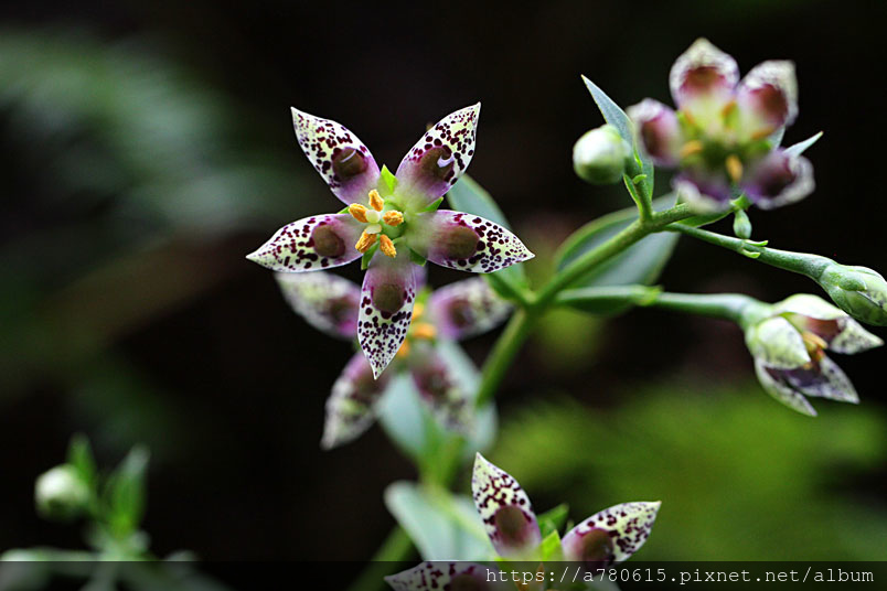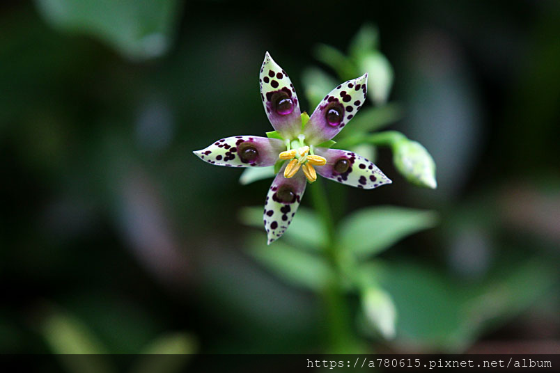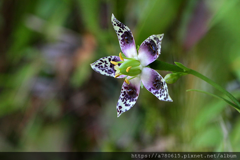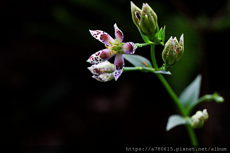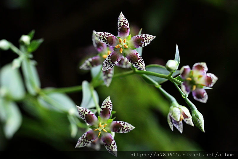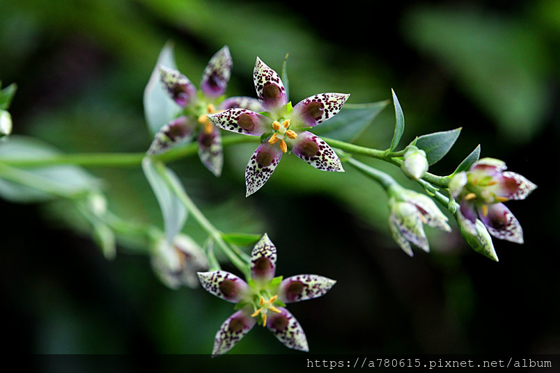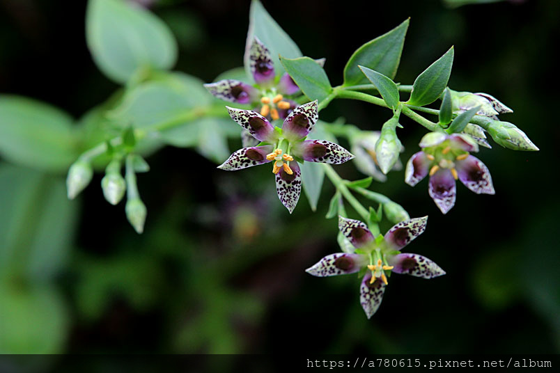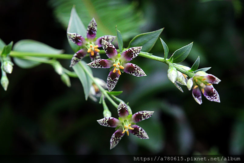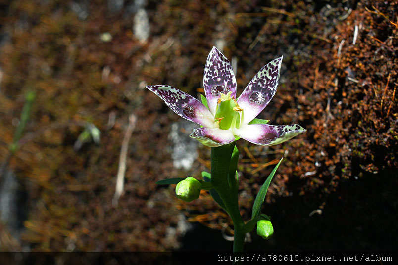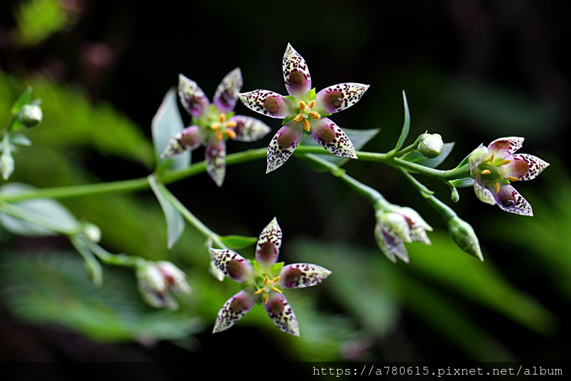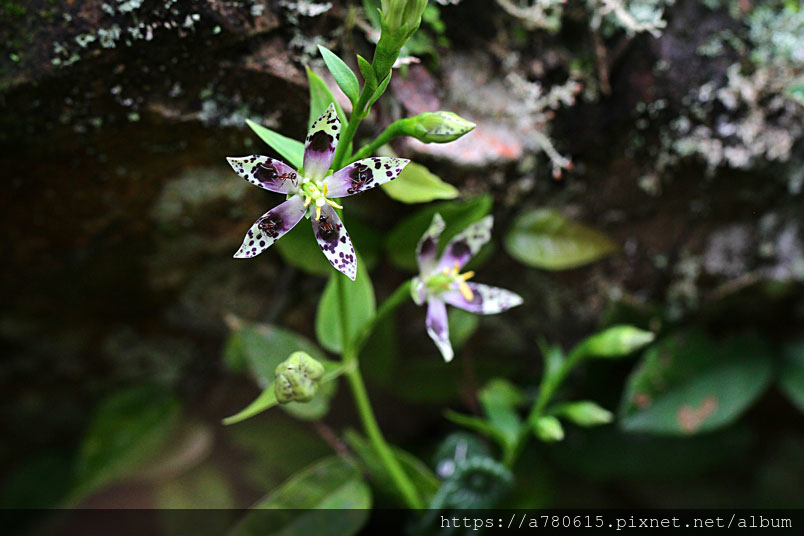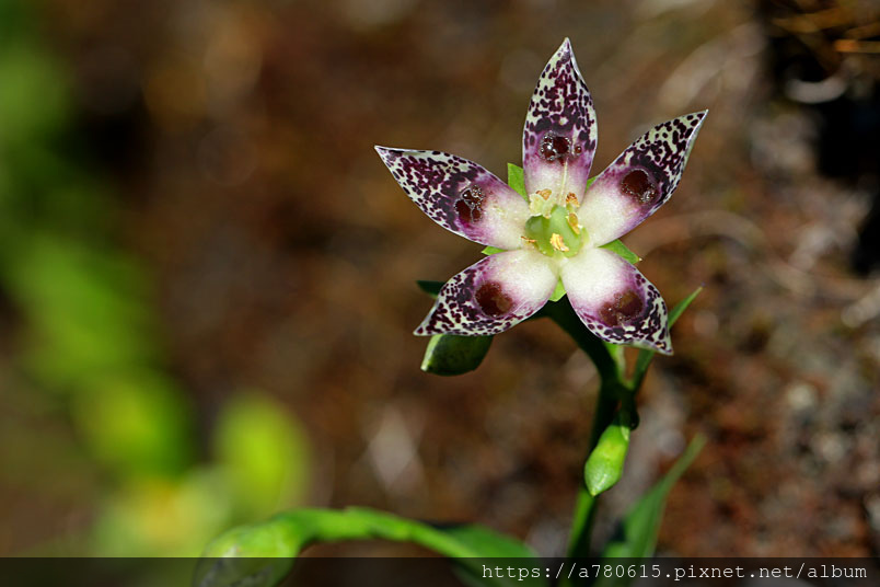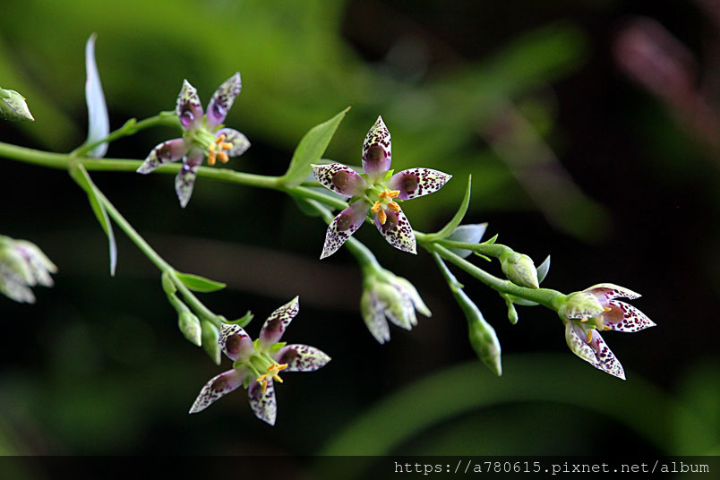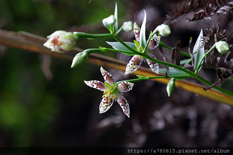 第二年抽莖開花,莖生葉無柄,可達10公分。花白底紫斑,頗為