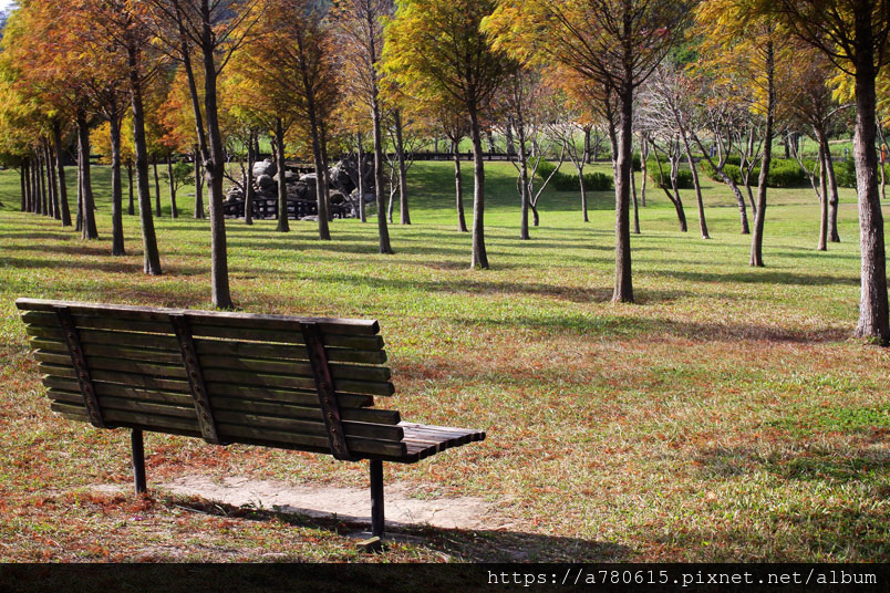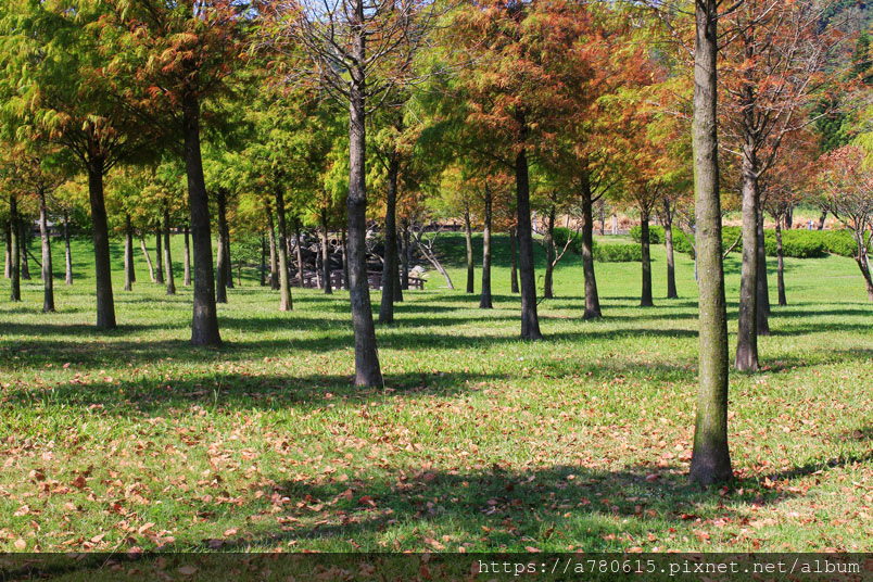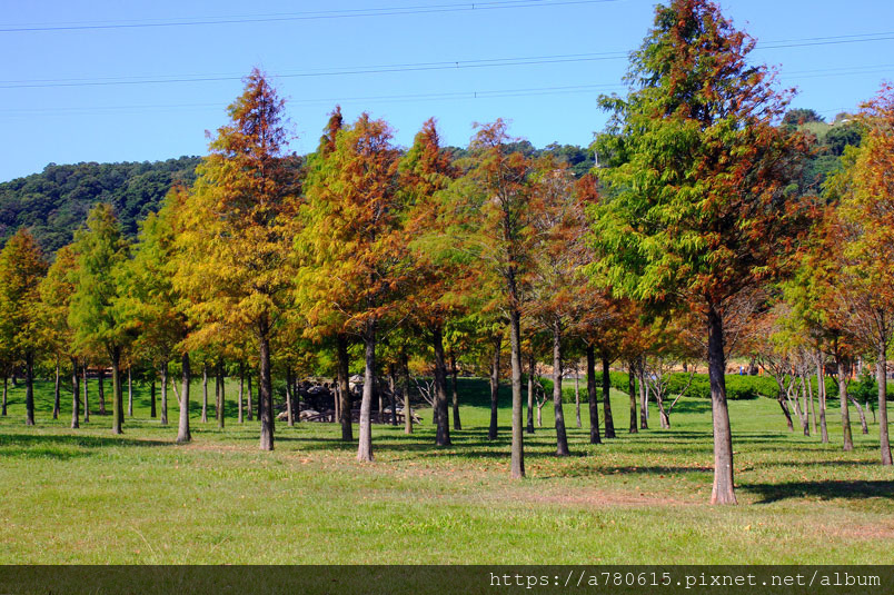 草坪上種植一排排整齊壯觀的落羽松,每到這個時節,紛紛換上
