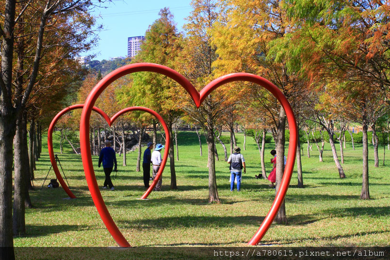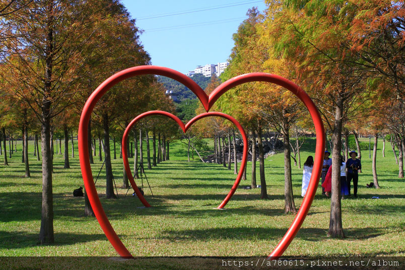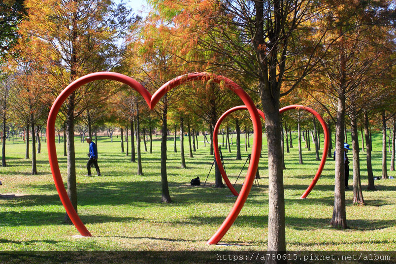 廣大草皮、上百棵落羽松、水上棧道、紅色愛心造景,讓親子族