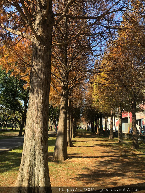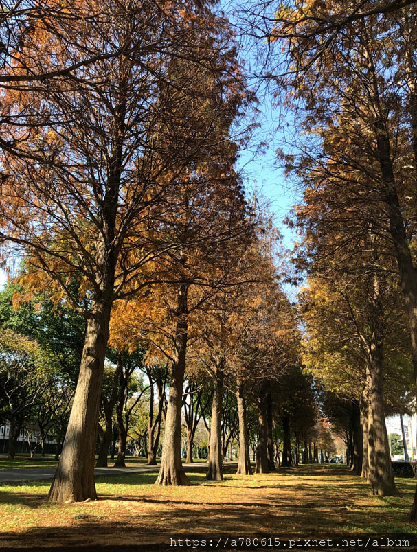 的巨大落羽松林,在寒流一波波催促下,都已變了裝。