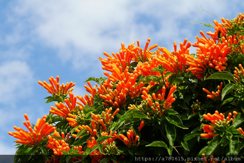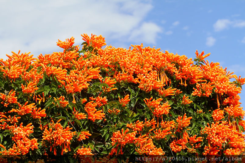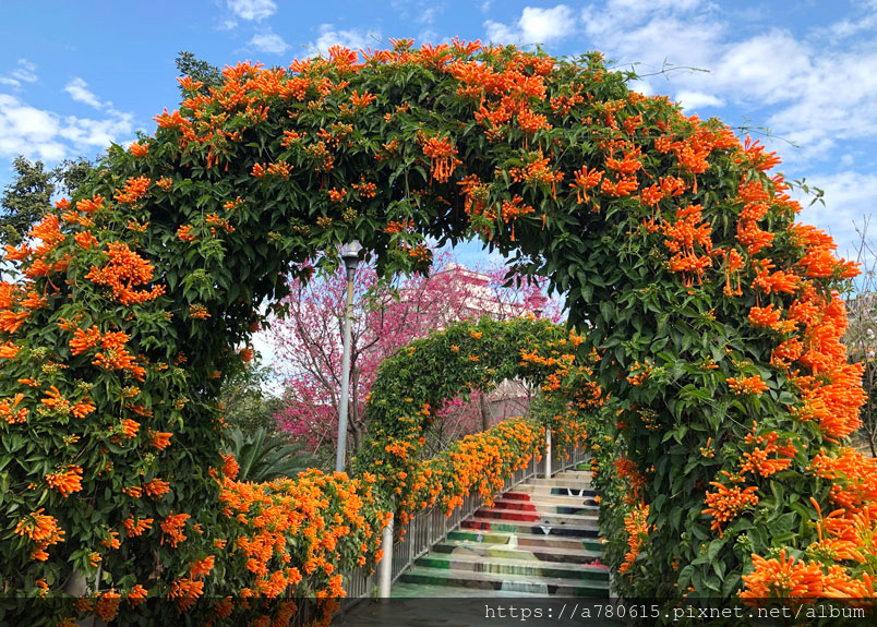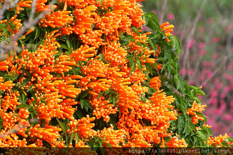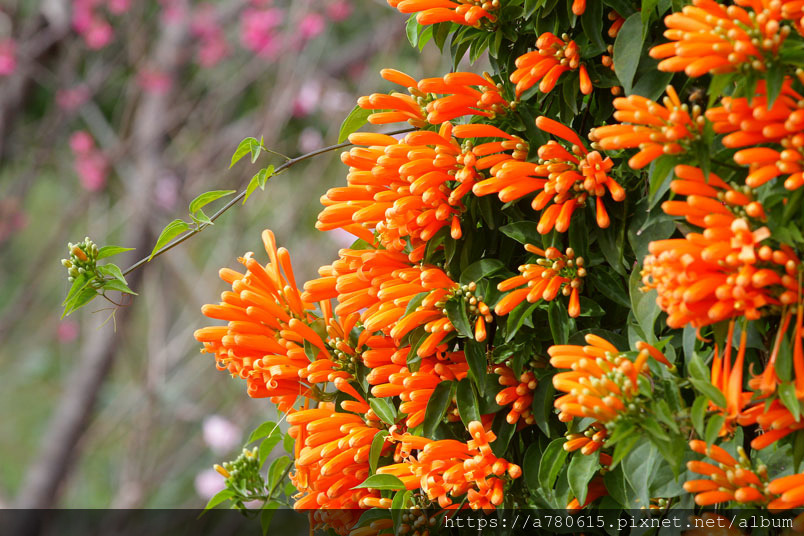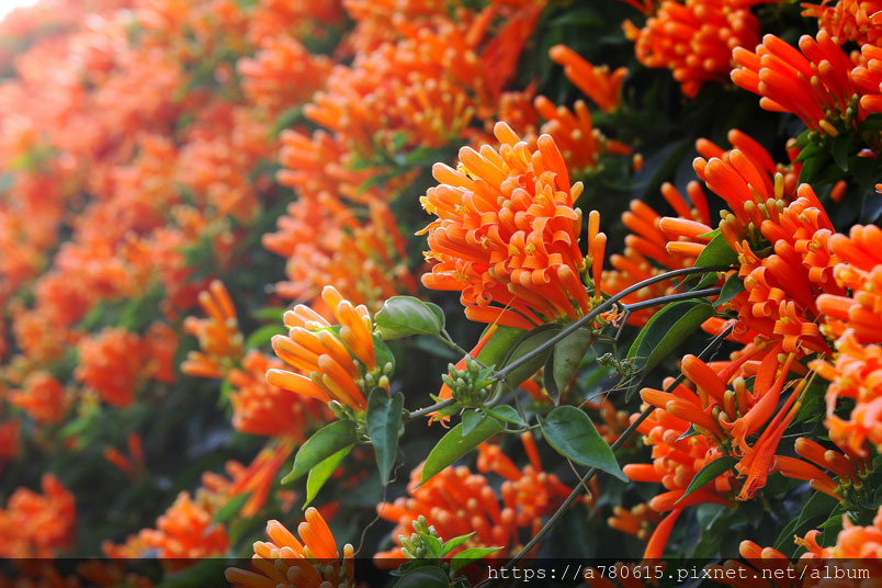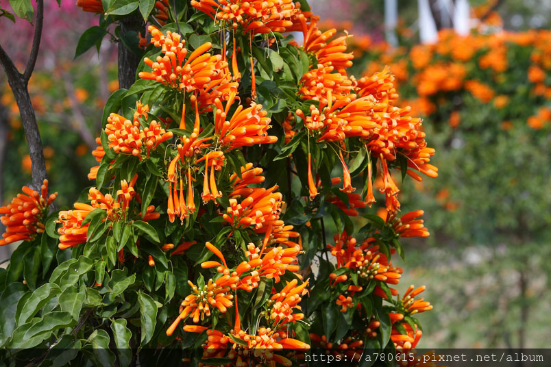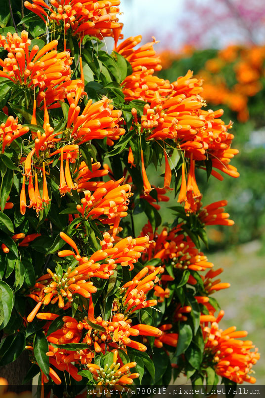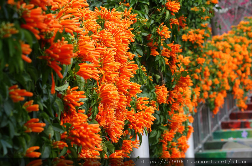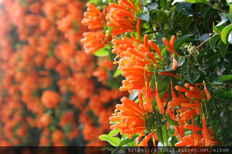 每年的春天,是炮仗花的花期,花序著生於枝梢,橙黃色筒狀花