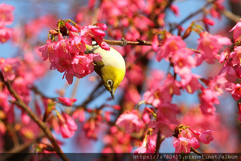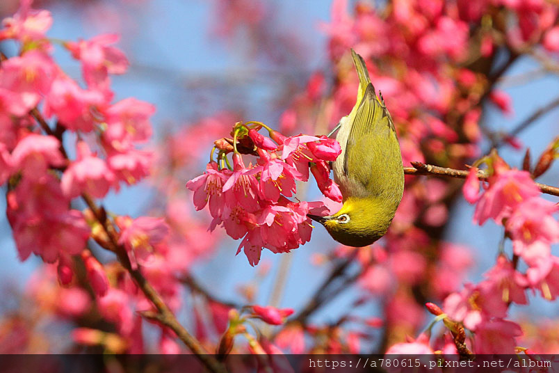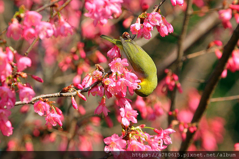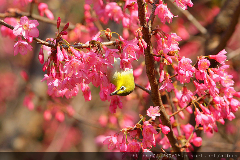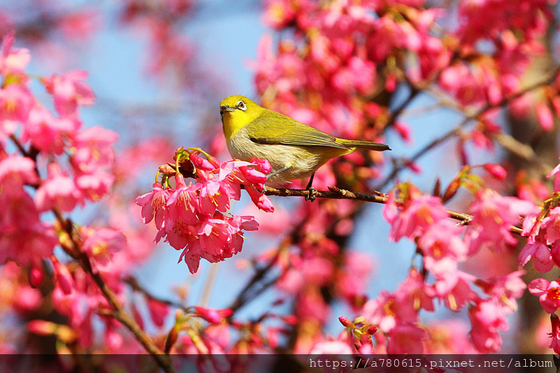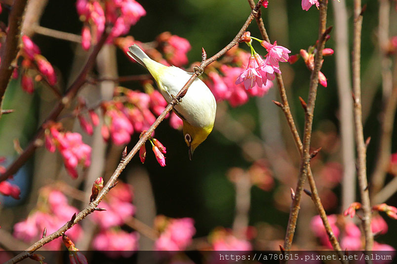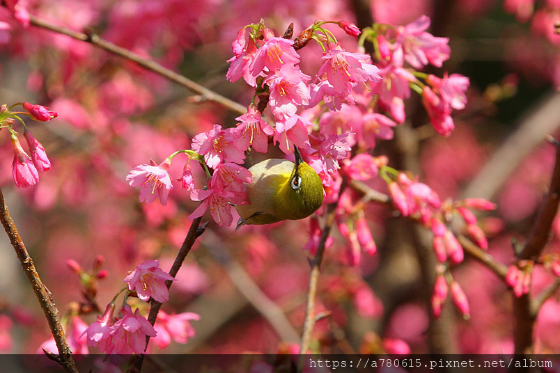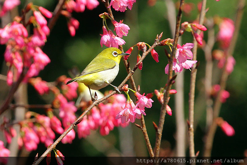 櫻紅朵朵醉酡妍,笑攬春色入眼簾。綠繡眼遊樂於春光之中,恣