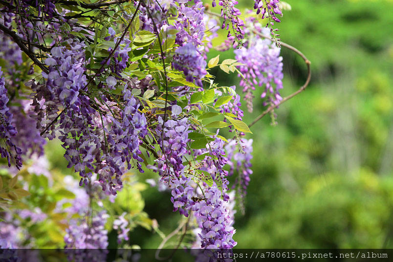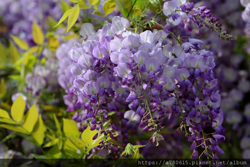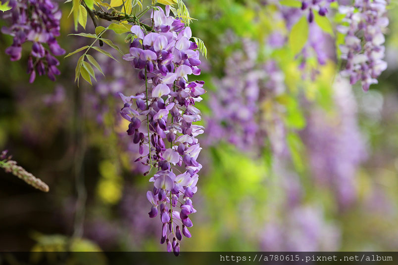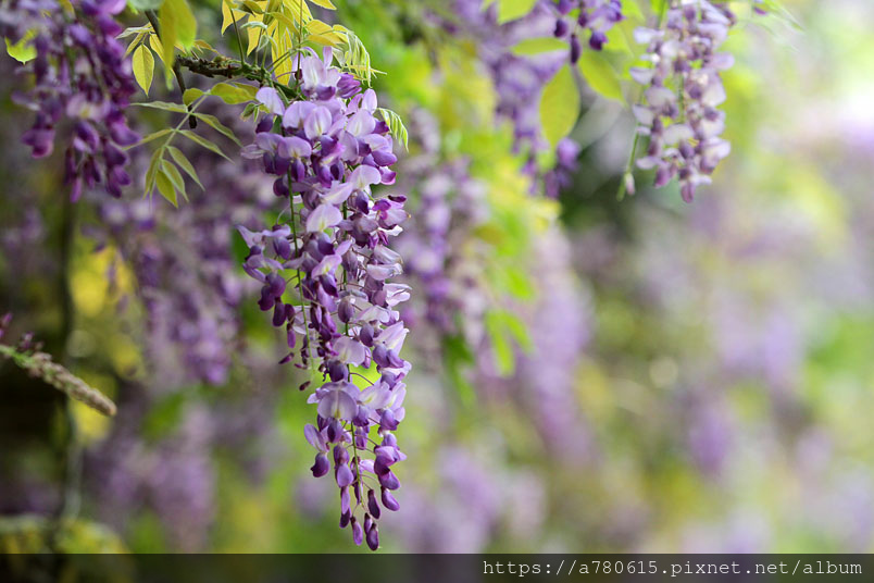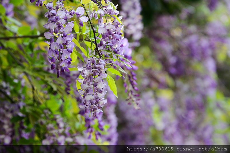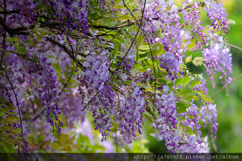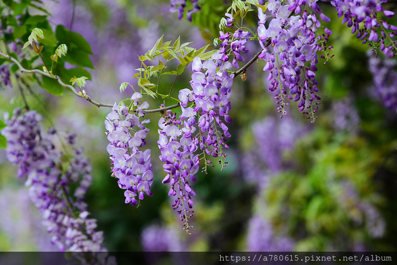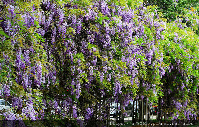 感覺這裡的紫藤花在春風吹拂下特別浪漫,紫色的花穗垂墜,彷彿