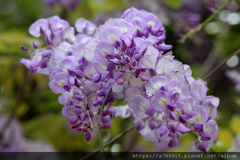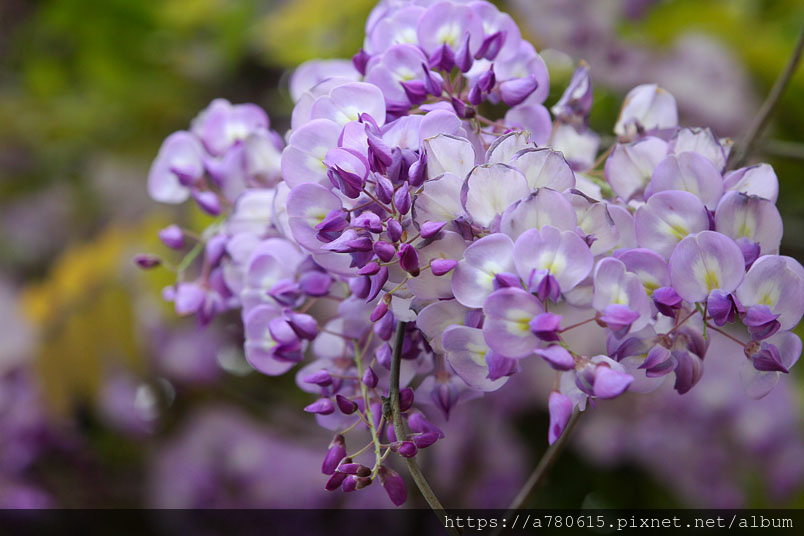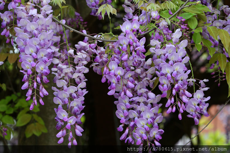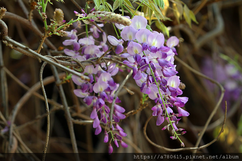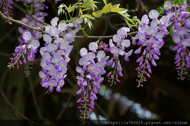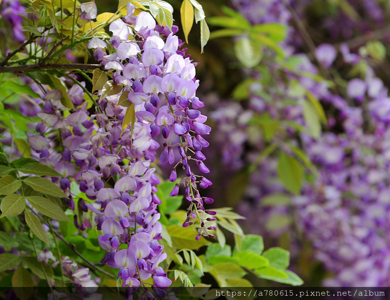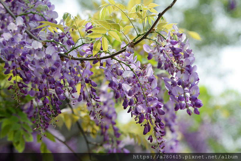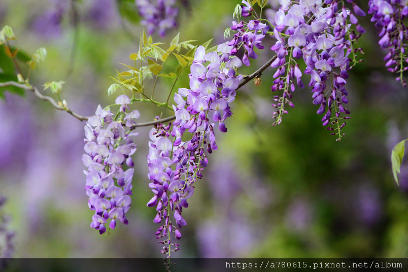 感覺這裡的紫藤花在春風吹拂下特別浪漫,紫色的花穗垂墜,彷彿