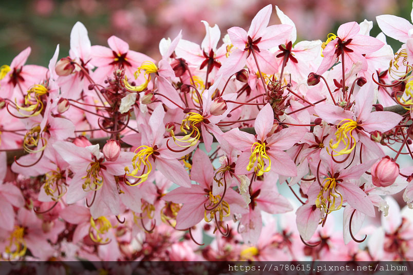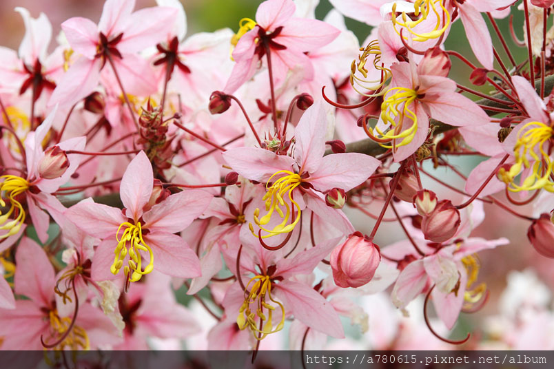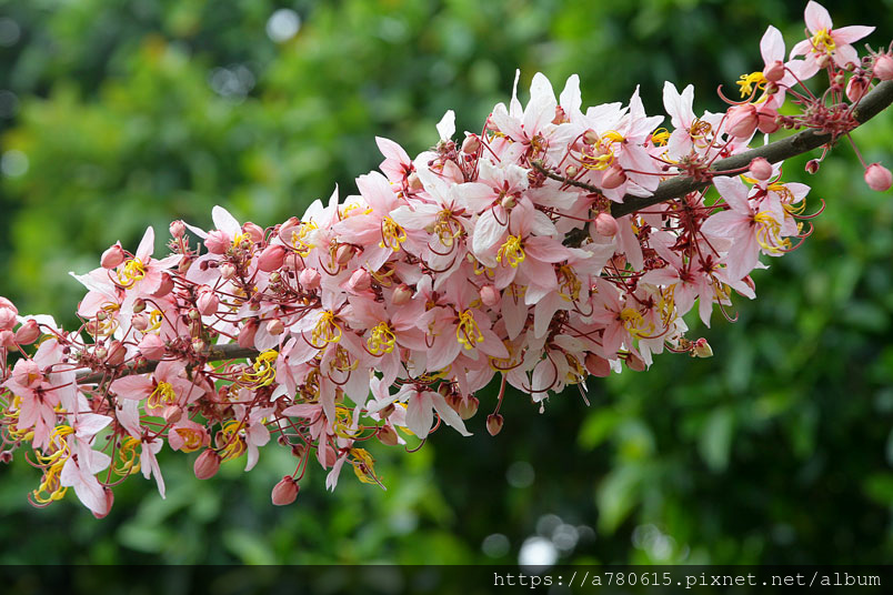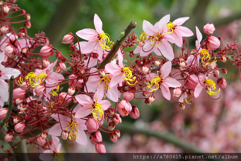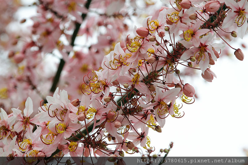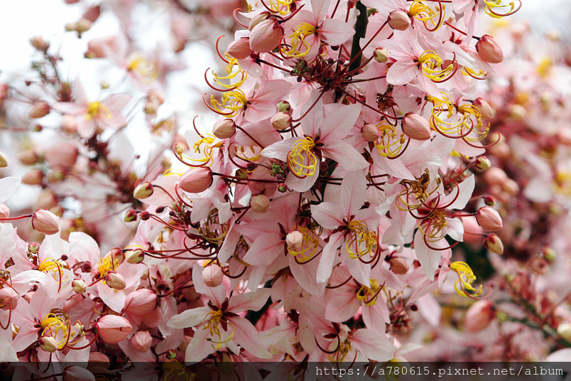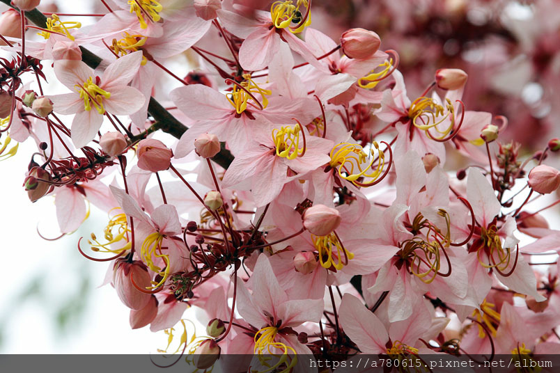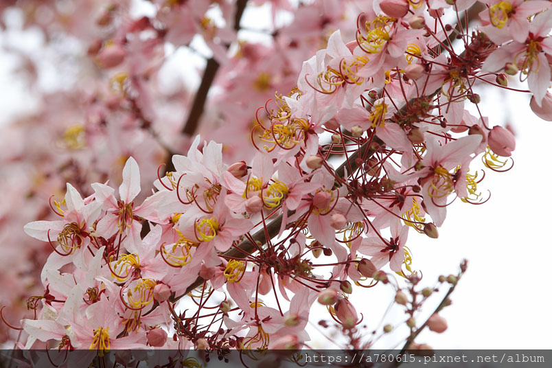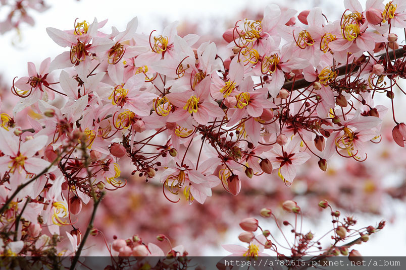 來一串一串的掛滿整樹,粉紅的花朵極為燦爛,粉紅色五片花瓣及