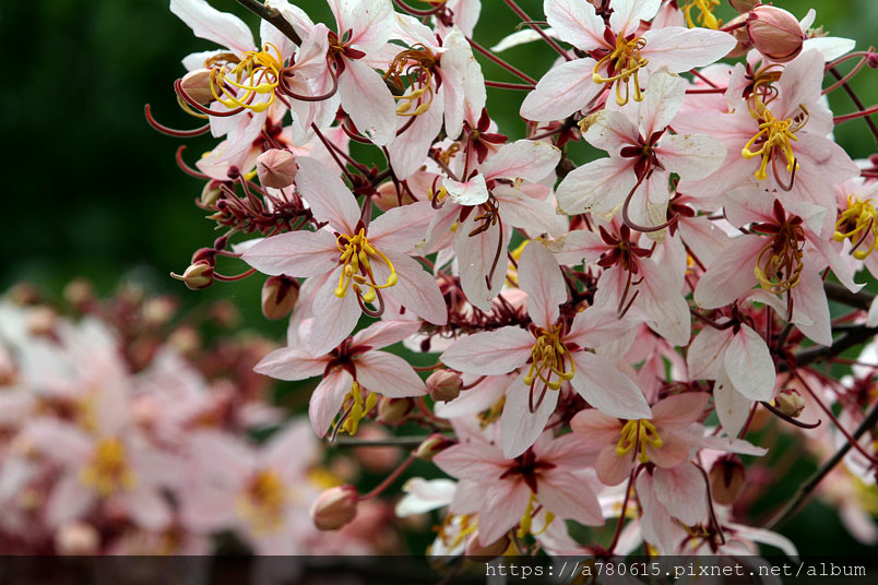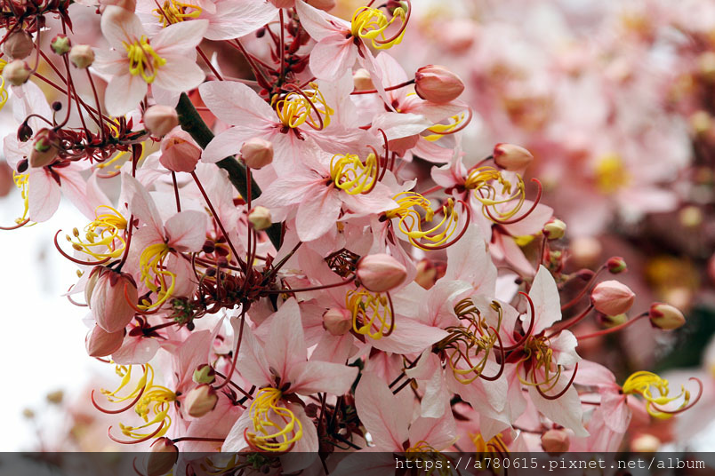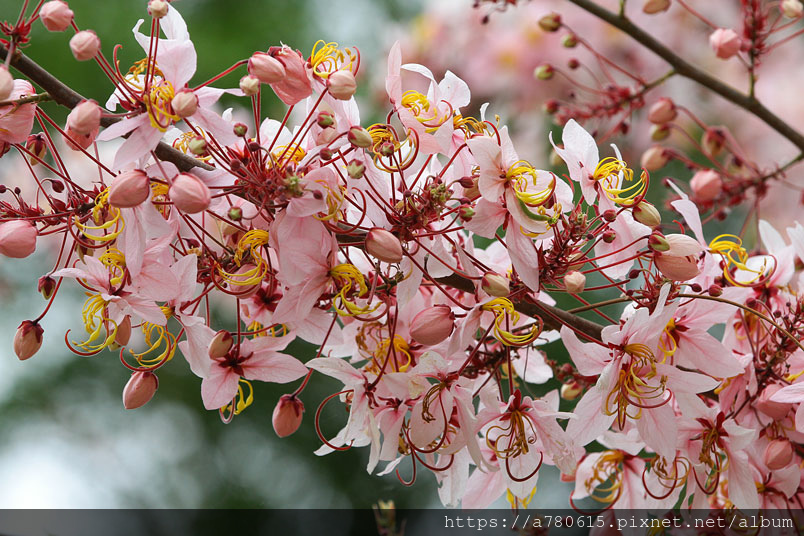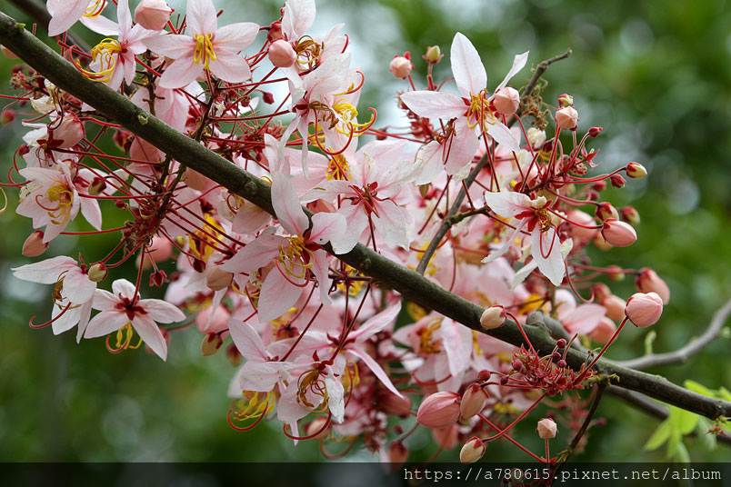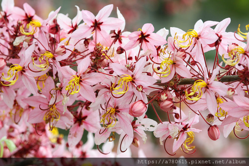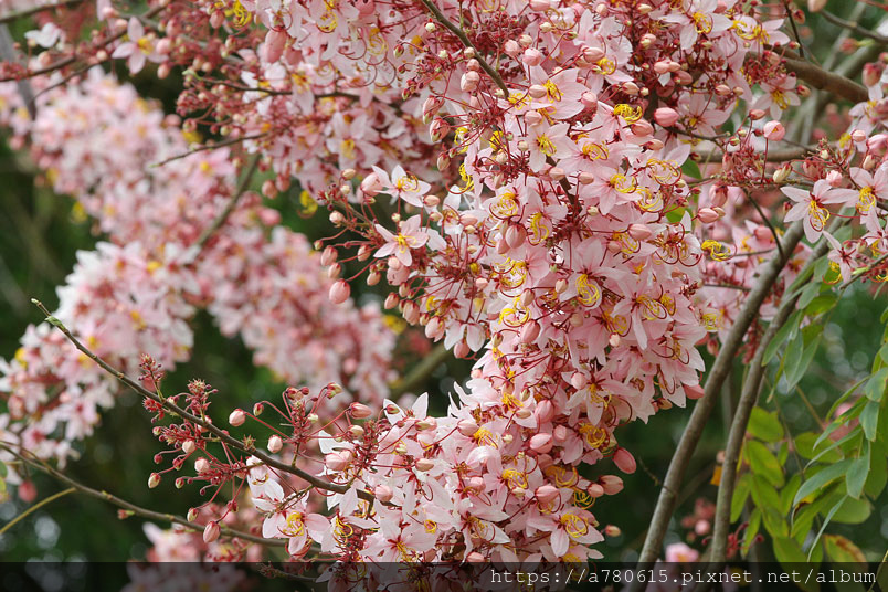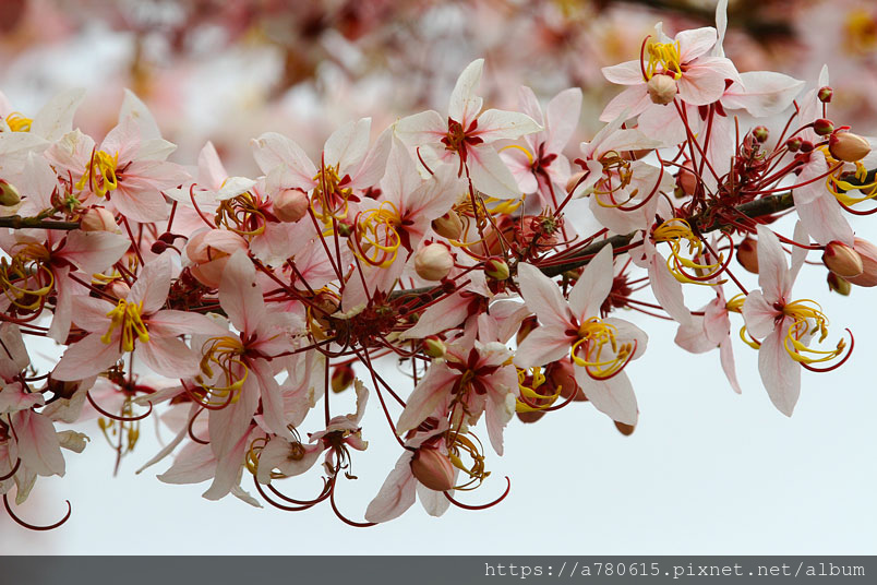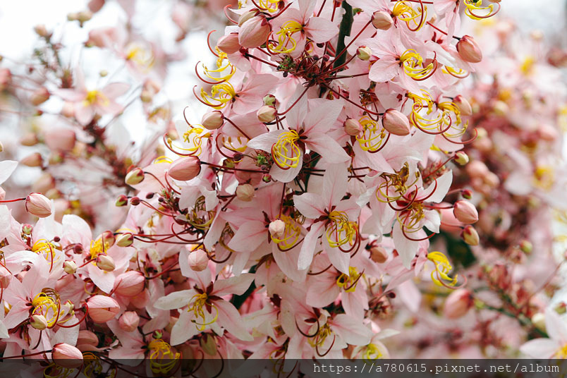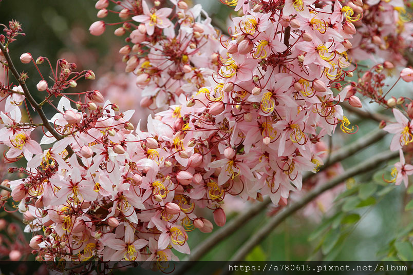 來一串一串的掛滿整樹,粉紅的花朵極為燦爛,粉紅色五片花瓣及