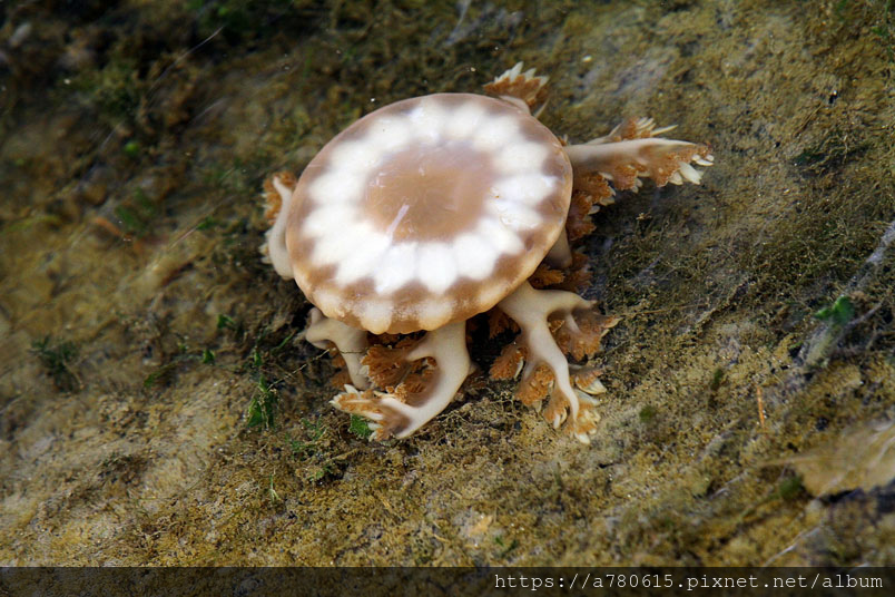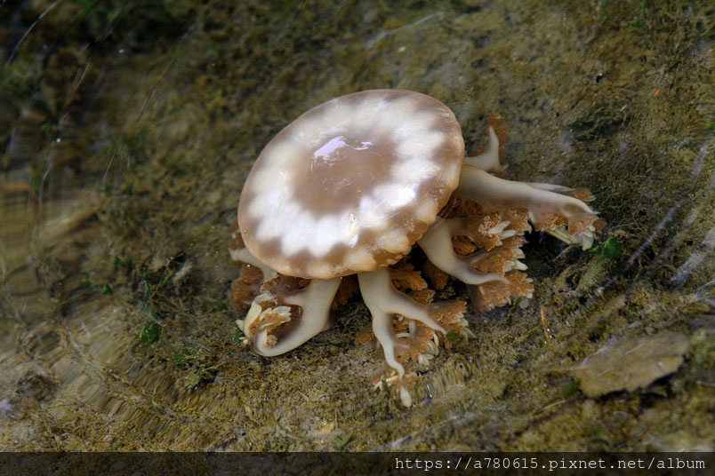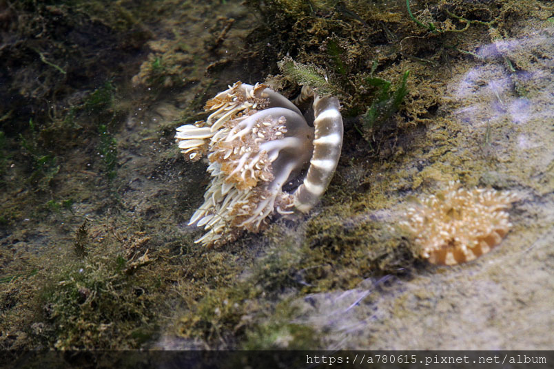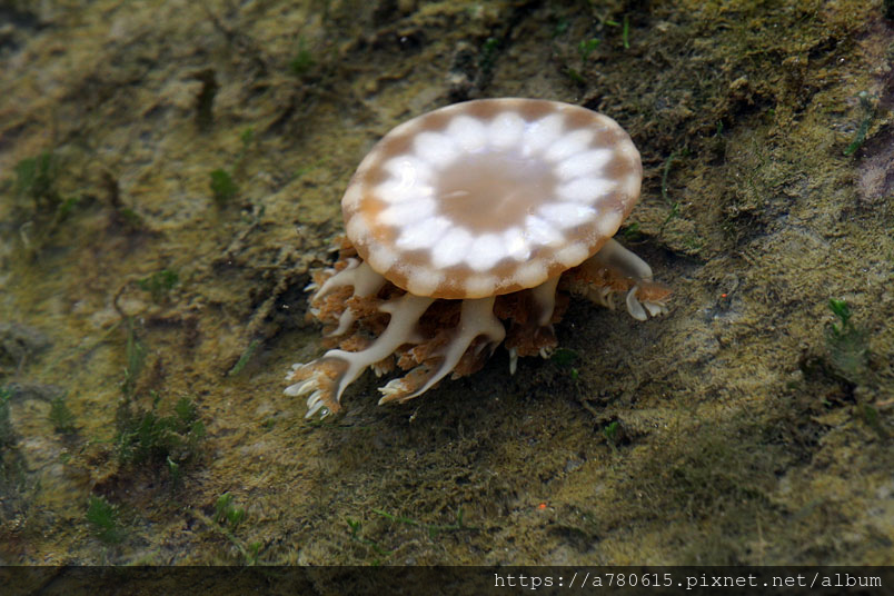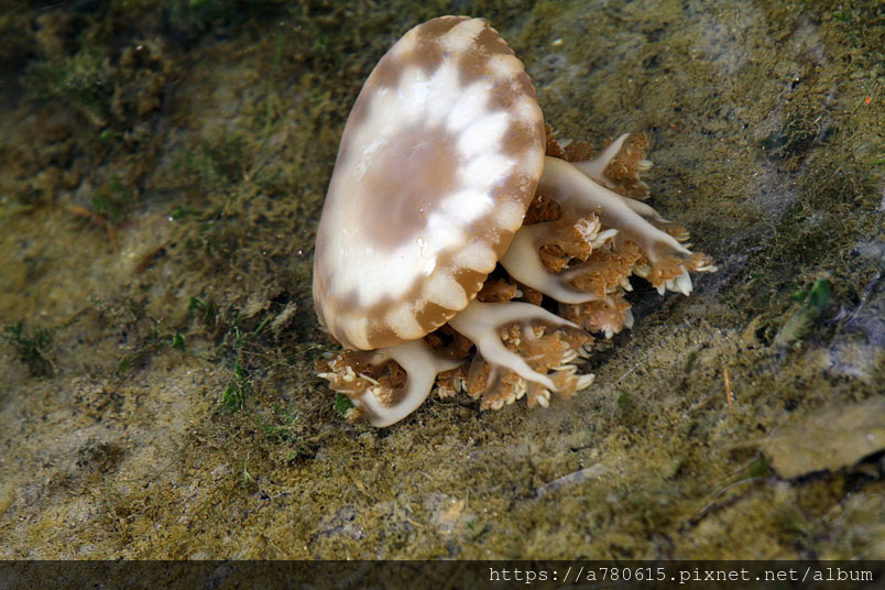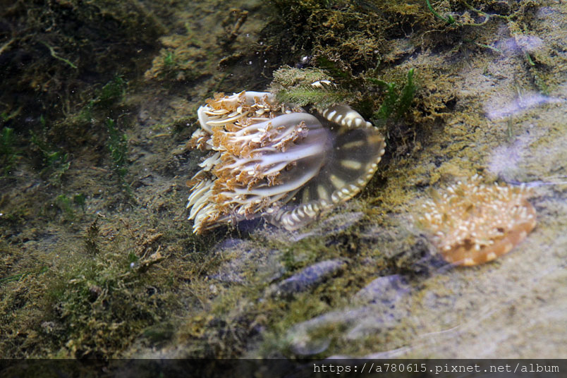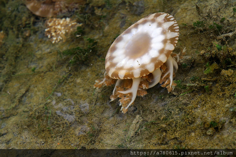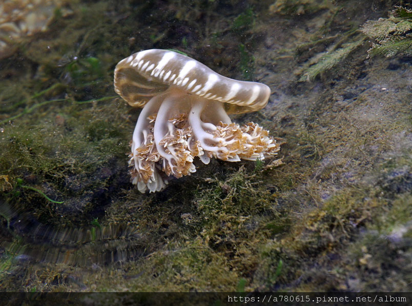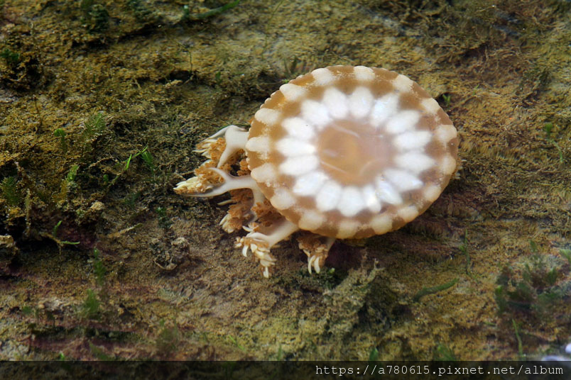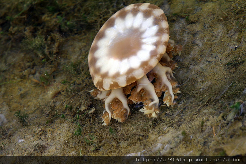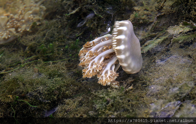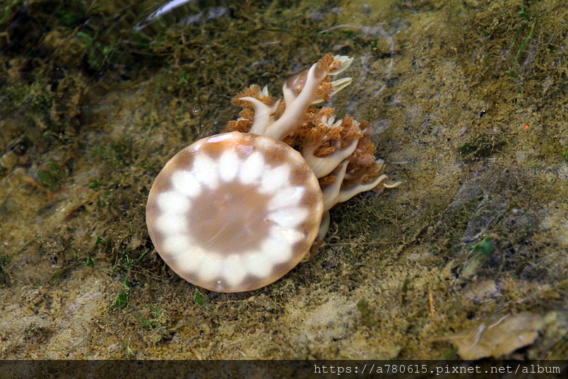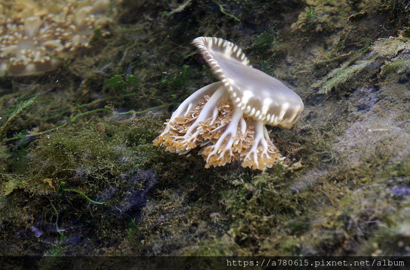 倒立水母又名為「仙后水母」,因與藻類共生,經由不同種的藻類