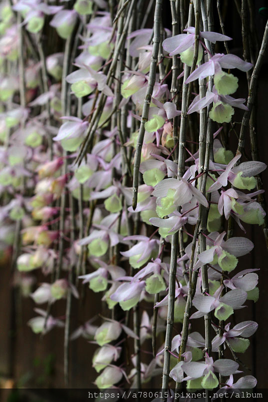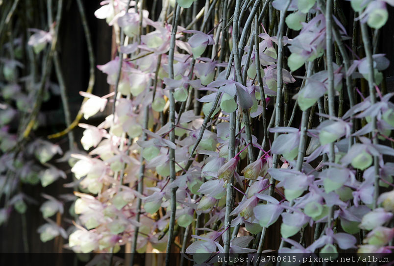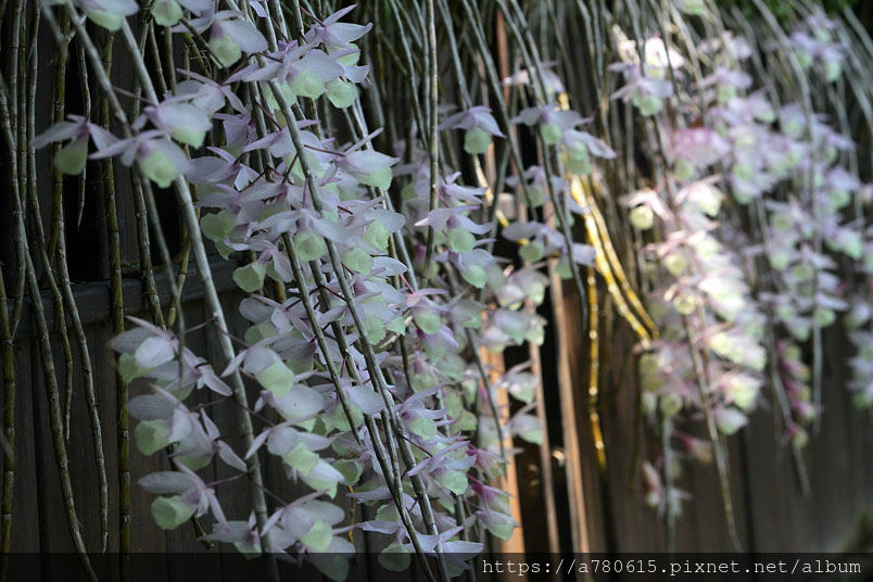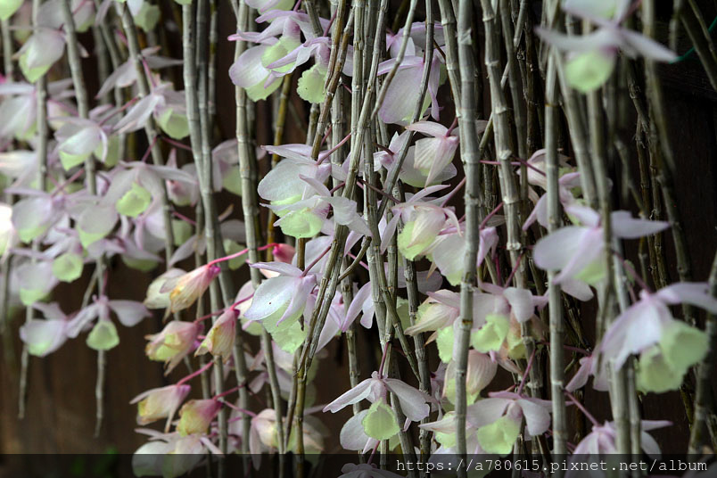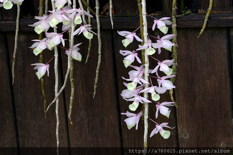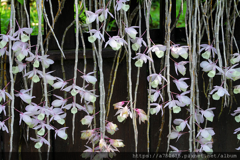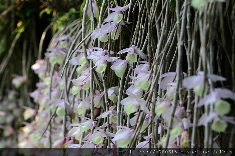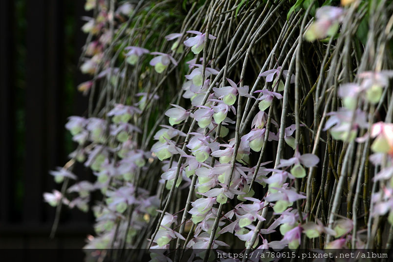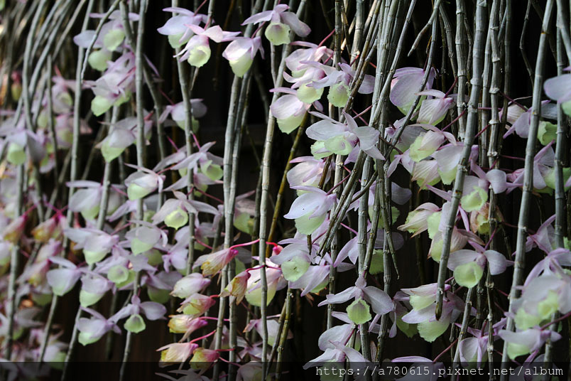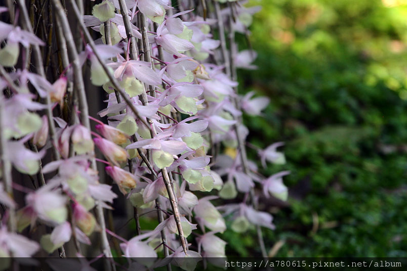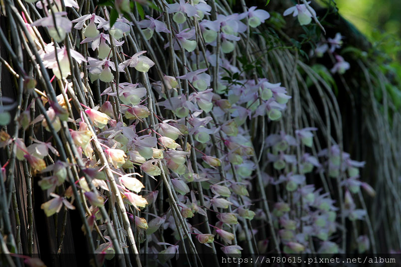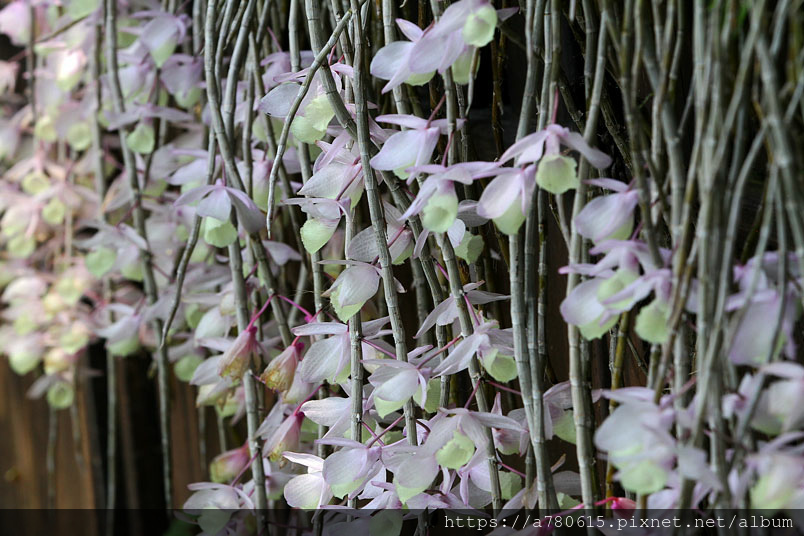 天宮石斛有瀑布蘭、倒吊蘭之稱,開花時,粉色花朵一串串垂墜下