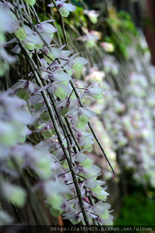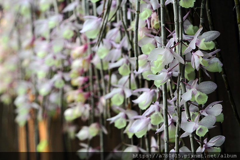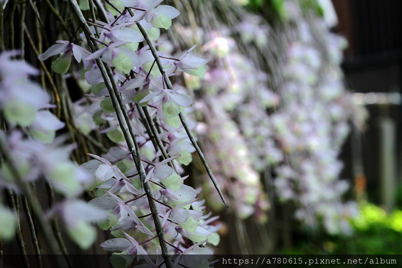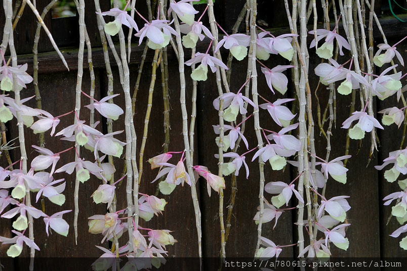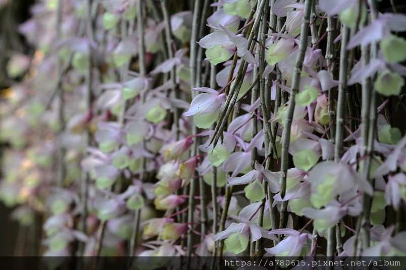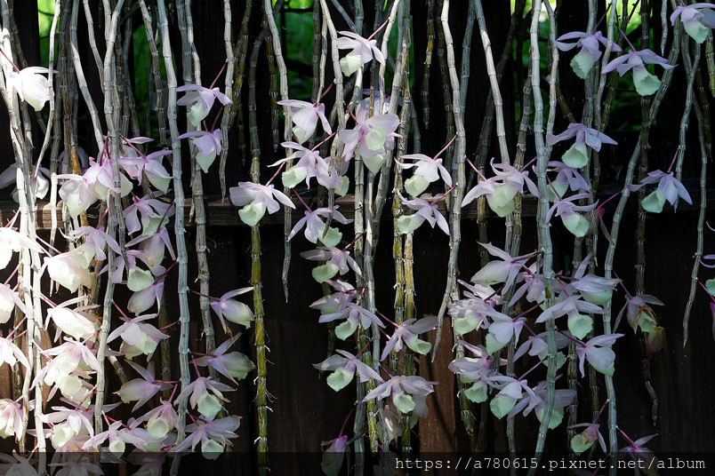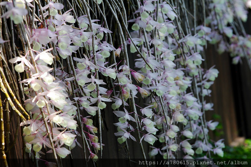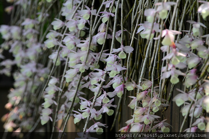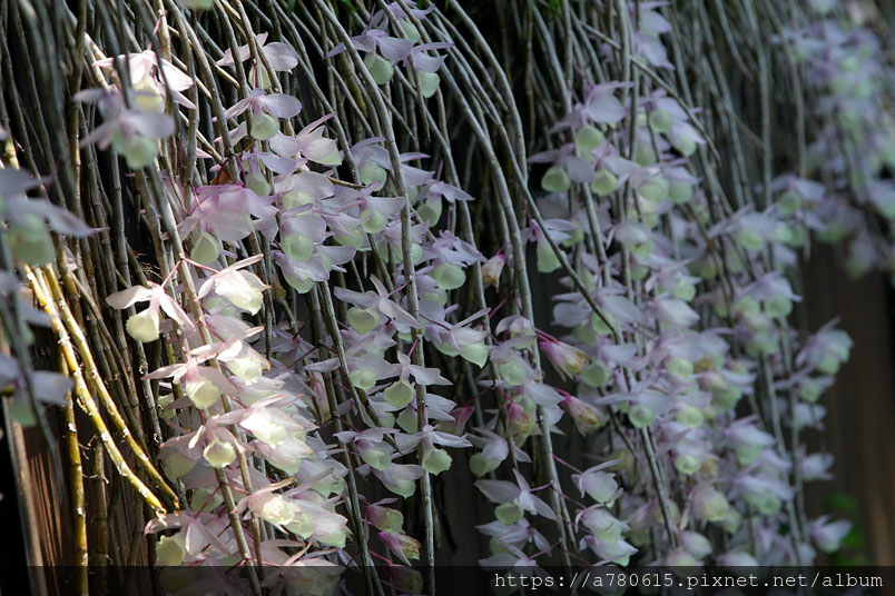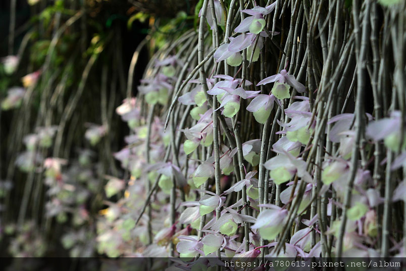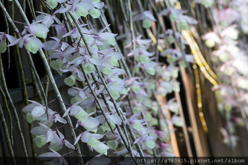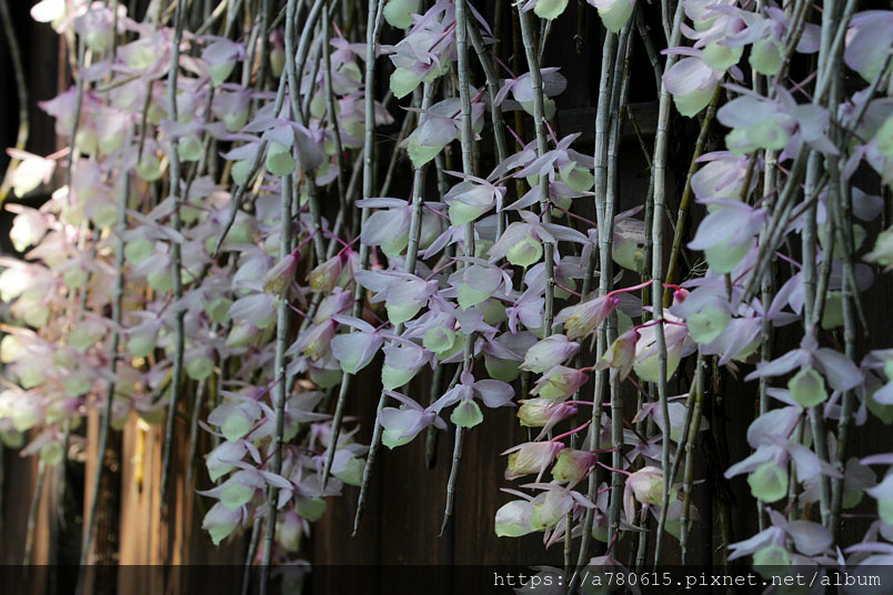 天宮石斛有瀑布蘭、倒吊蘭之稱,開花時,粉色花朵一串串垂墜下