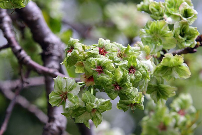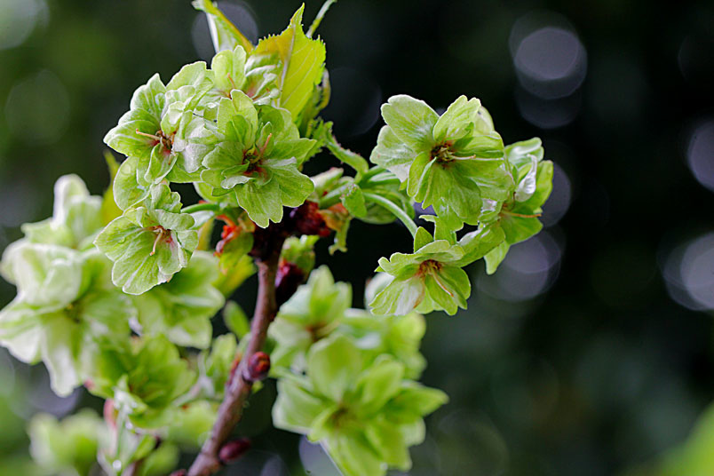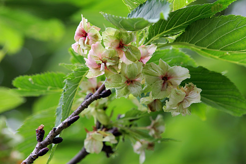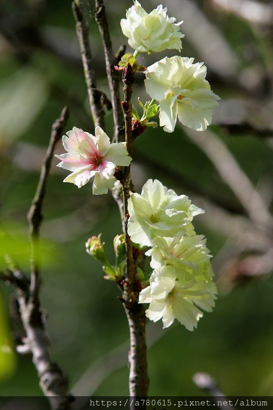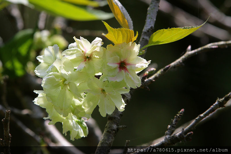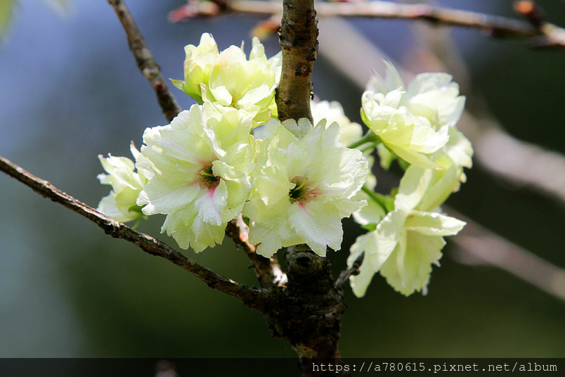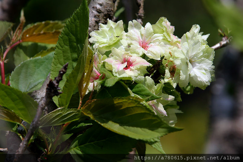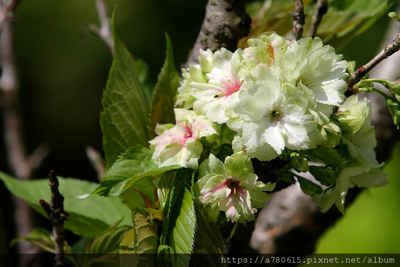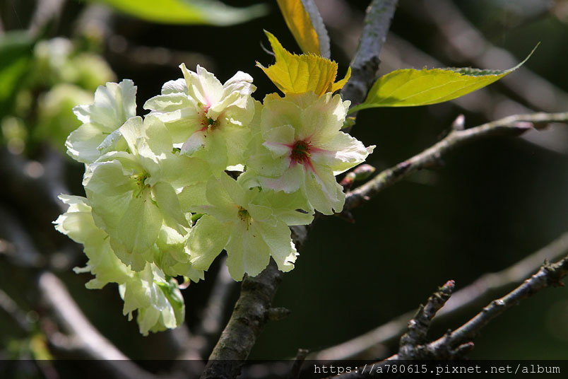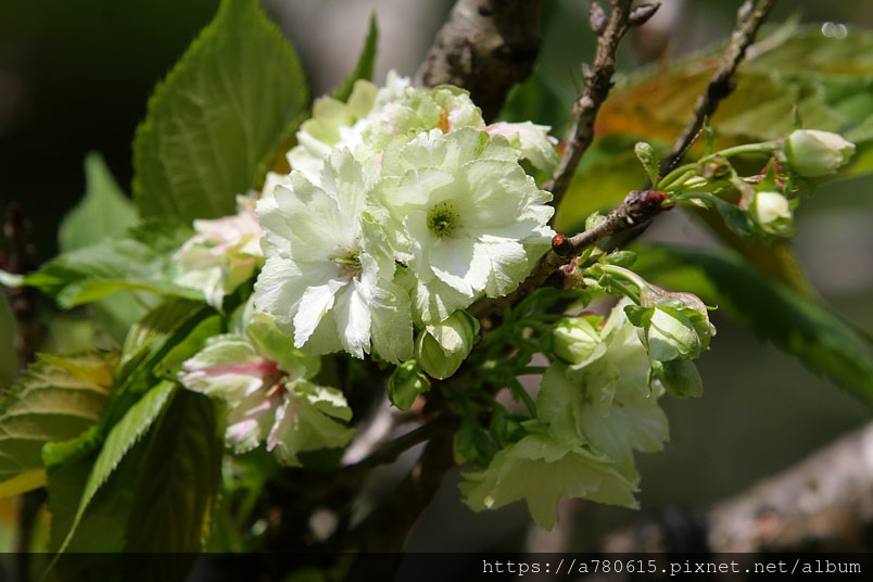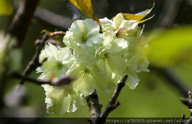 這綠色的櫻花,是八重櫻的品種之一,花朵盛開時花瓣帶有捲邊是