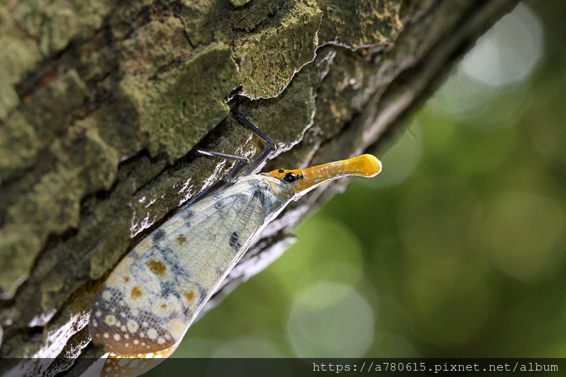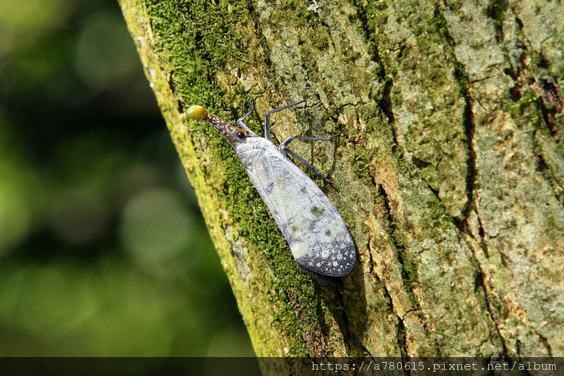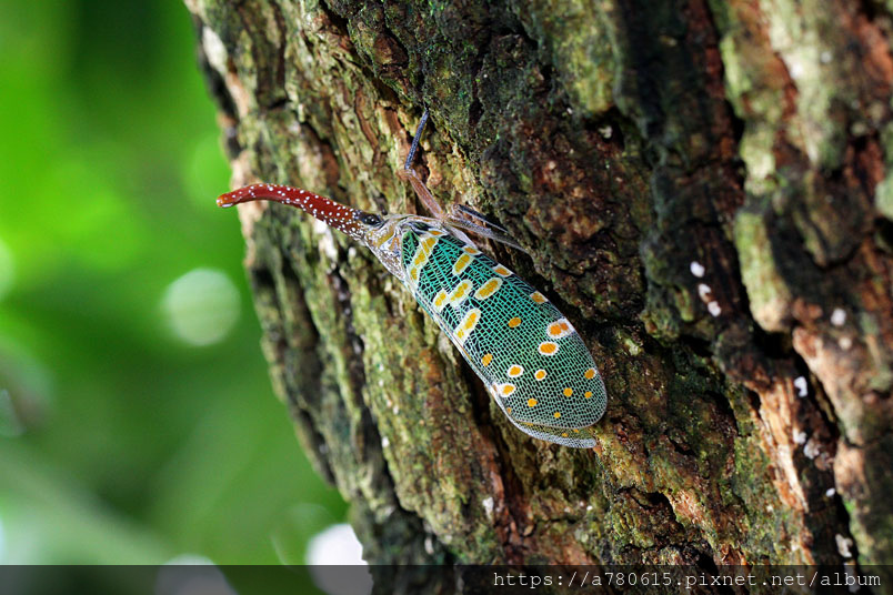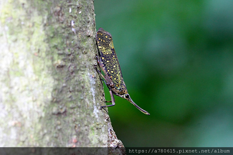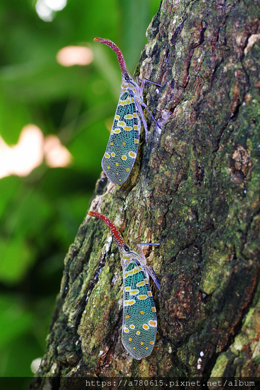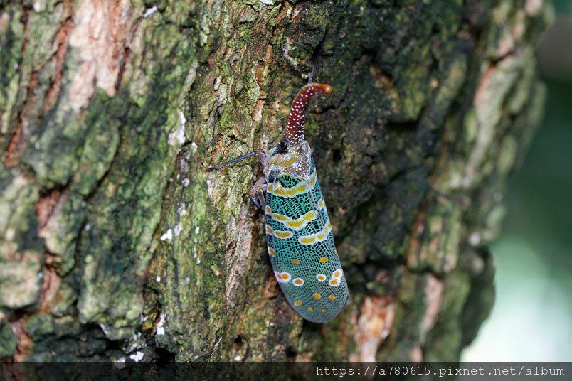 龍眼雞,半翅目,蠟蟬科。體長 37-42 mm,體色艷麗。頭額向前